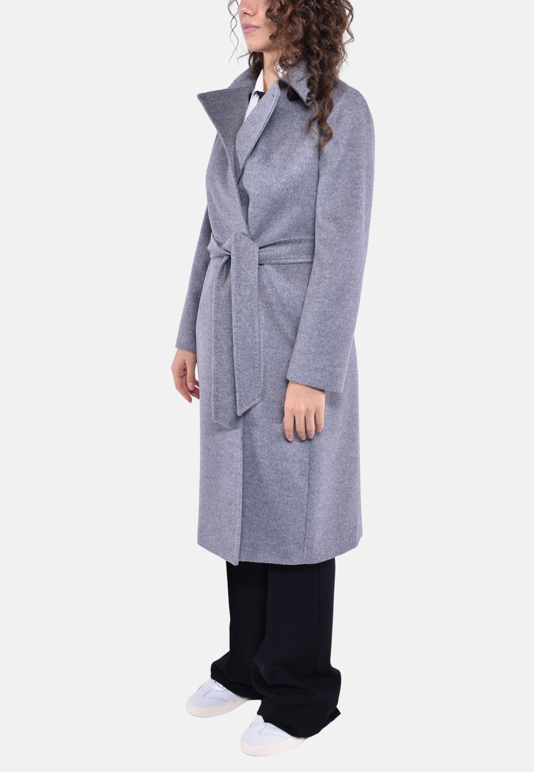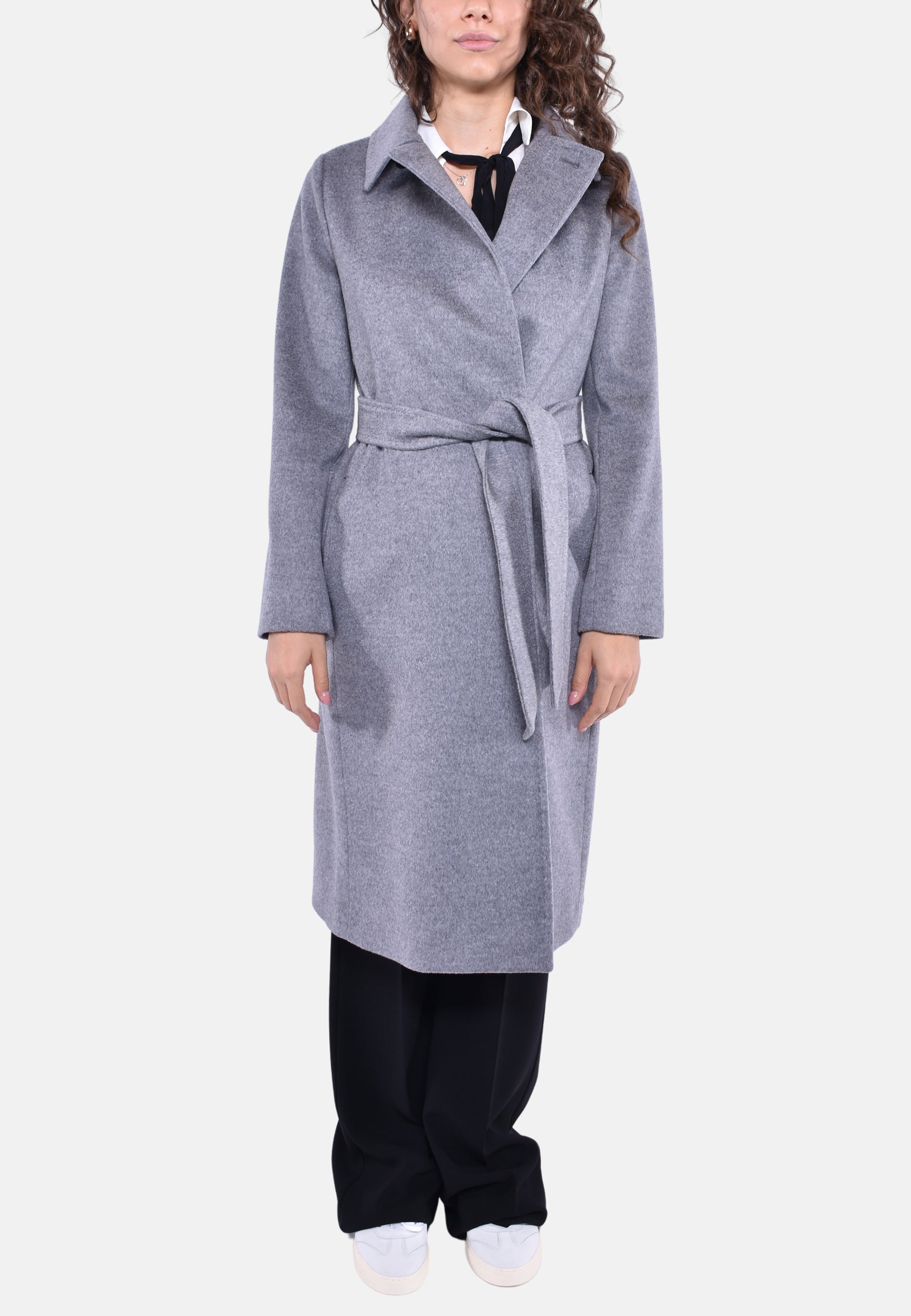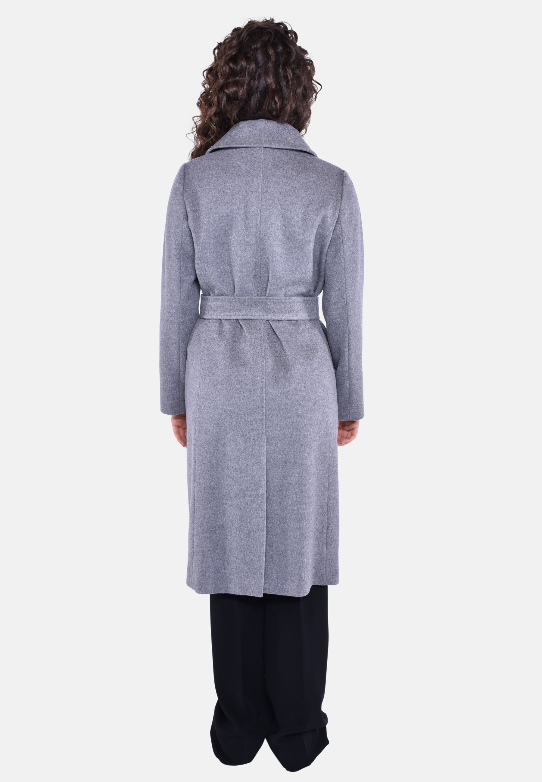 Cappotto doppiopetto lungo d'ispirazione vestaglia realizzato in pregiato drap di pura lana con maniche lunghe, tasche sui fianchi e bottoni nascosti con cintura abbinata in vita. Il design è caratterizzato da colletto a punta doppio uso da portare aperto con rever o chiuso con bottone. Foderato.