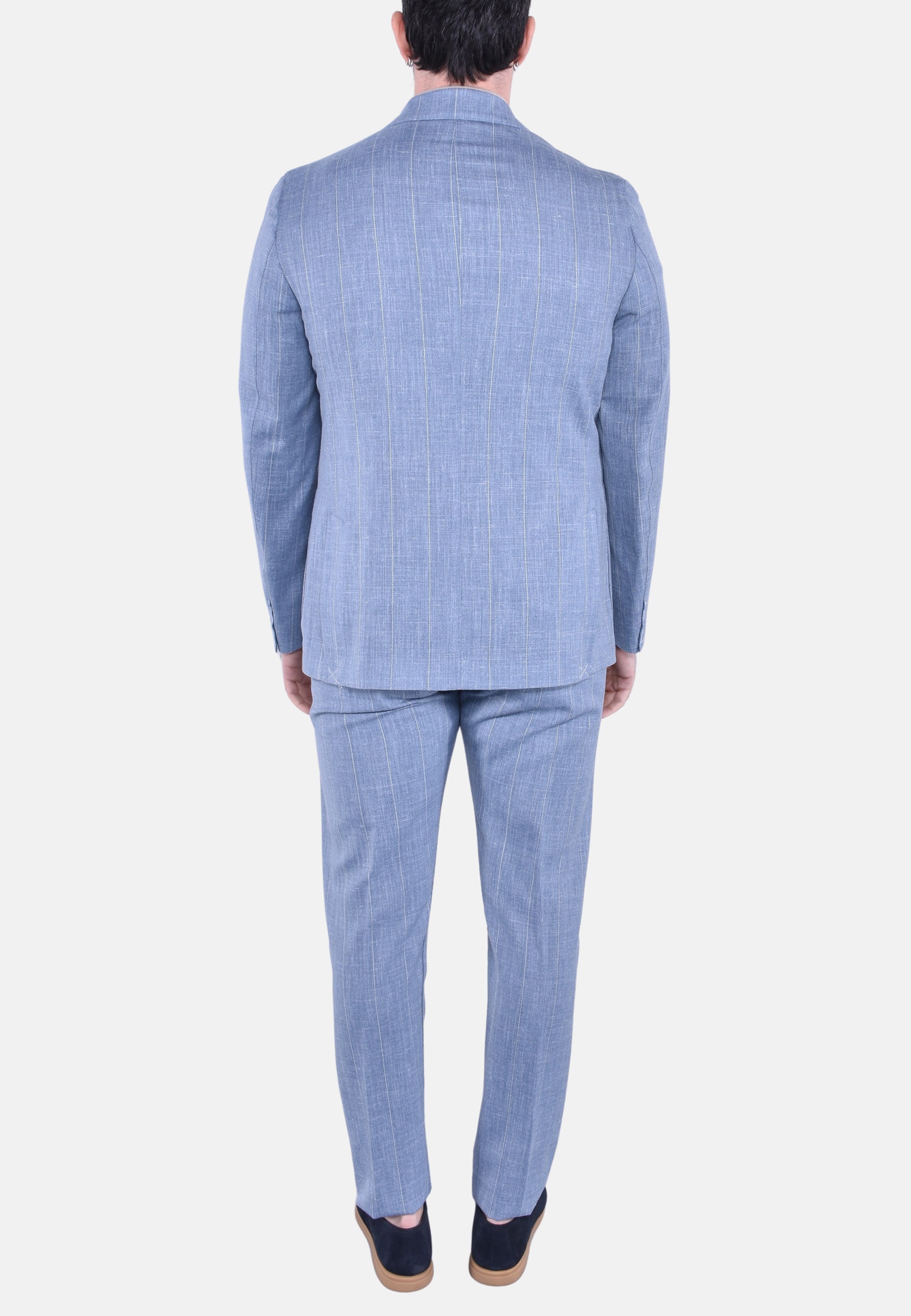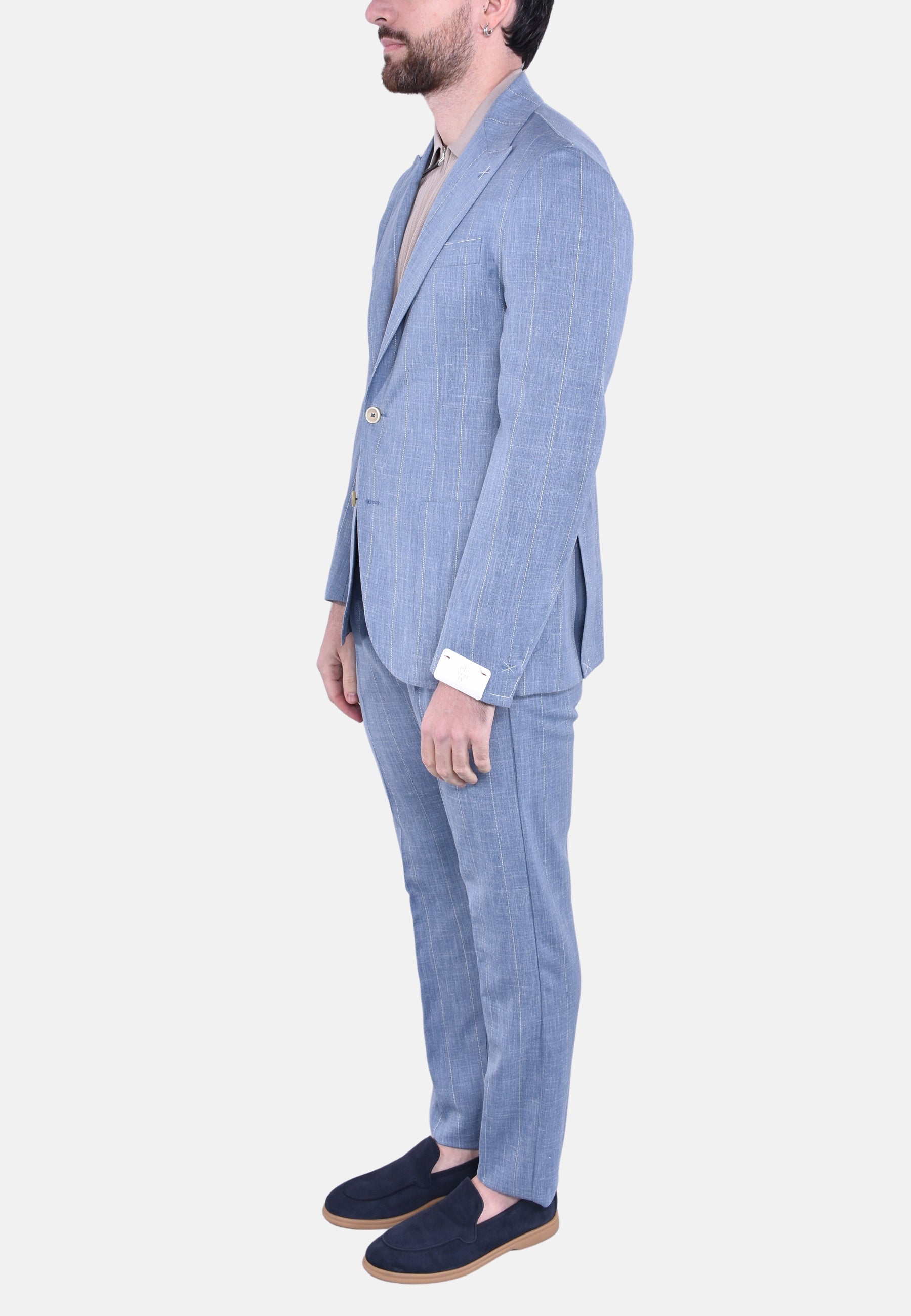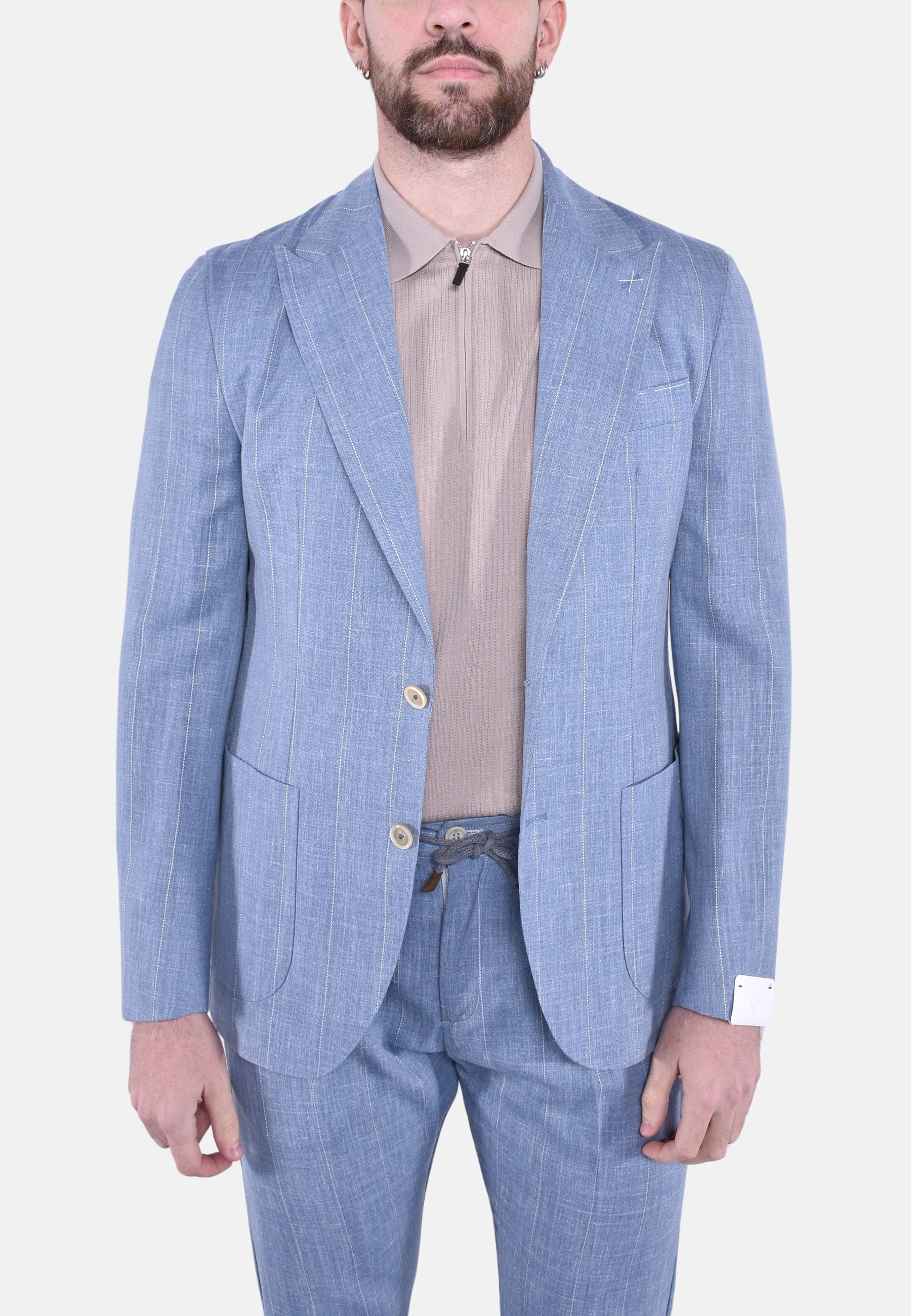 L'abito monopetto con giacca soft e pantalone jogger è realizzato in tessuto “summer time” di Loro Piana, che deriva da un sapiente blend di lana seta e lino dosati per enfatizzare la qualità delle singole fibre. L’insieme di queste fibre permette la creazione di tessuti innovativi, raffinati e in linea con l’esigenza del vestire contemporaneo. La disegnatura gessata, esclusivamente studiata per Eleventy, ricorda le sfumature di colori polverose e naturali, presenti in collezione. La vestibilità segue il nuovo trend di stagione, caratterizzato da una silhouette vicina al corpo per esaltare la fisicità maschile.