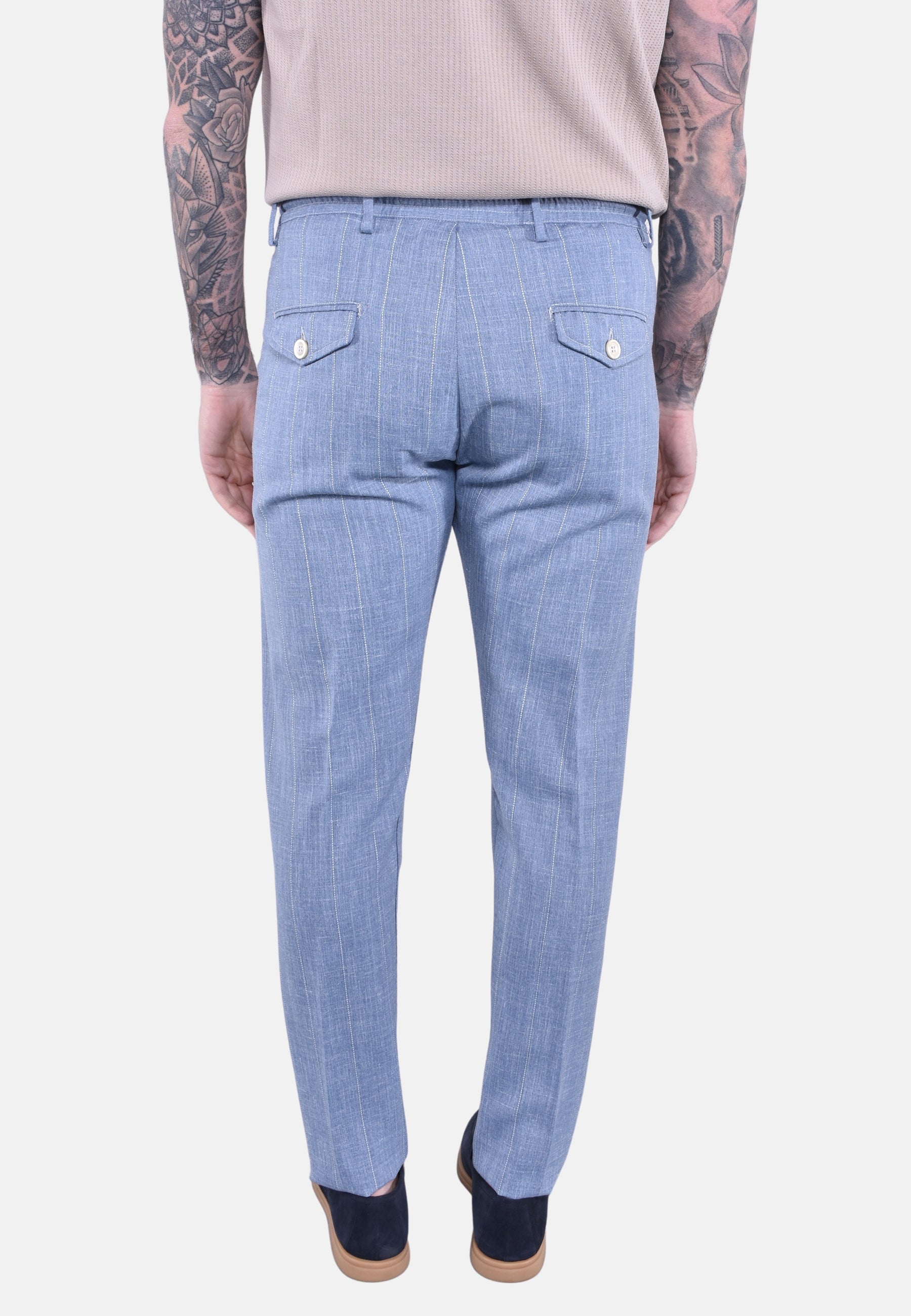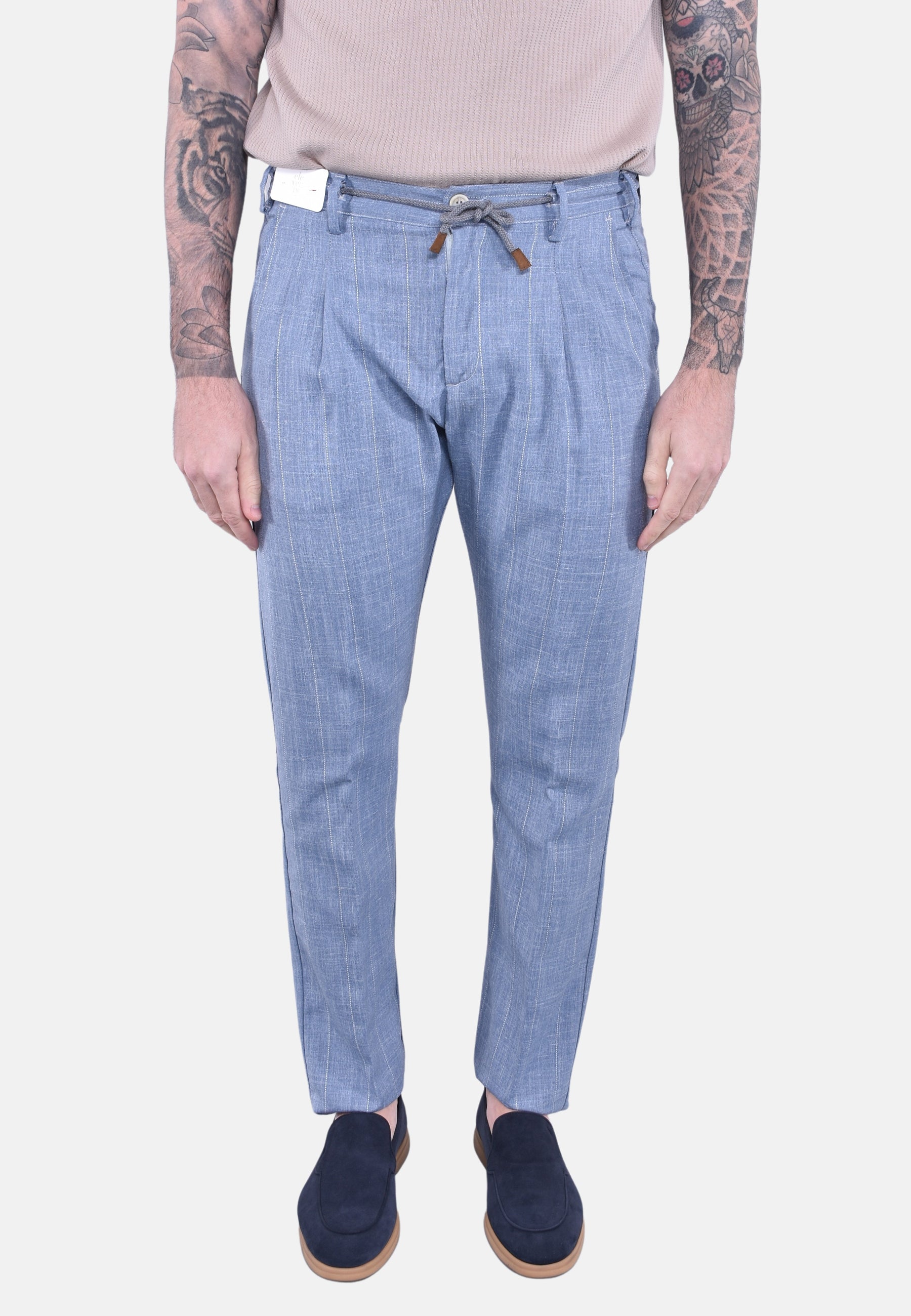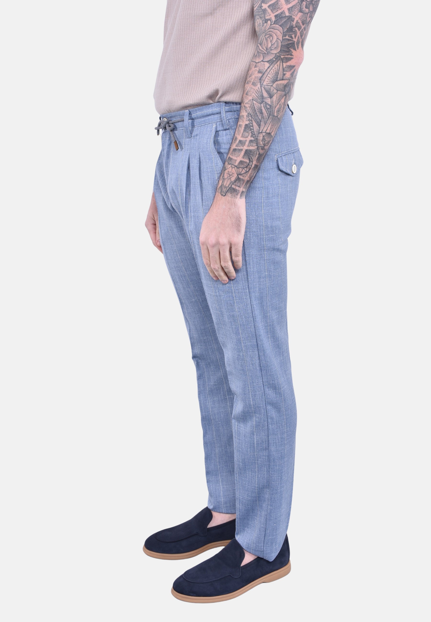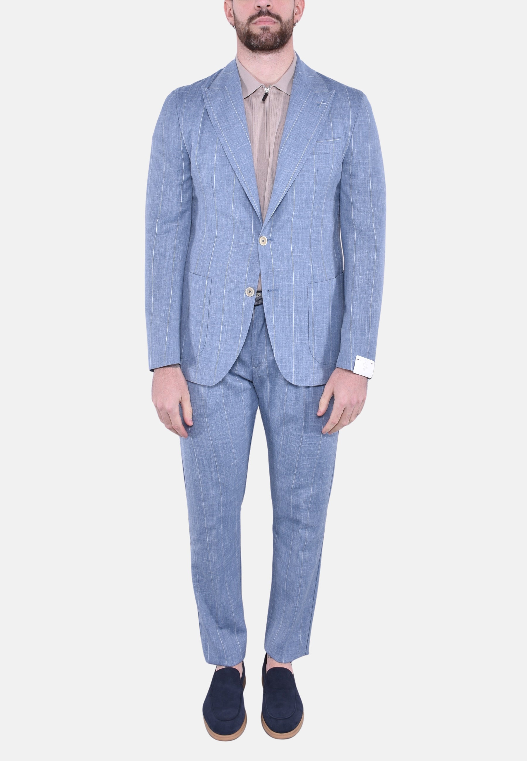 L'abito monopetto con giacca soft e pantalone jogger è realizzato in tessuto “summer time” di Loro Piana, che deriva da un sapiente blend di lana seta e lino dosati per enfatizzare la qualità delle singole fibre. L’insieme di queste fibre permette la creazione di tessuti innovativi, raffinati e in linea con l’esigenza del vestire contemporaneo. La disegnatura gessata, esclusivamente studiata per Eleventy, ricorda le sfumature di colori polverose e naturali, presenti in collezione. La vestibilità segue il nuovo trend di stagione, caratterizzato da una silhouette vicina al corpo per esaltare la fisicità maschile.