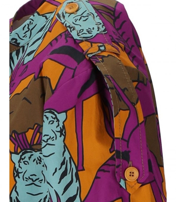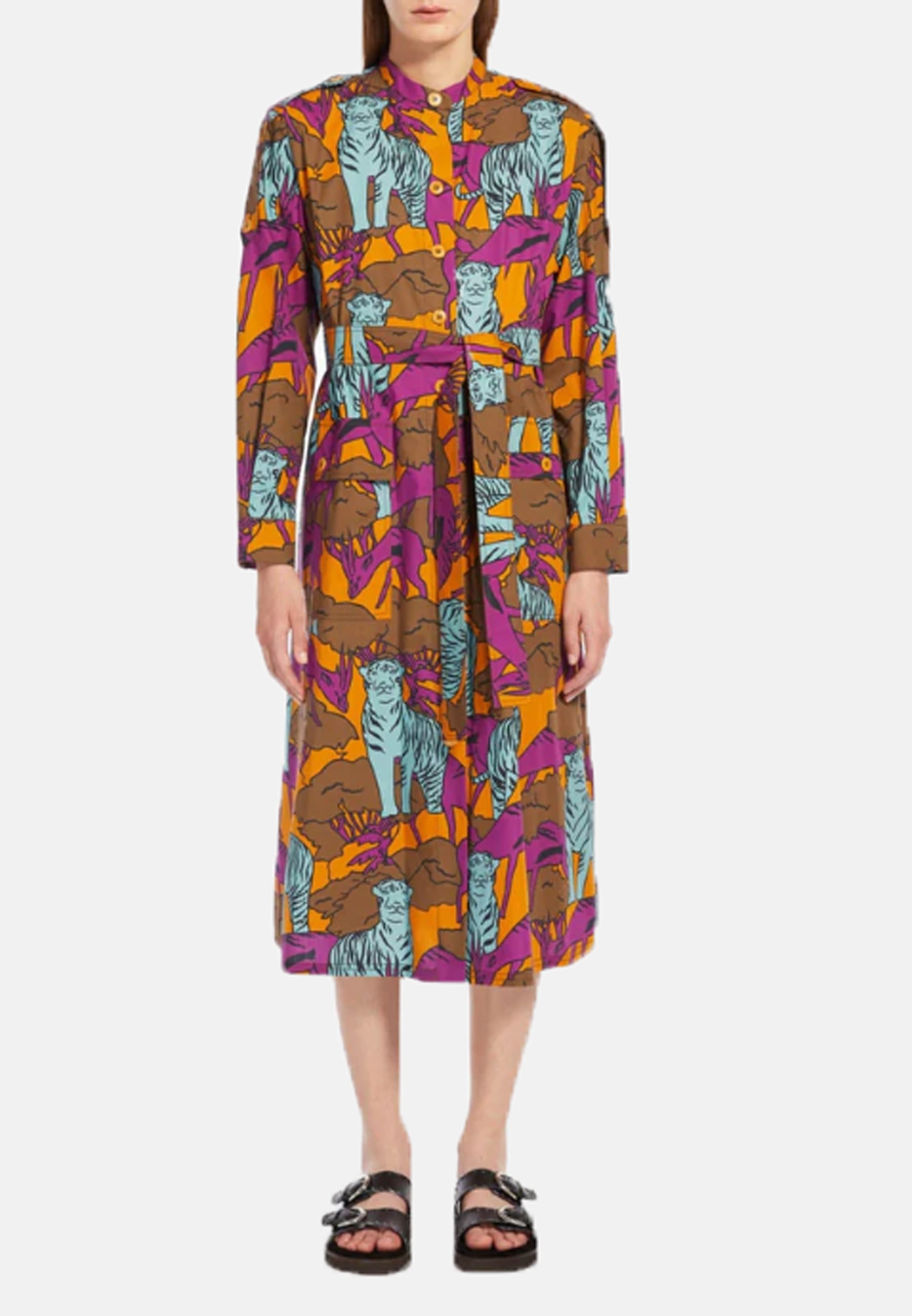 Abito chemisier lungo in morbido popeline di cotone stampato, caratterizzato da colletto alla coreana e tasche applicate con patta e bottoni sul davanti e tasche inserite nei fianchi. Il modello è rifinito con lunghi alamari sulle spalle e maniche lunghe con fessino laterale e polsino a camicia. La cintura abbinata permette di evidenziare la silhouette. Chiusura frontale con bottoni.