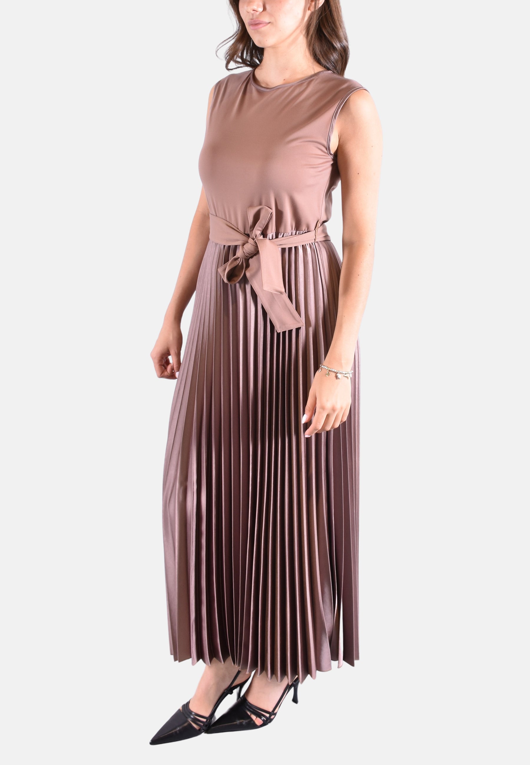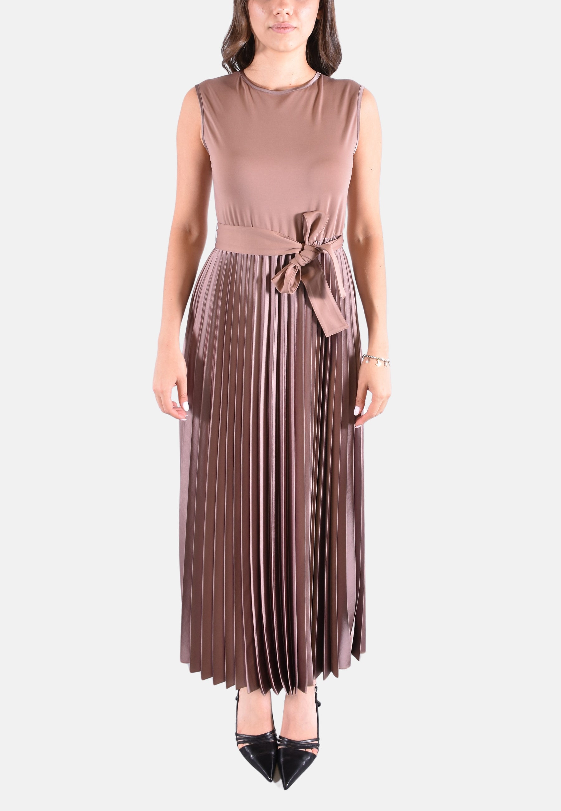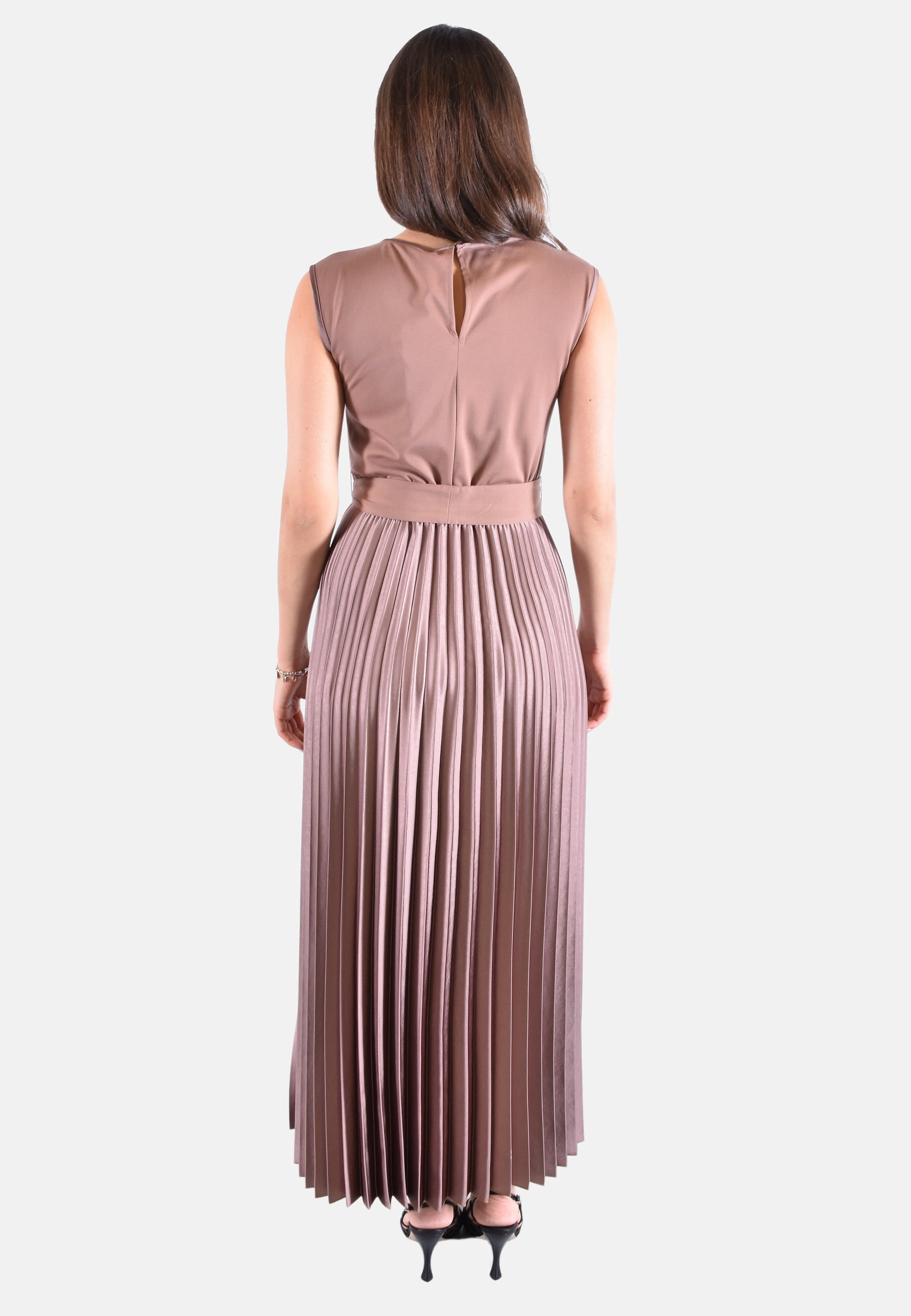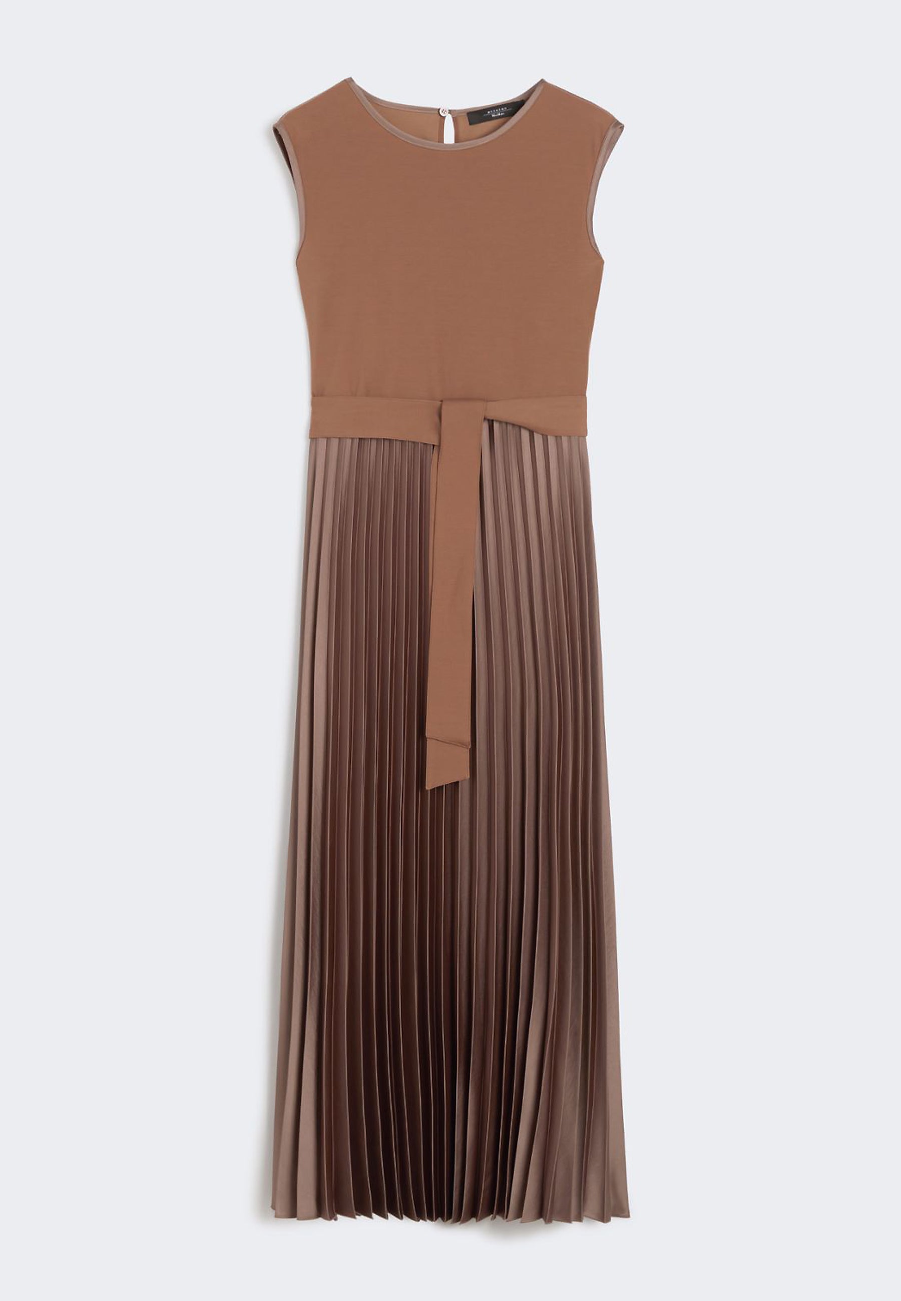 Abito lungo con gonna ampia in raso a pieghe plissé soleil.