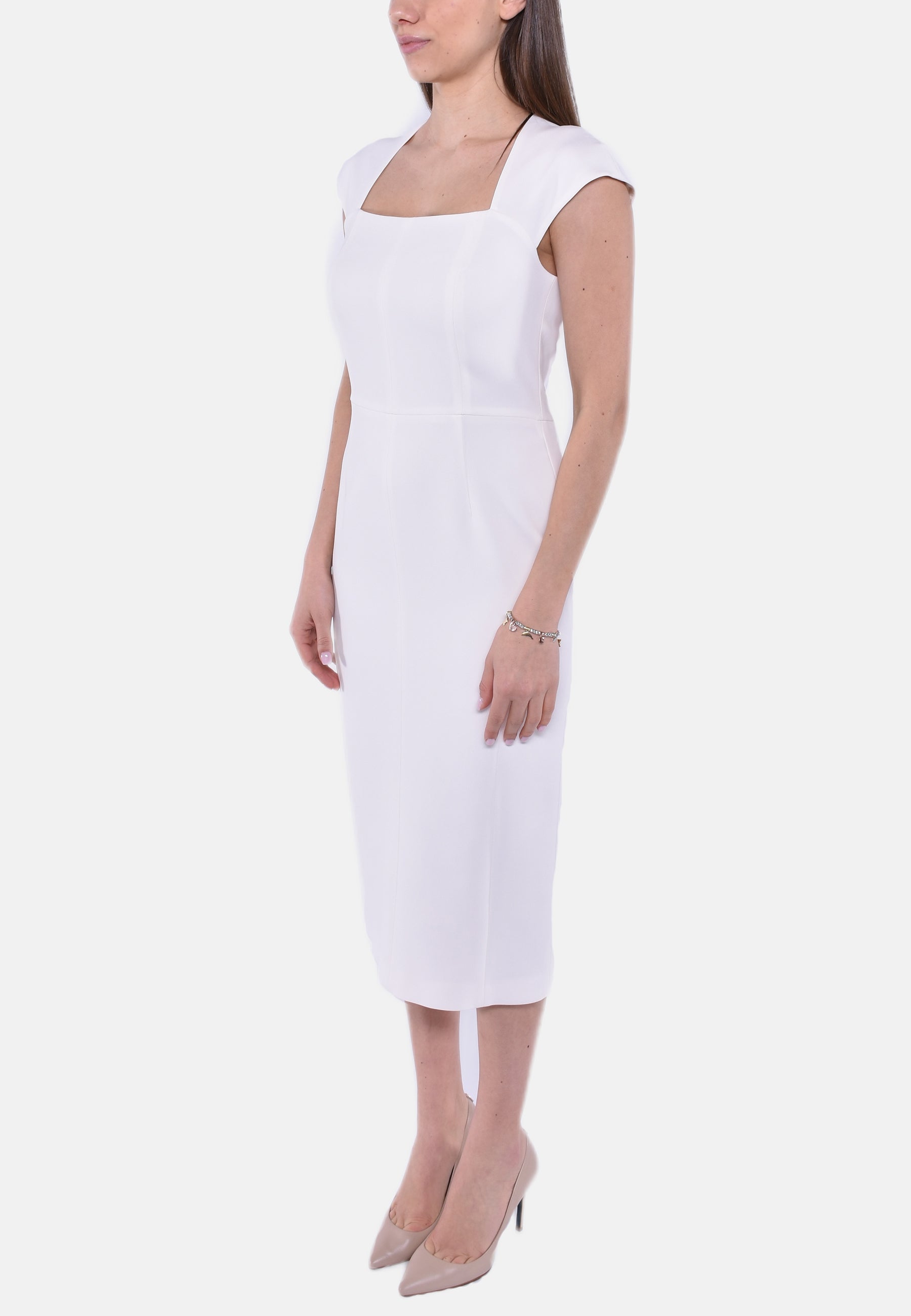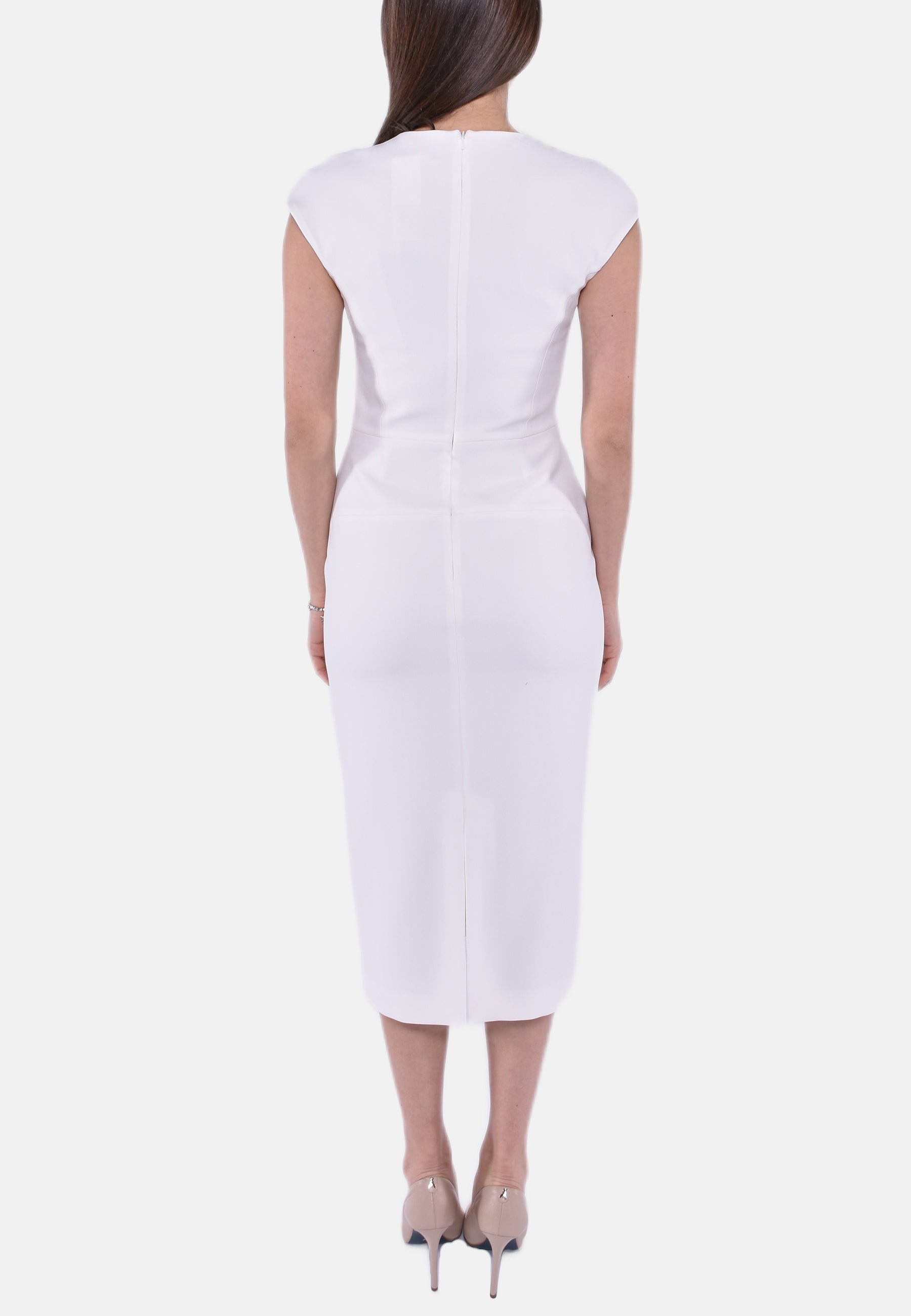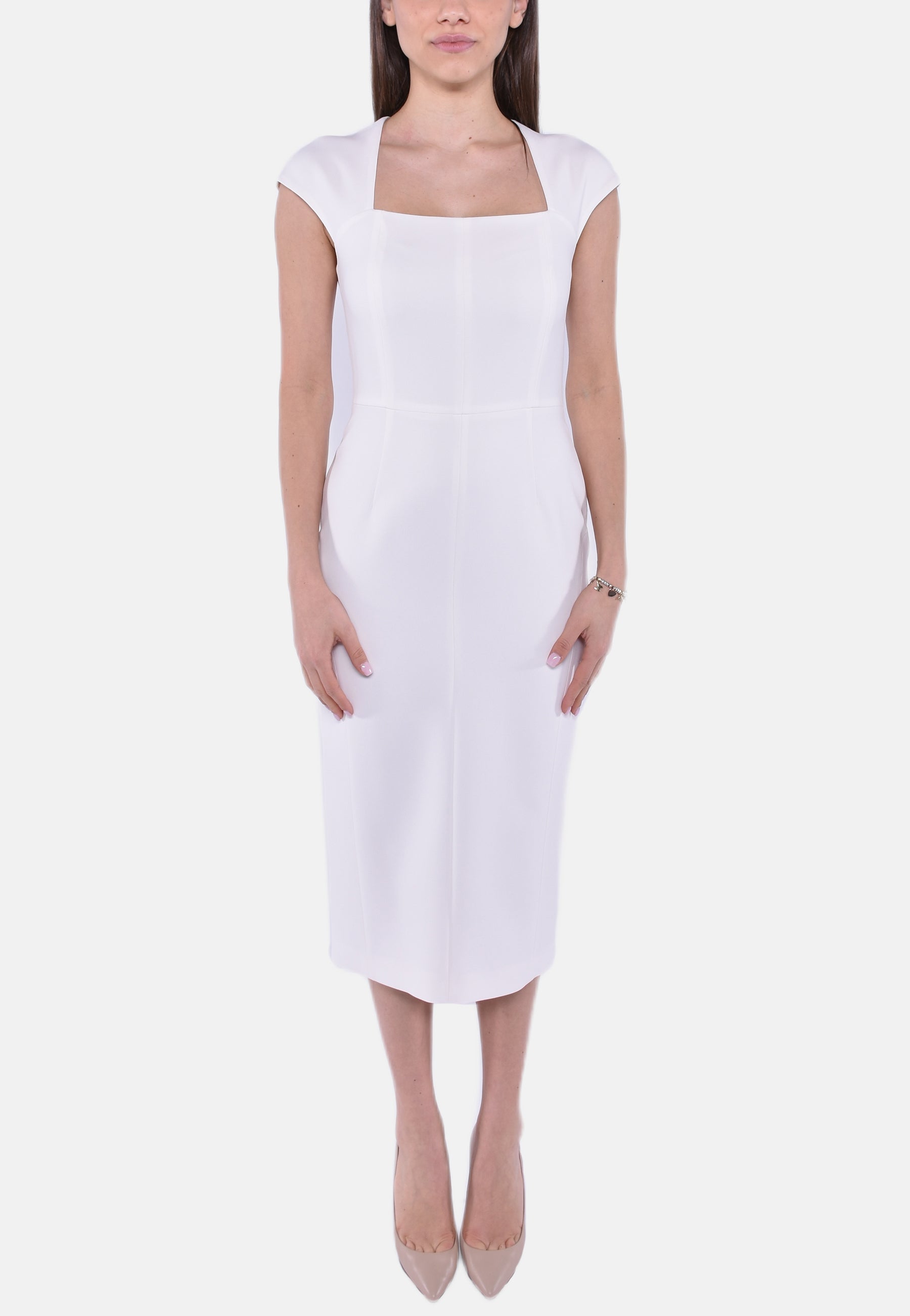 Abito smanicato in cady, caratterizzato da una silhouette aderente evidenziata da un motivo di tagli verticali davanti e sul retro. Rifinito con piccola manica a kimono e spacco centrale sul retro. Chiusura con zip invisibile sul retro.