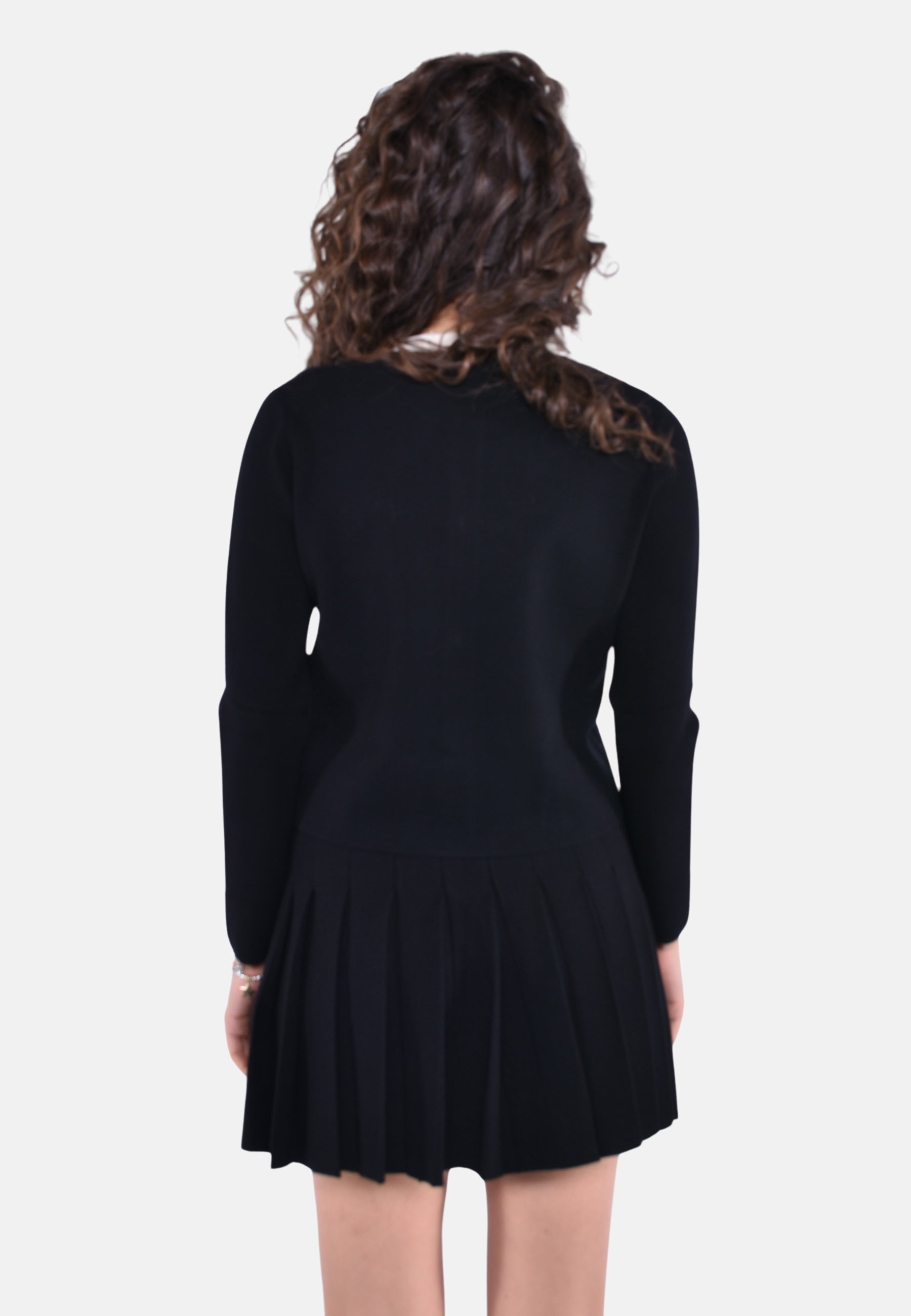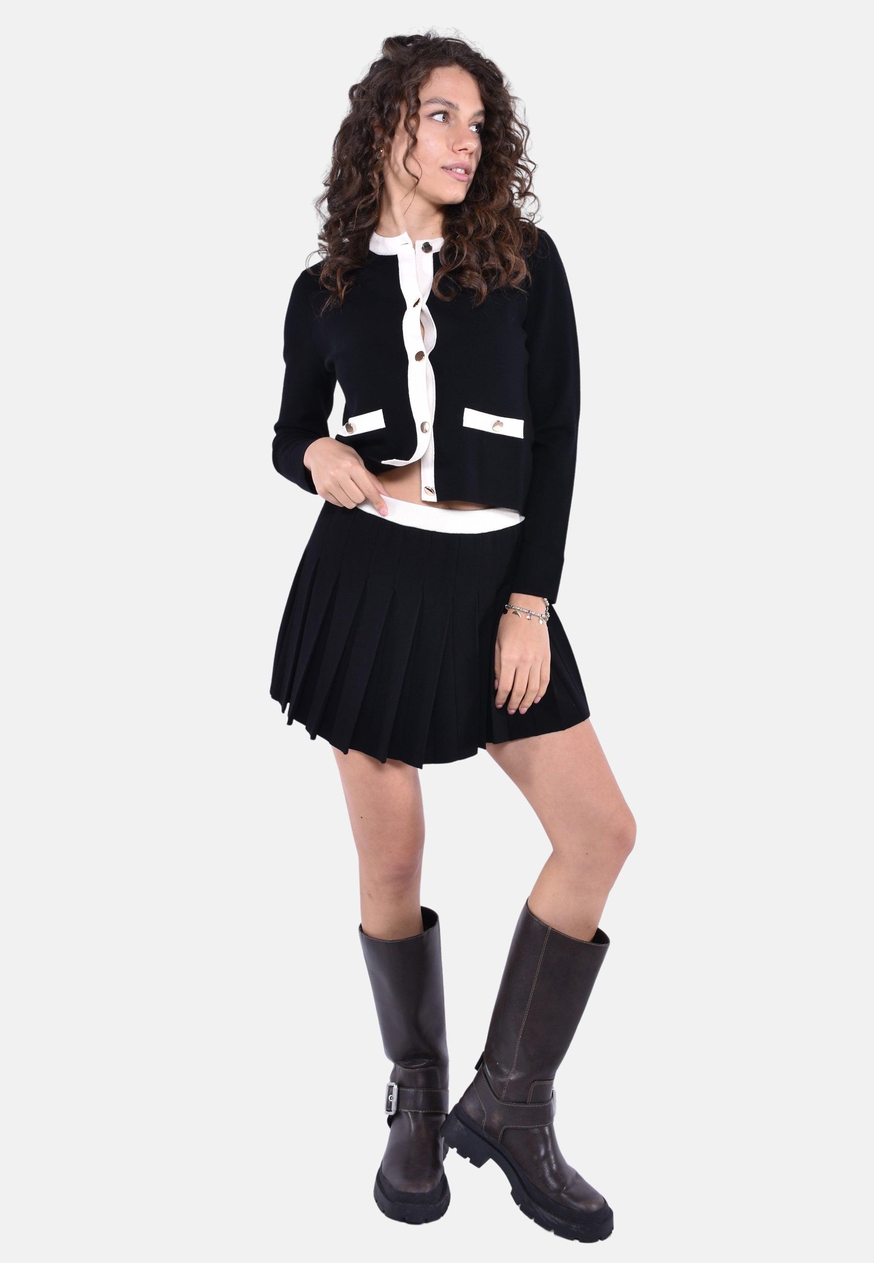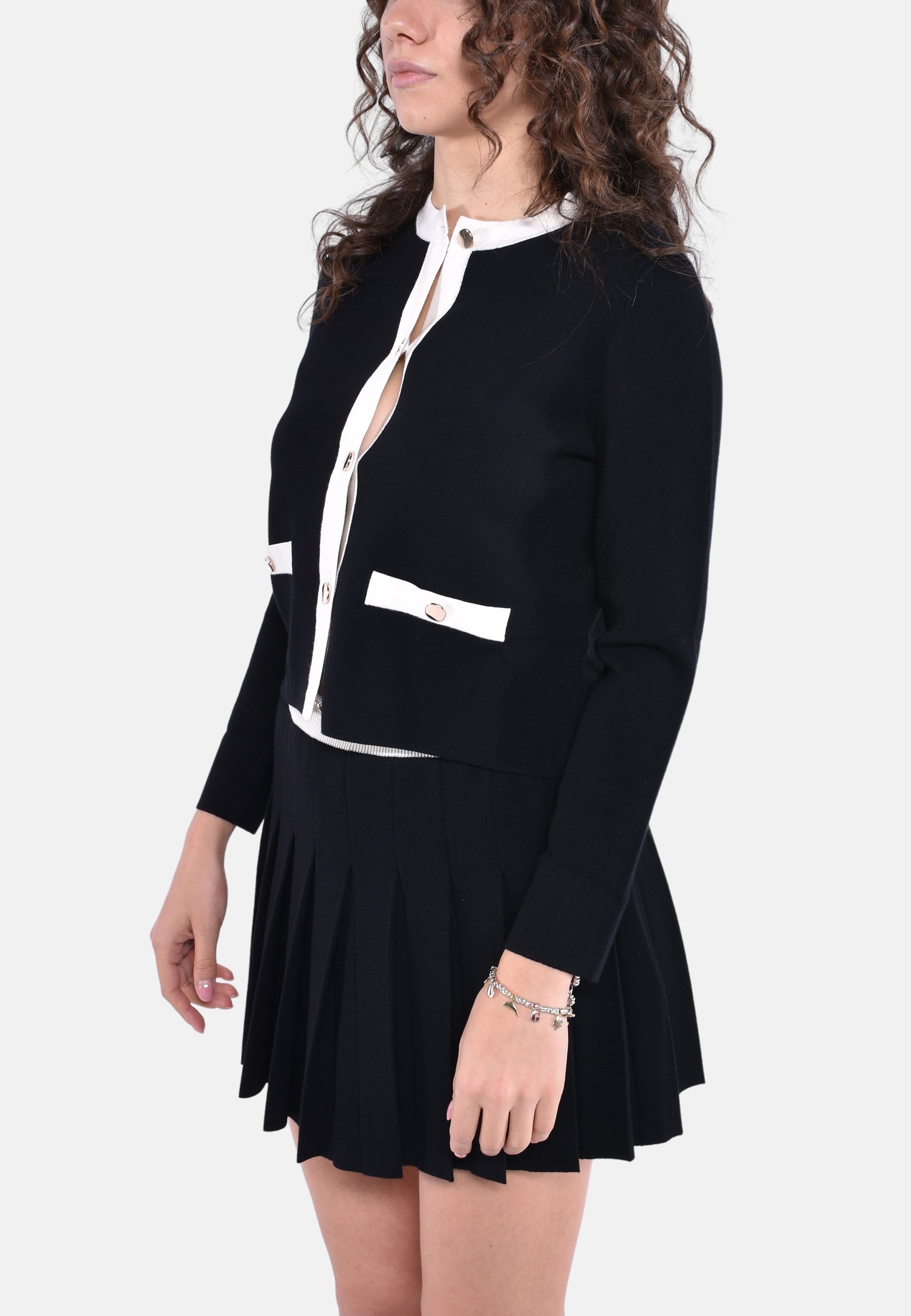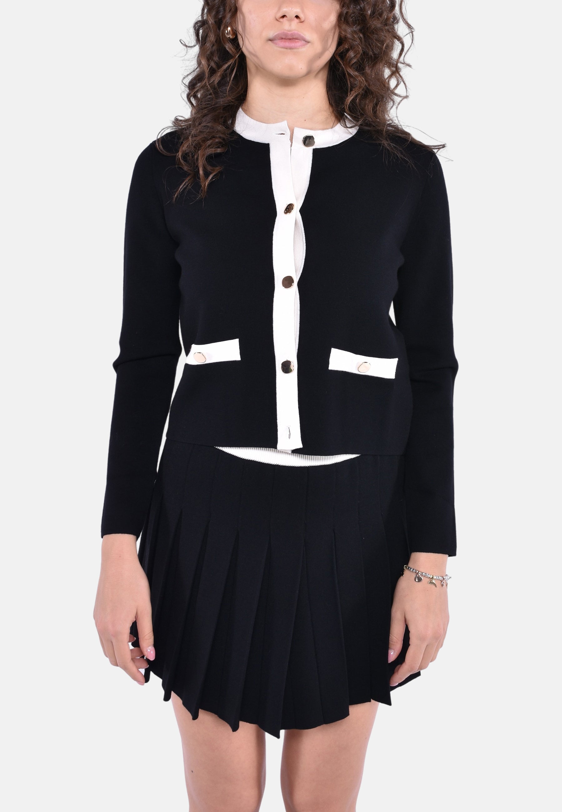 Giacca girocollo in morbida maglia di viscosa stretch, decorata con pattine sul davanti e bottoni in metallo. Il modello rifinito con maniche lunghe a giro e taglio leggermente cropped in vita.