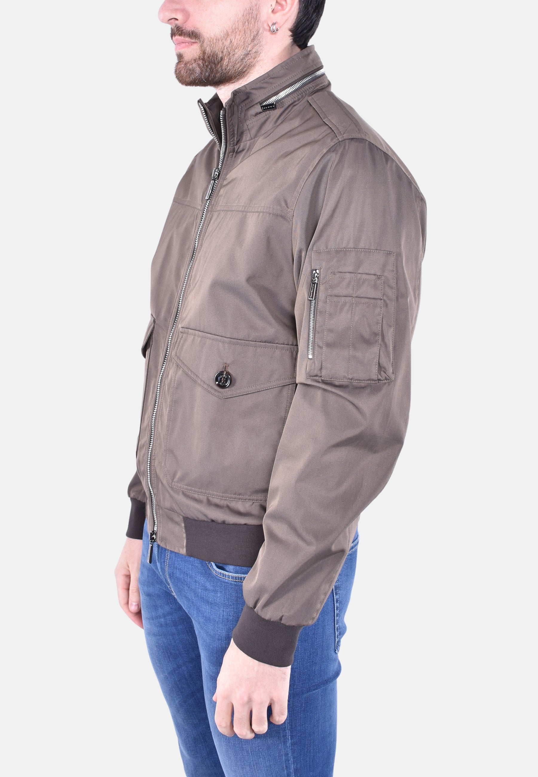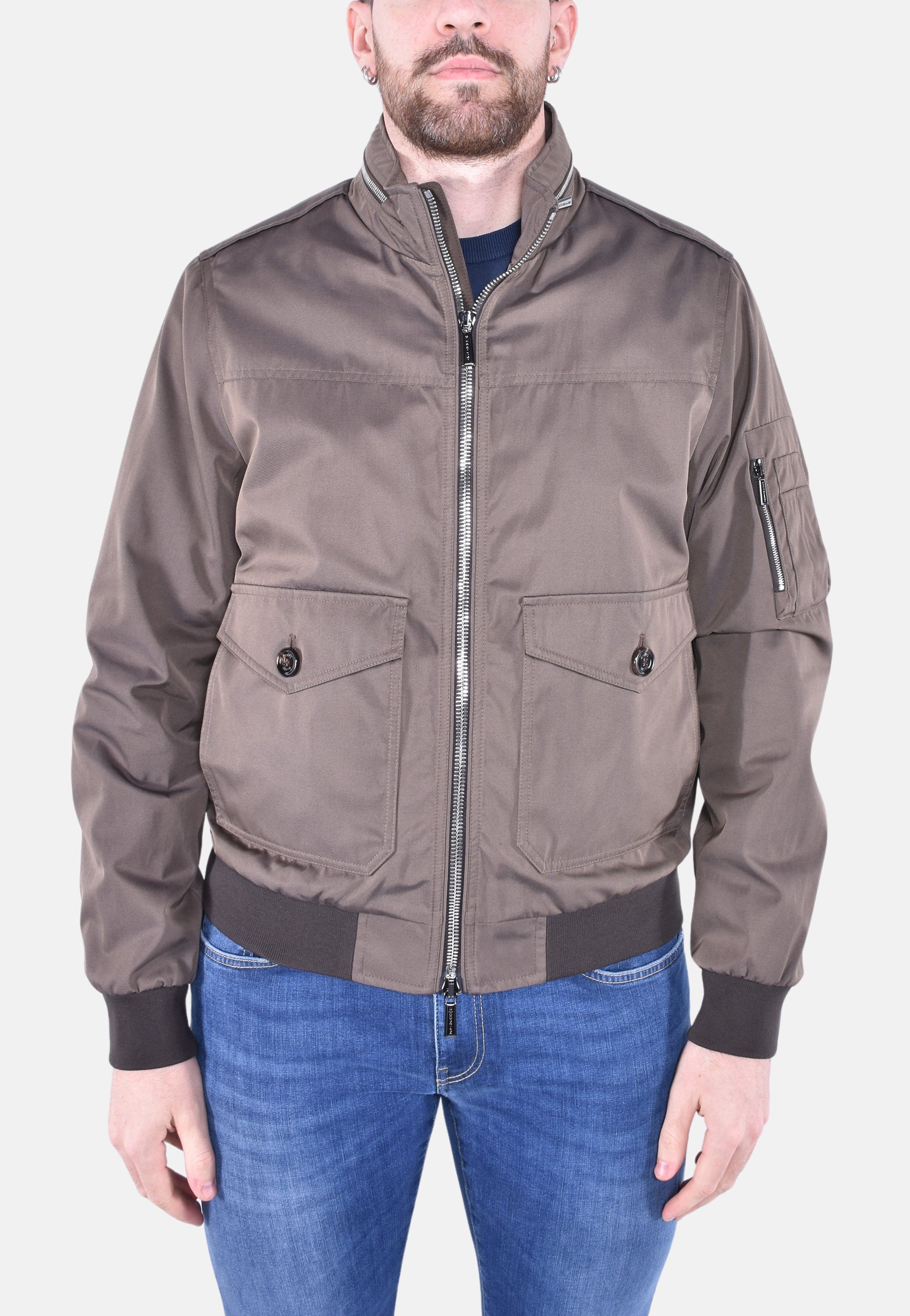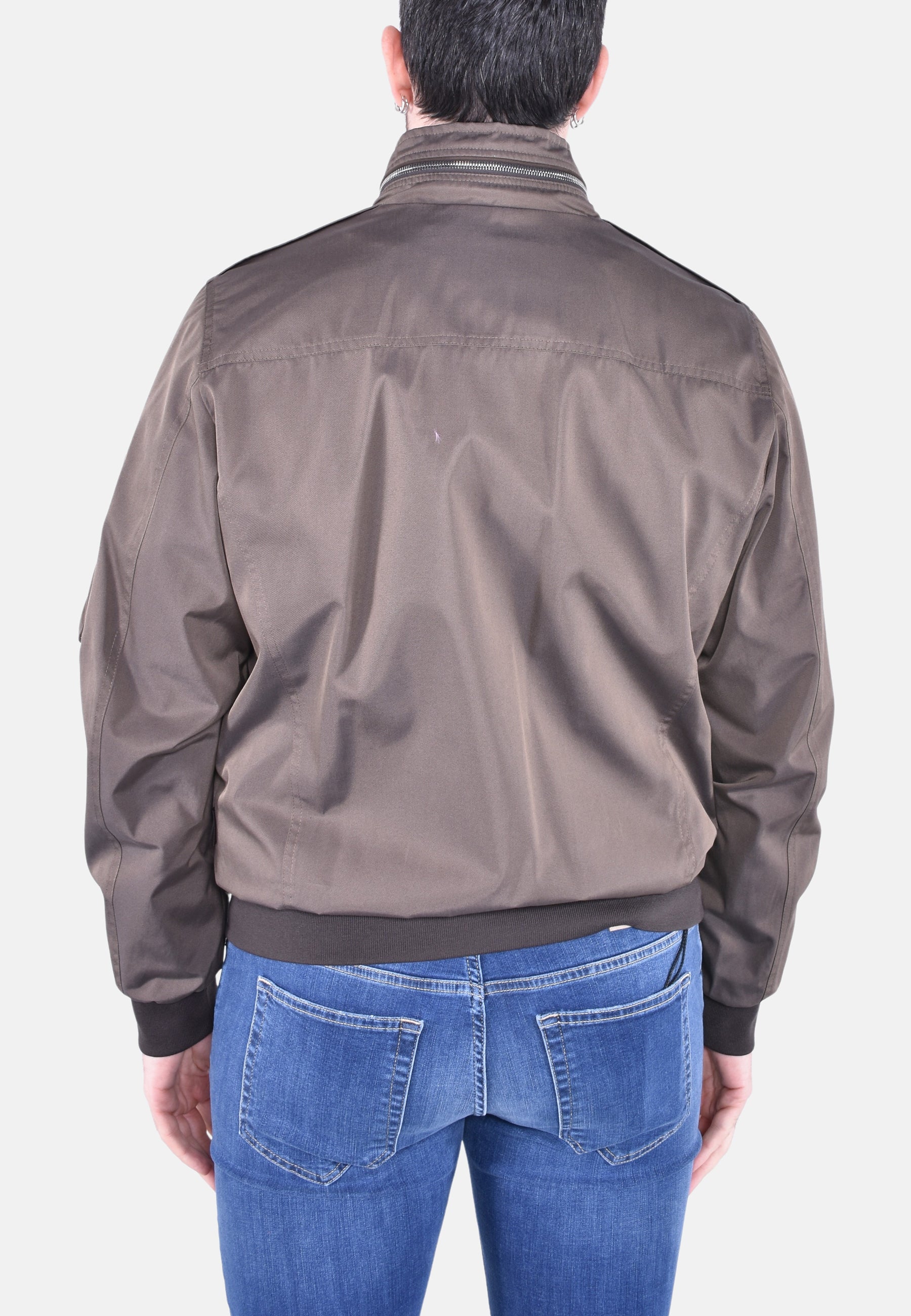 Bomber dal gusto aviatore realizzato in taffetà tinto cangiante in poliestere misto cotone dalla mano memory, con trattamento idrorepellente e rivestimento in tessuto "PU" sul rovescio.
