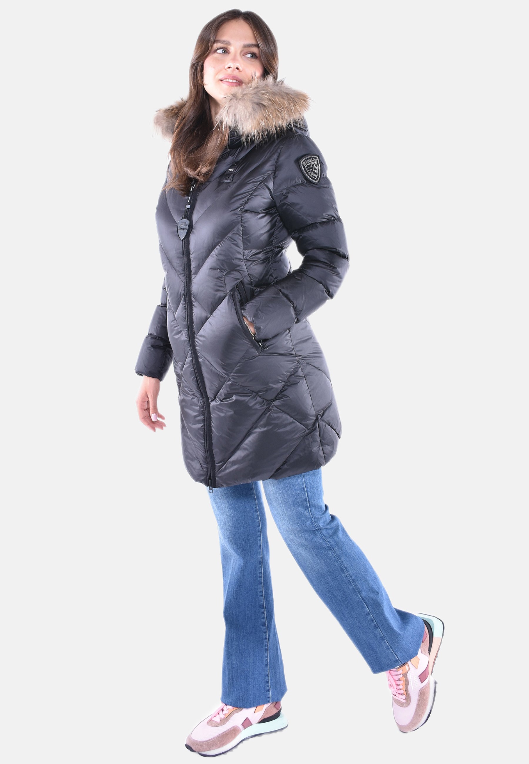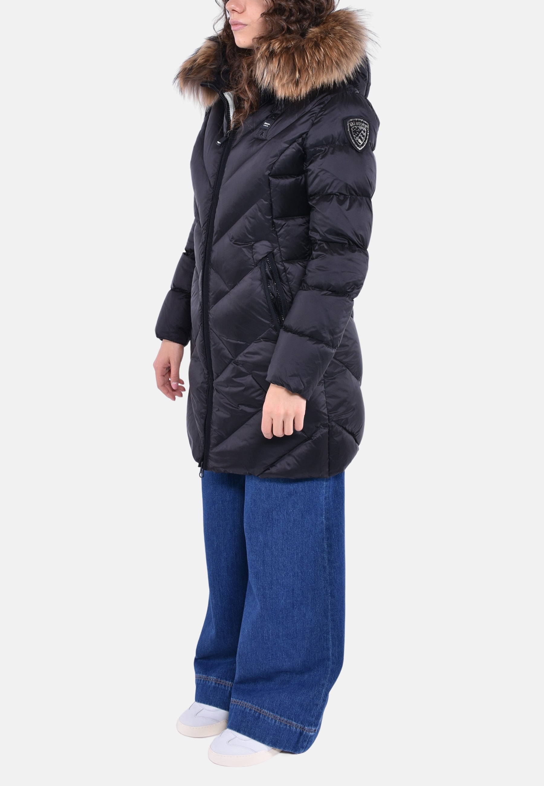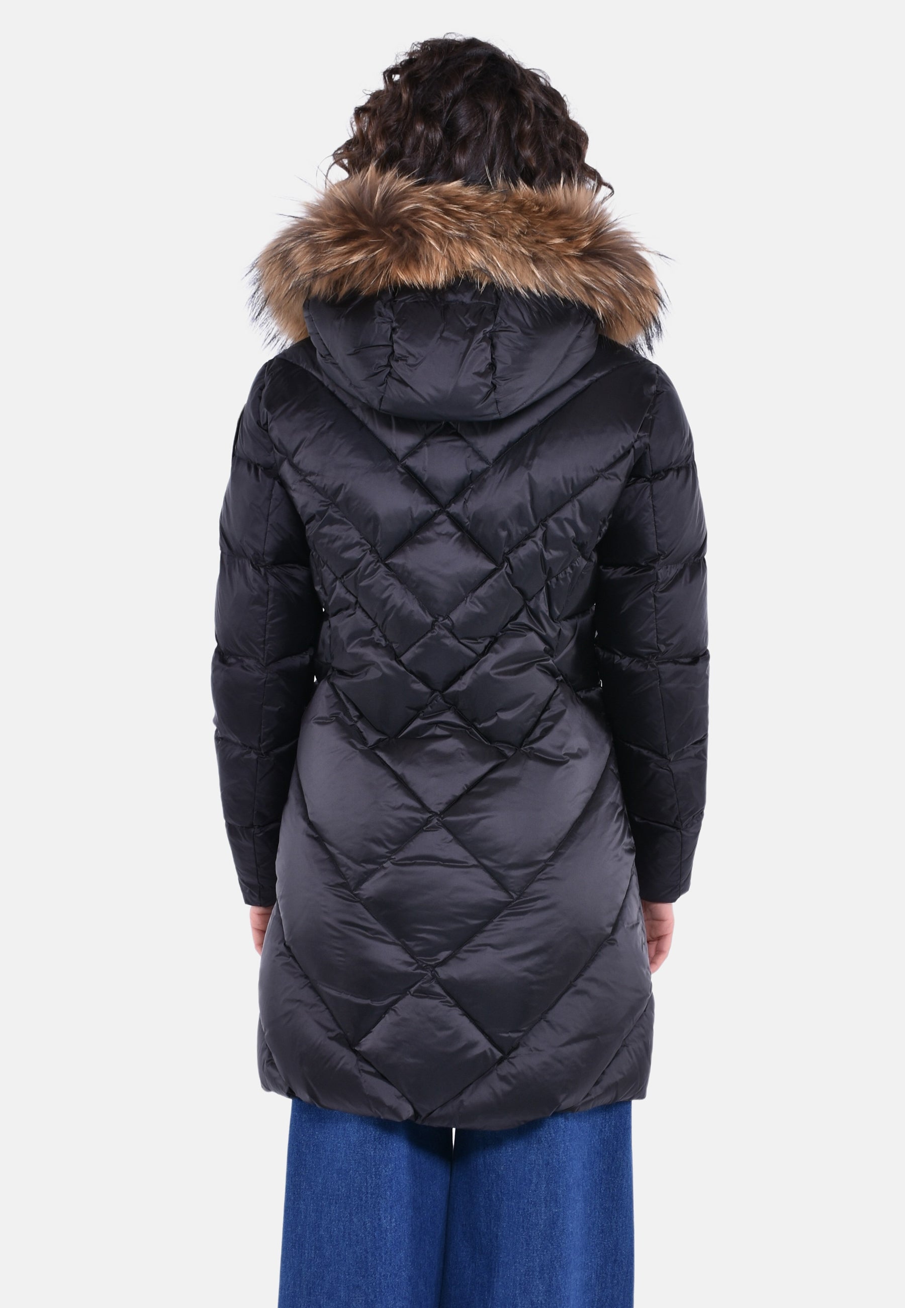 Cappuccio fisso e bordo con vera pelliccia removibile tramite zip.
