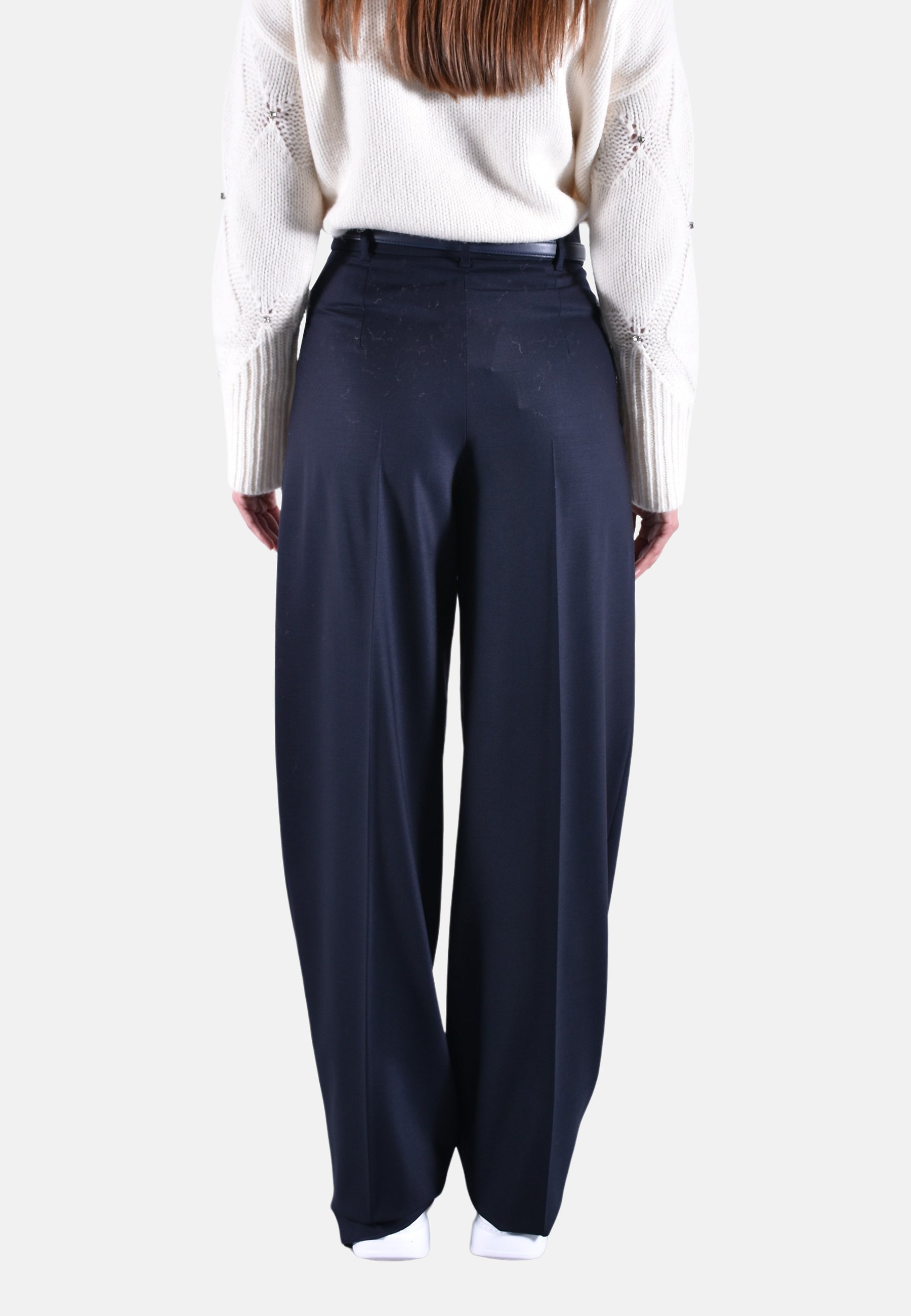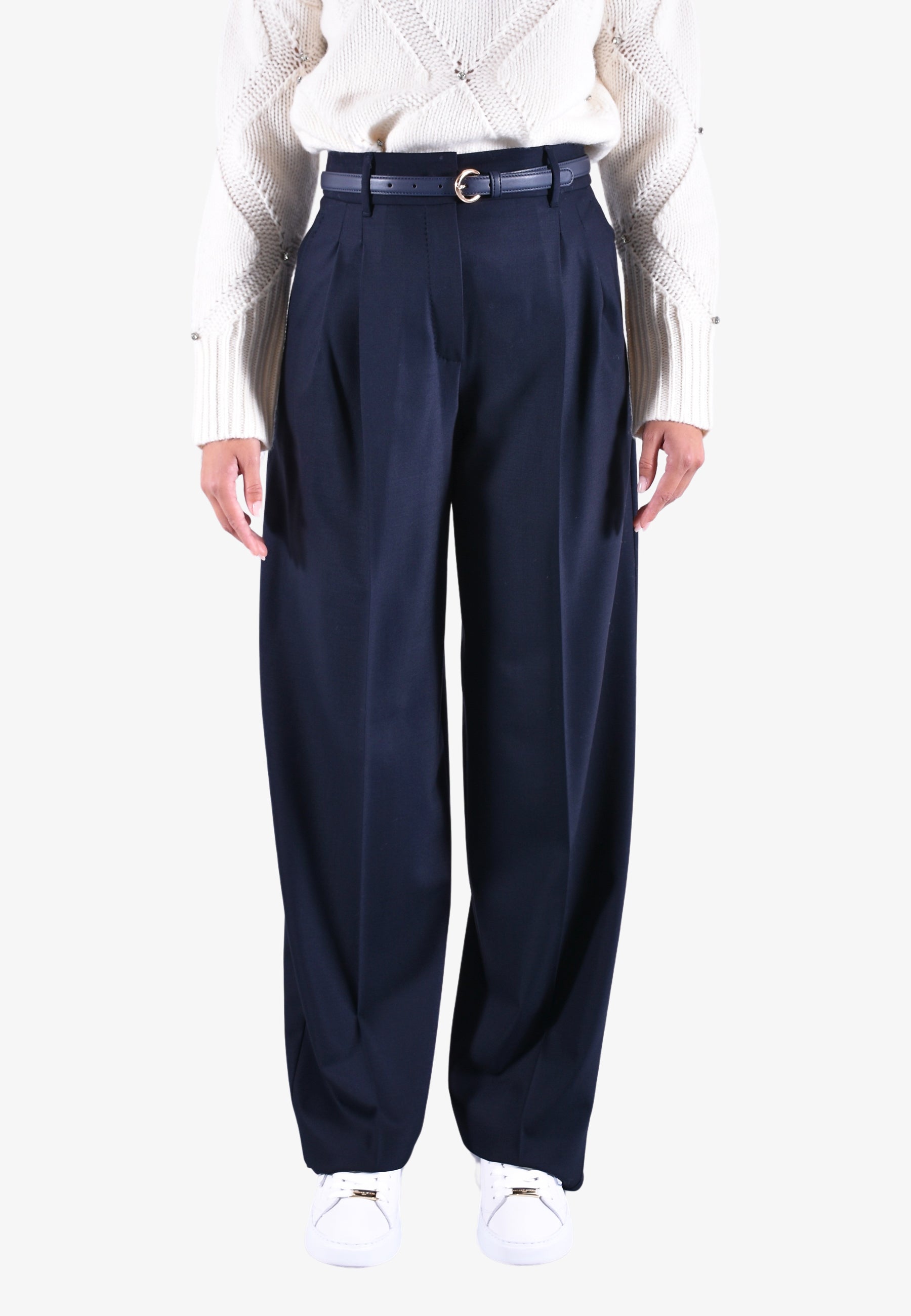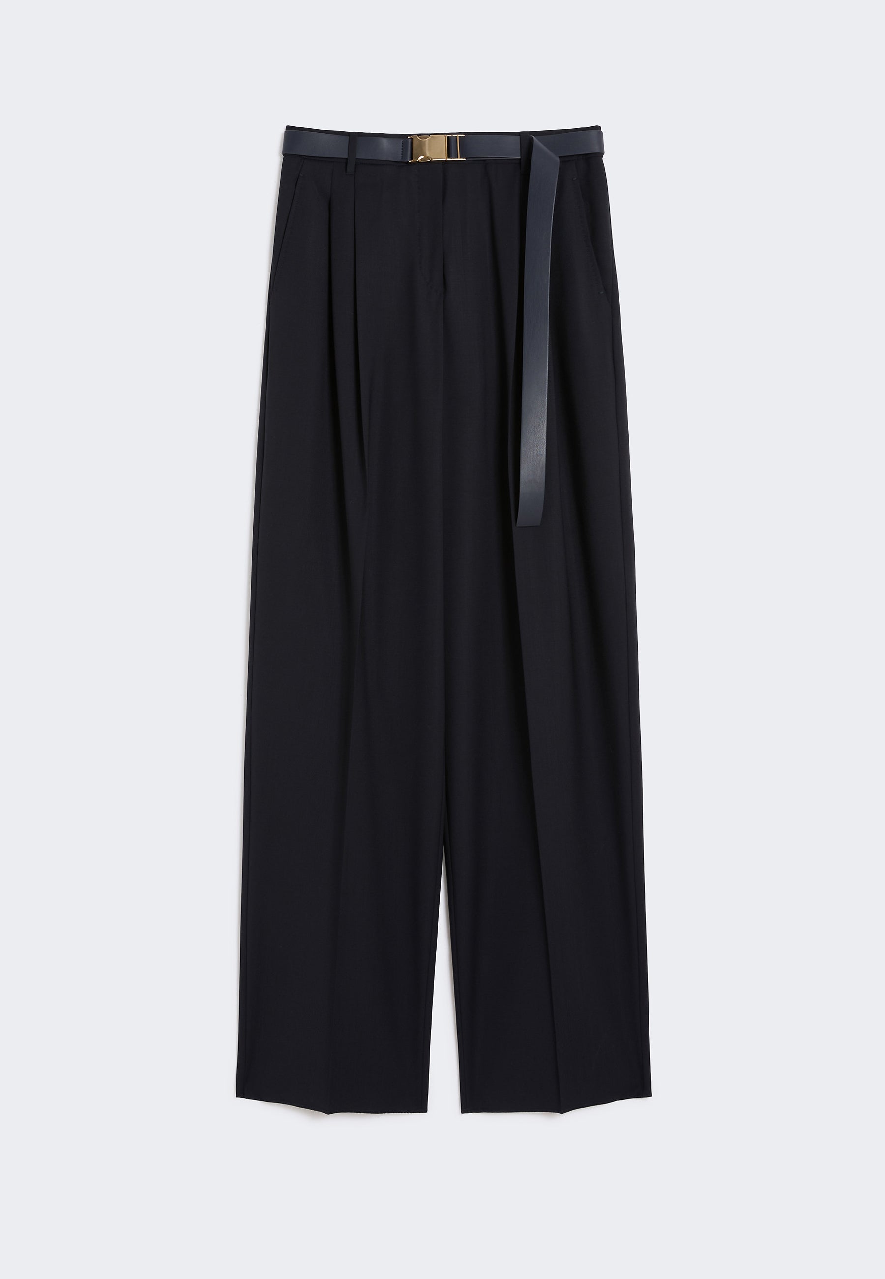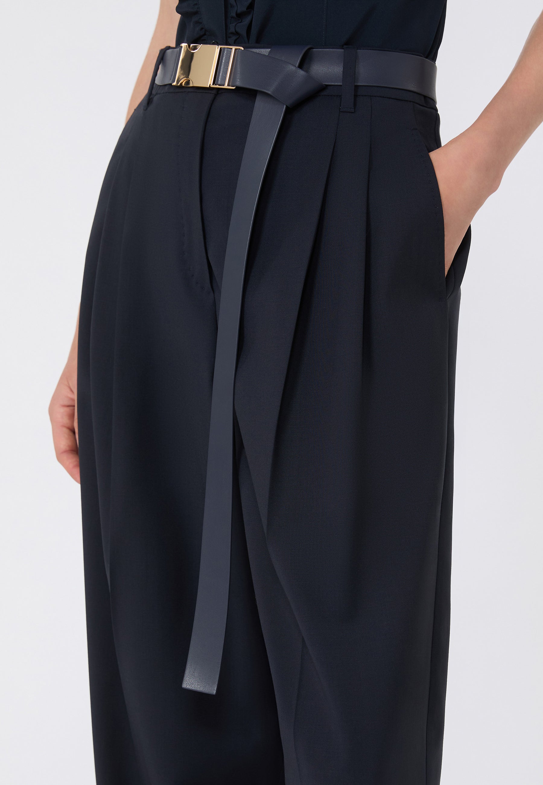 Pantalone con cintura lunga in tessuto spalmato e fibbia in metallo.