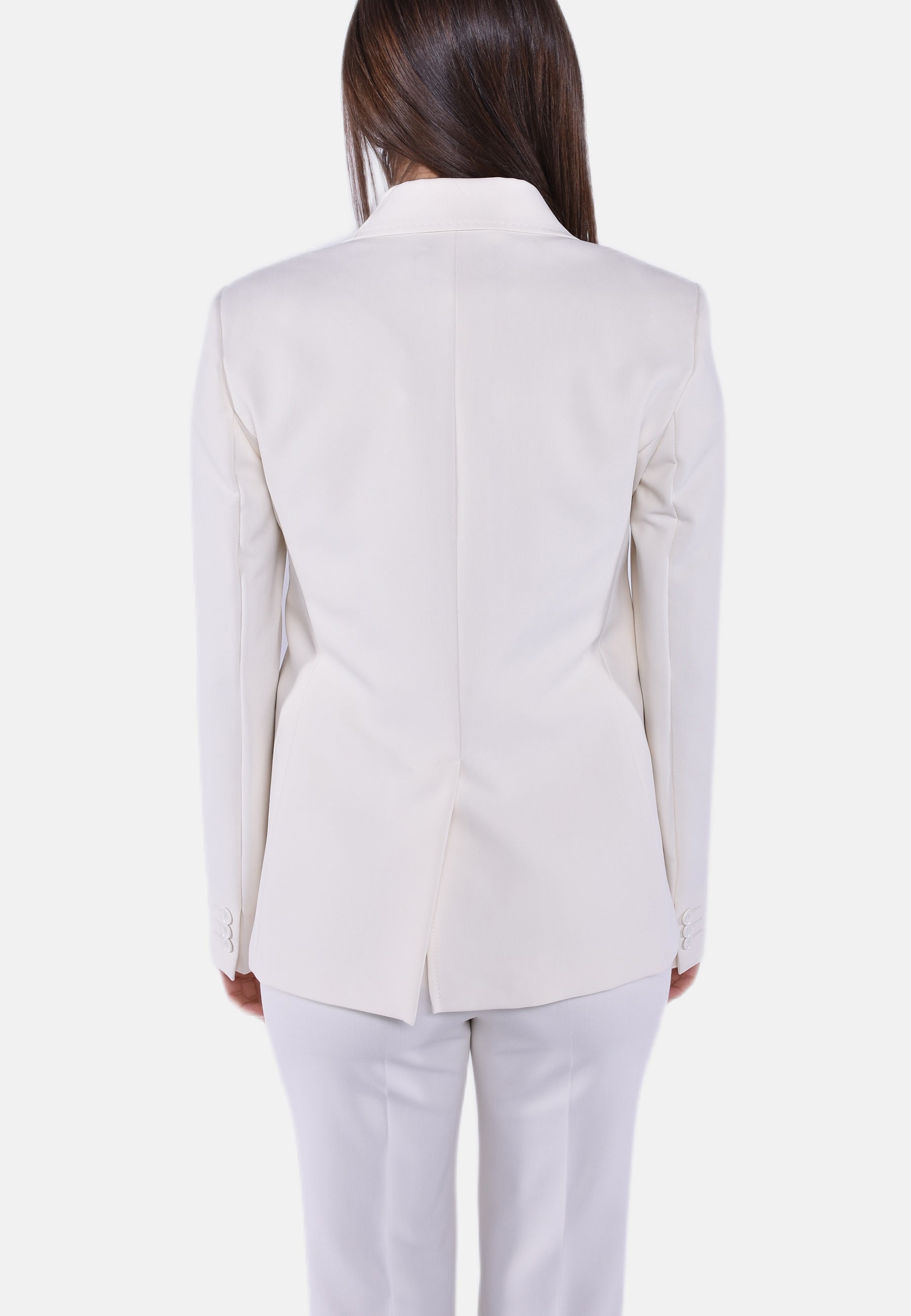 Blazer monopetto in doppia tela di viscosa stretch, caratterizzato da una silhouette femminile con classico collo a rever, taschino sul petto e tasche con patta sul davanti. Modello foderato, rifinito con spacco centrale sul retro. Chiusura con due bottoni.