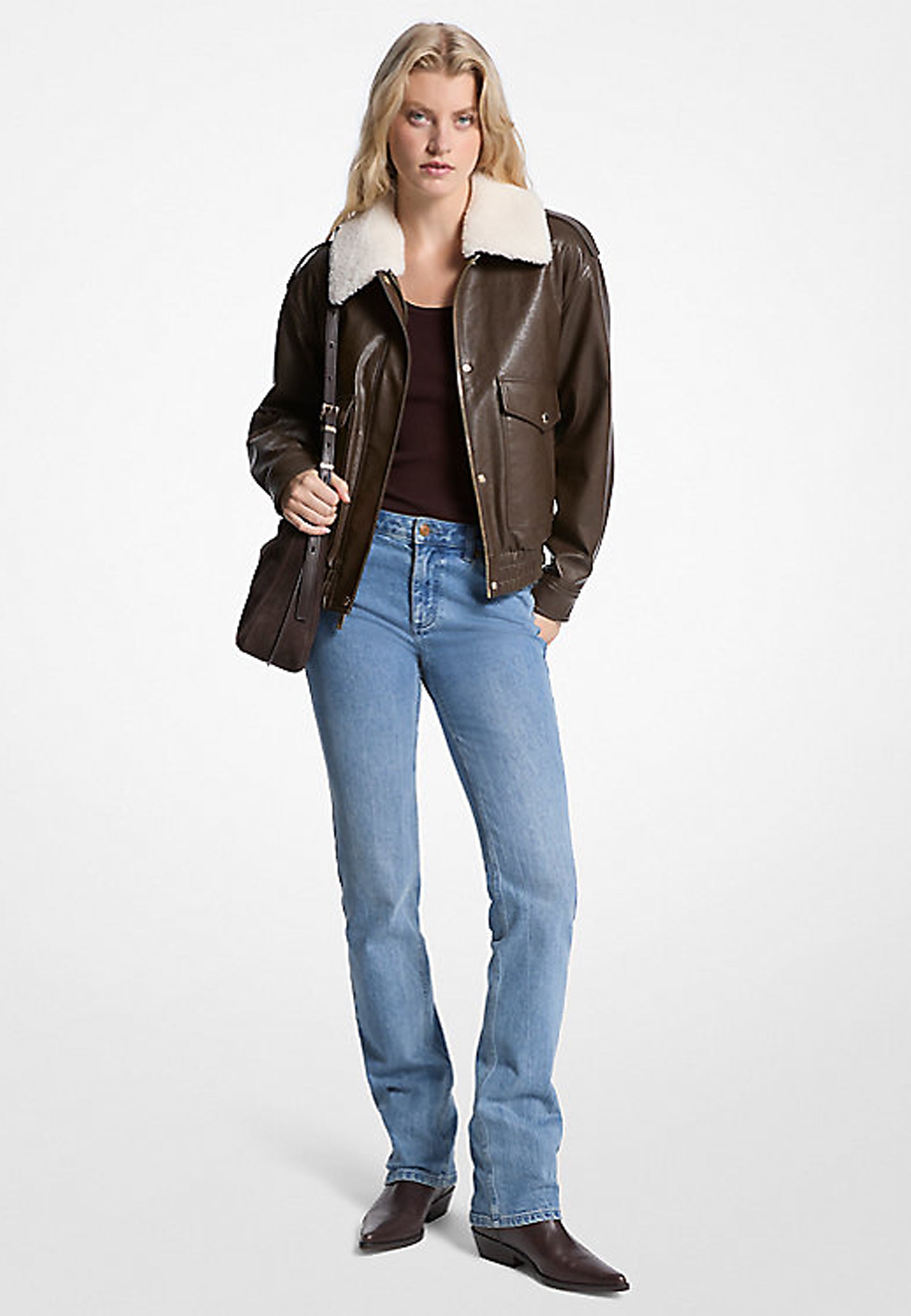 Rivisitazione contemporanea di un classico, questa giacca reinterpreta il bomber in una finitura opaca con un collo in morbido shearling. Le spalle scese e la finitura elasticizzata valorizzano il taglio rilassato, mentre le ampie tasche a scatto possono essere usate per custodire piccoli oggetti. Abbina la ricca tonalità calda a una maglia e un paio di stivali coordinati.