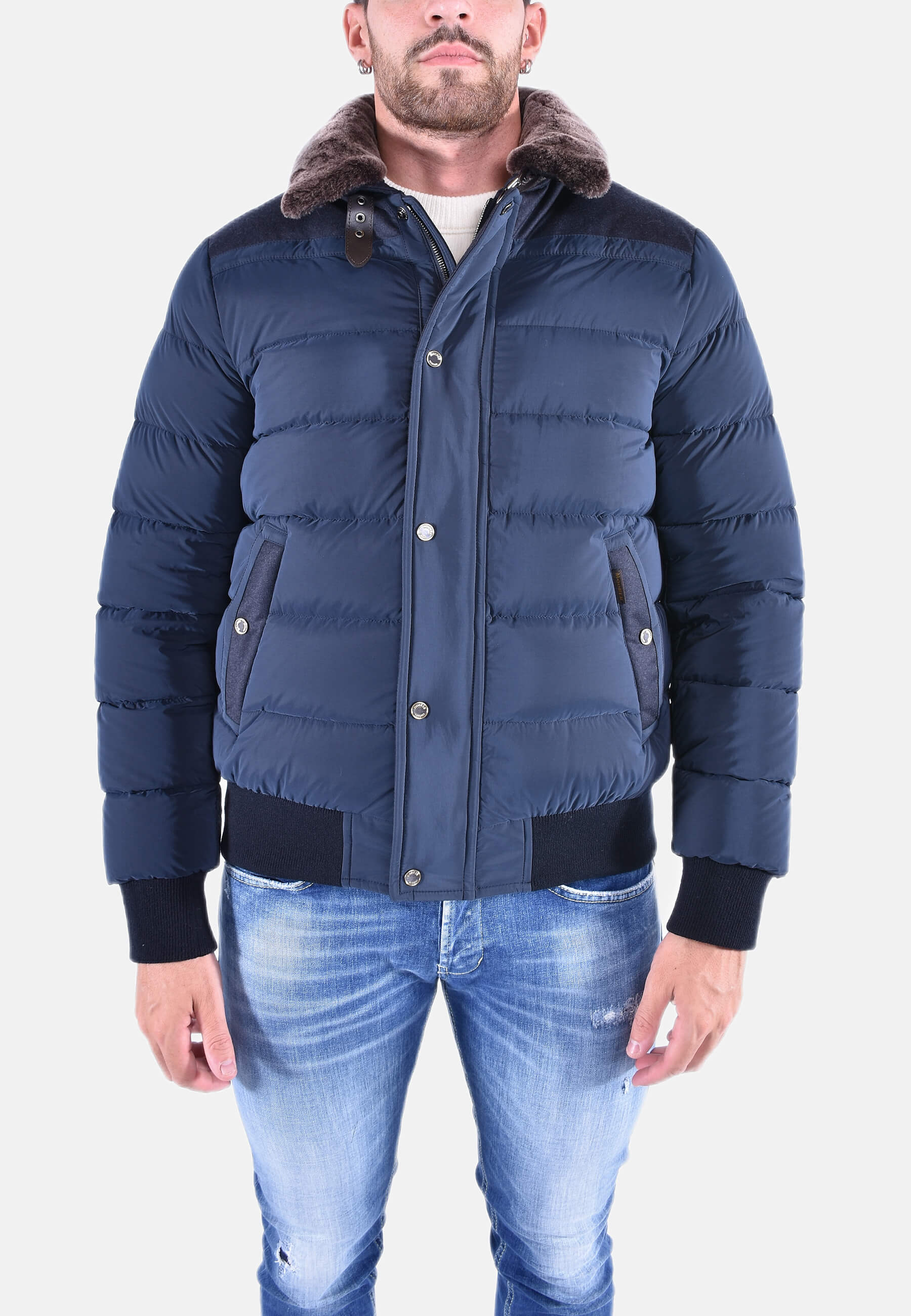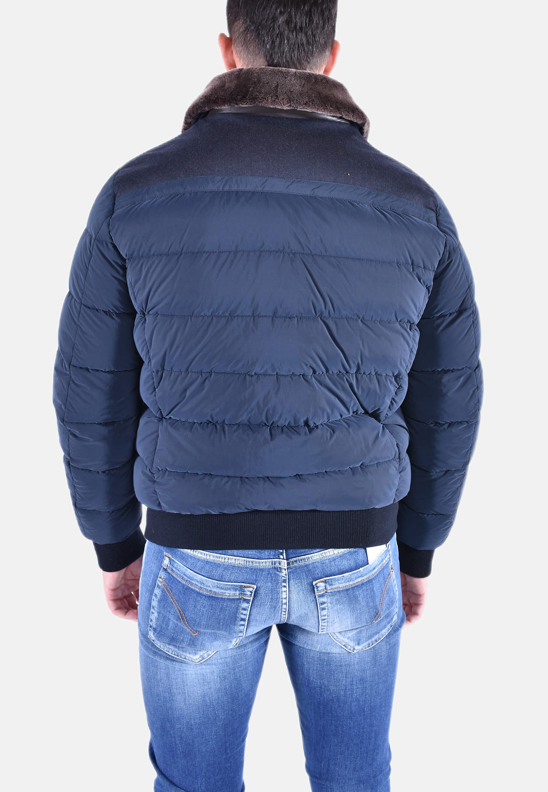 Bomber ibrido trapuntato a boudin imbottito in piuma d'oca, realizzato in misto flanella in lana membranata antigoccia e microfibra opaca. Doppia chiusura frontale con bottoni a pressione a vista e laccetto in pelle con fibbia sul collo. Fondo e polsi in maglia. Tasche con chiusura da bottoni a pressione a vista in finitura anticata tipica dell'abbigliamento jeans. Tasche interne porta documenti con rifiniture con fettucce logate.