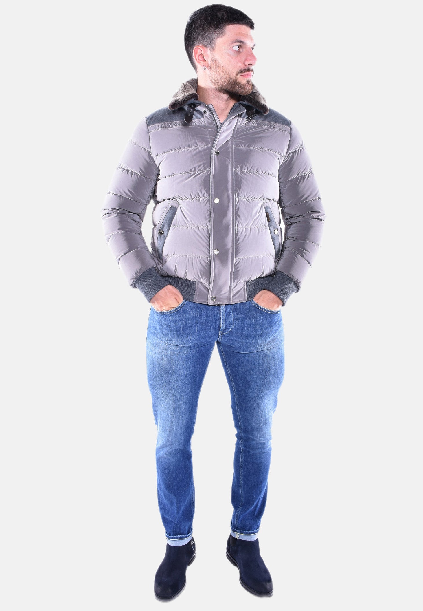 Bomber ibrido trapuntato a boudin imbottito in piuma d'oca, realizzato in misto flanella in lana membranata antigoccia e microfibra opaca. Doppia chiusura frontale con bottoni a pressione a vista e laccetto in pelle con fibbia sul collo. Fondo e polsi in maglia. Tasche con chiusura da bottoni a pressione a vista in finitura anticata tipica dell'abbigliamento jeans. Tasche interne porta documenti con rifiniture con fettucce logate.