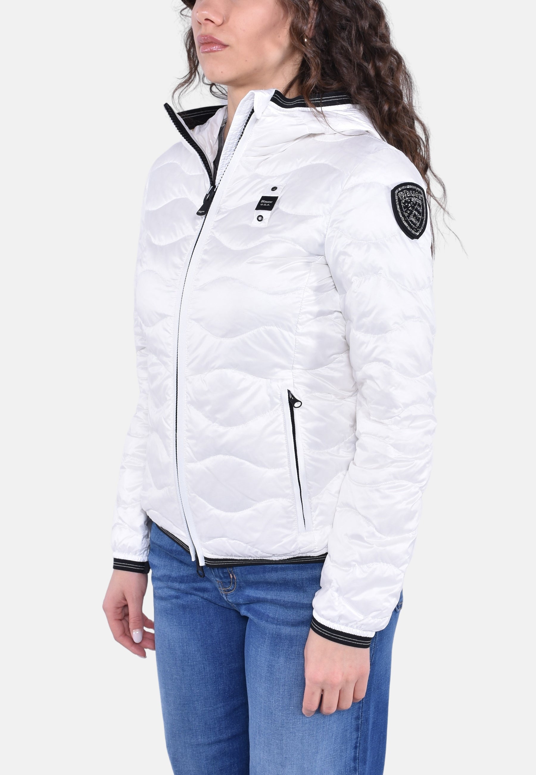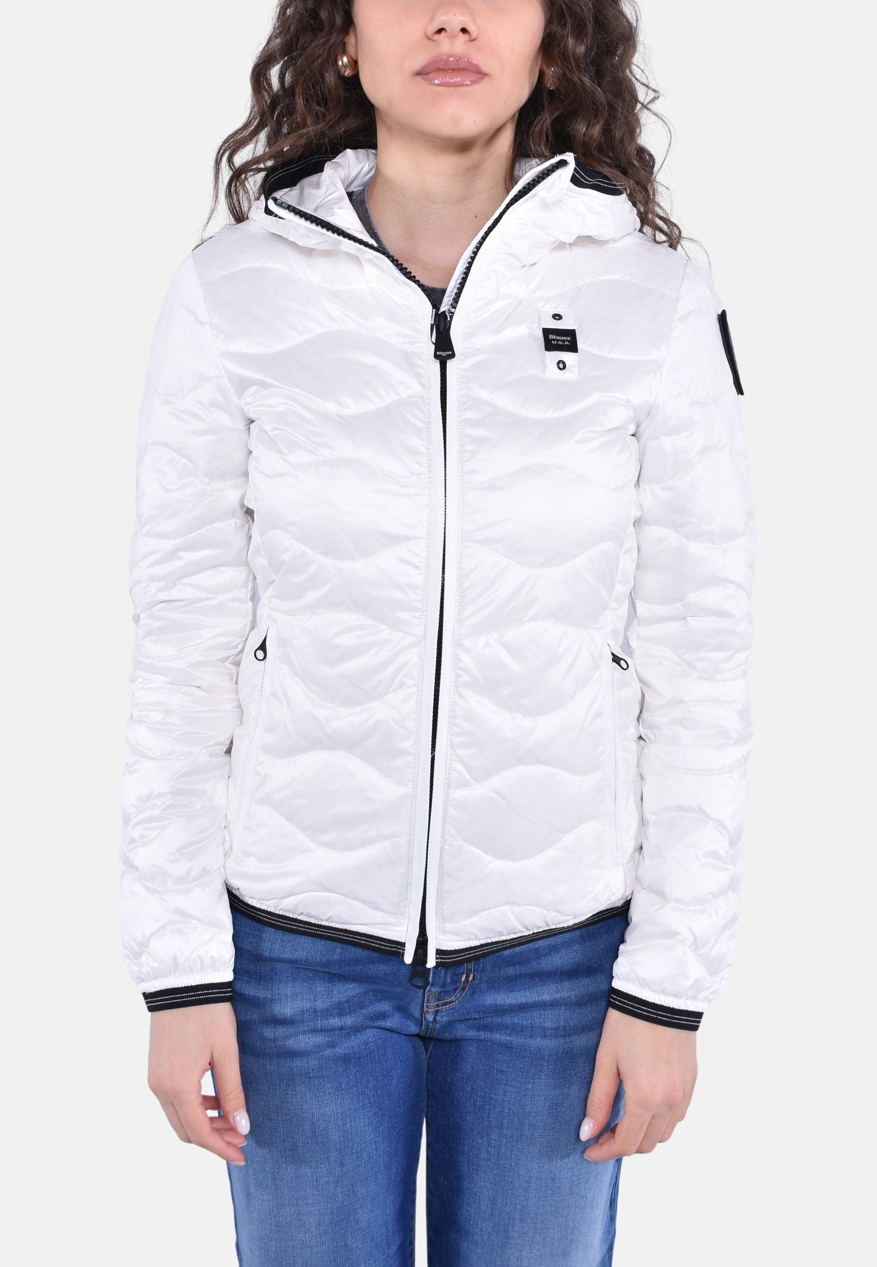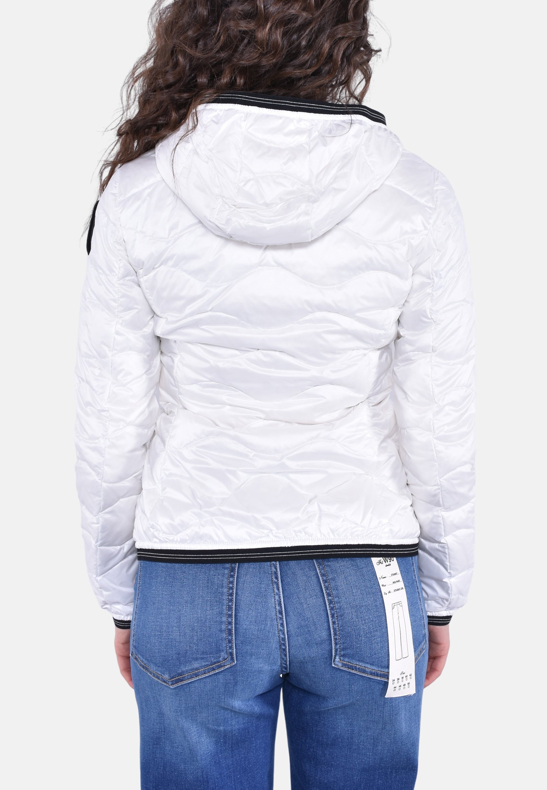Piumino con cuciture ad onde orizzontali. Imbottitura leggera in morbida piuma e taglio svasato per risaltare la figura.