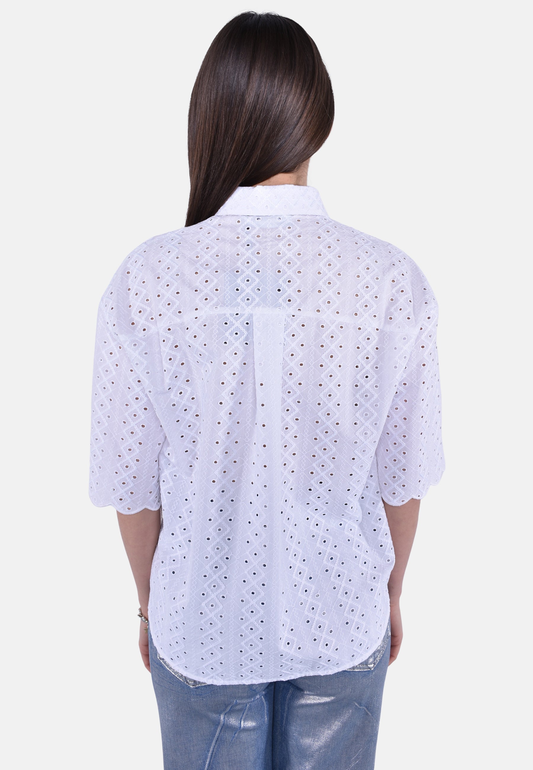 Camicia in pizzo oversize a mezza manica con bottoni a scomparsa.
