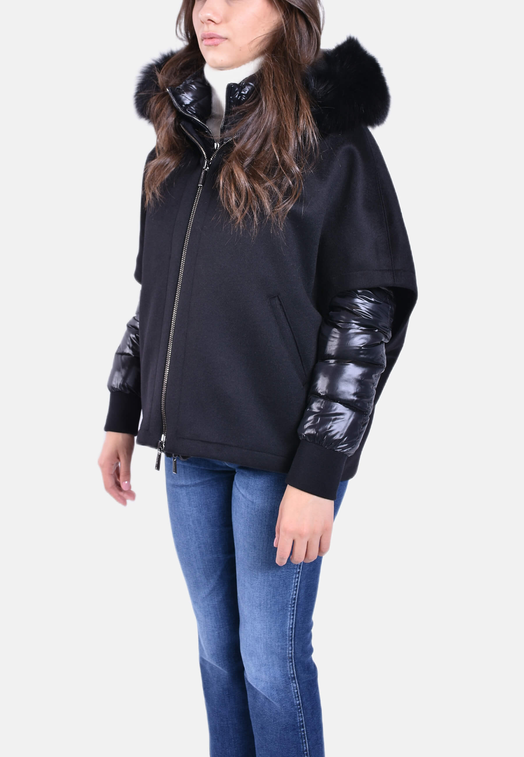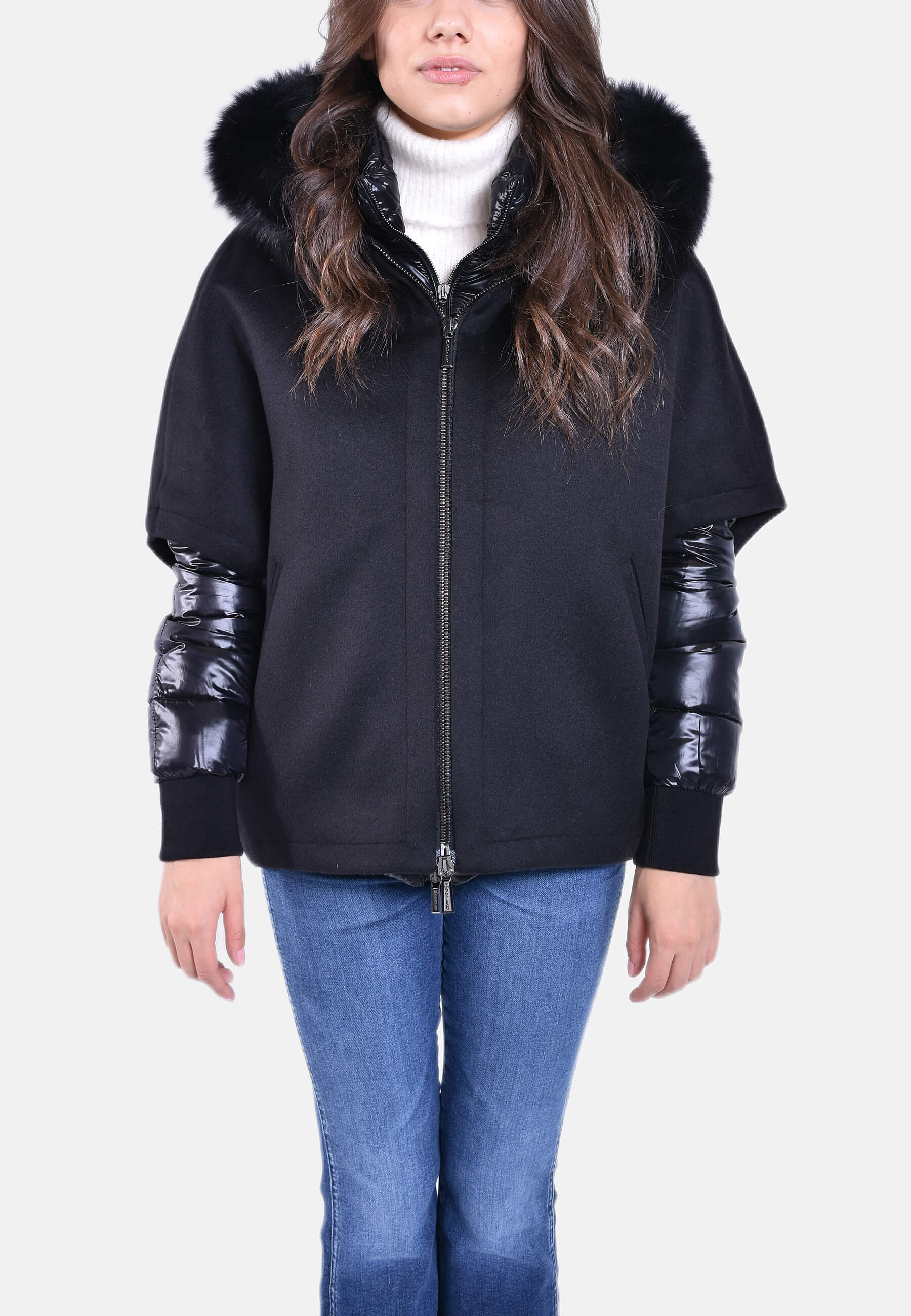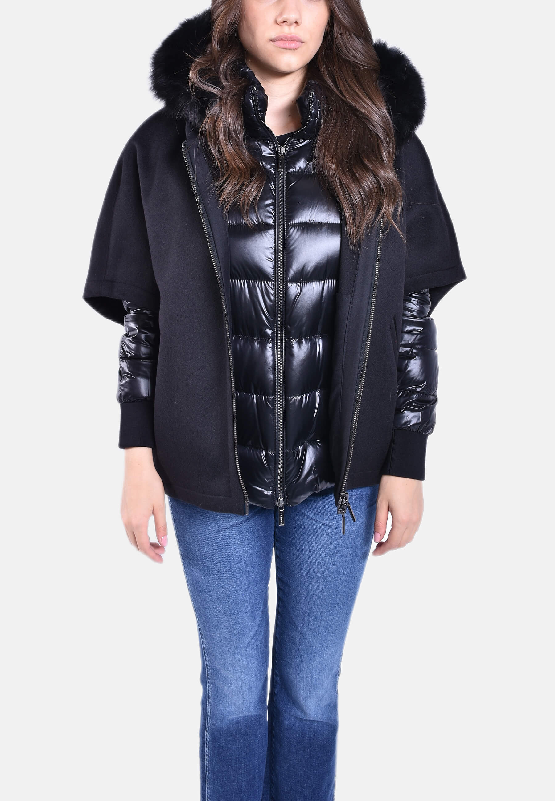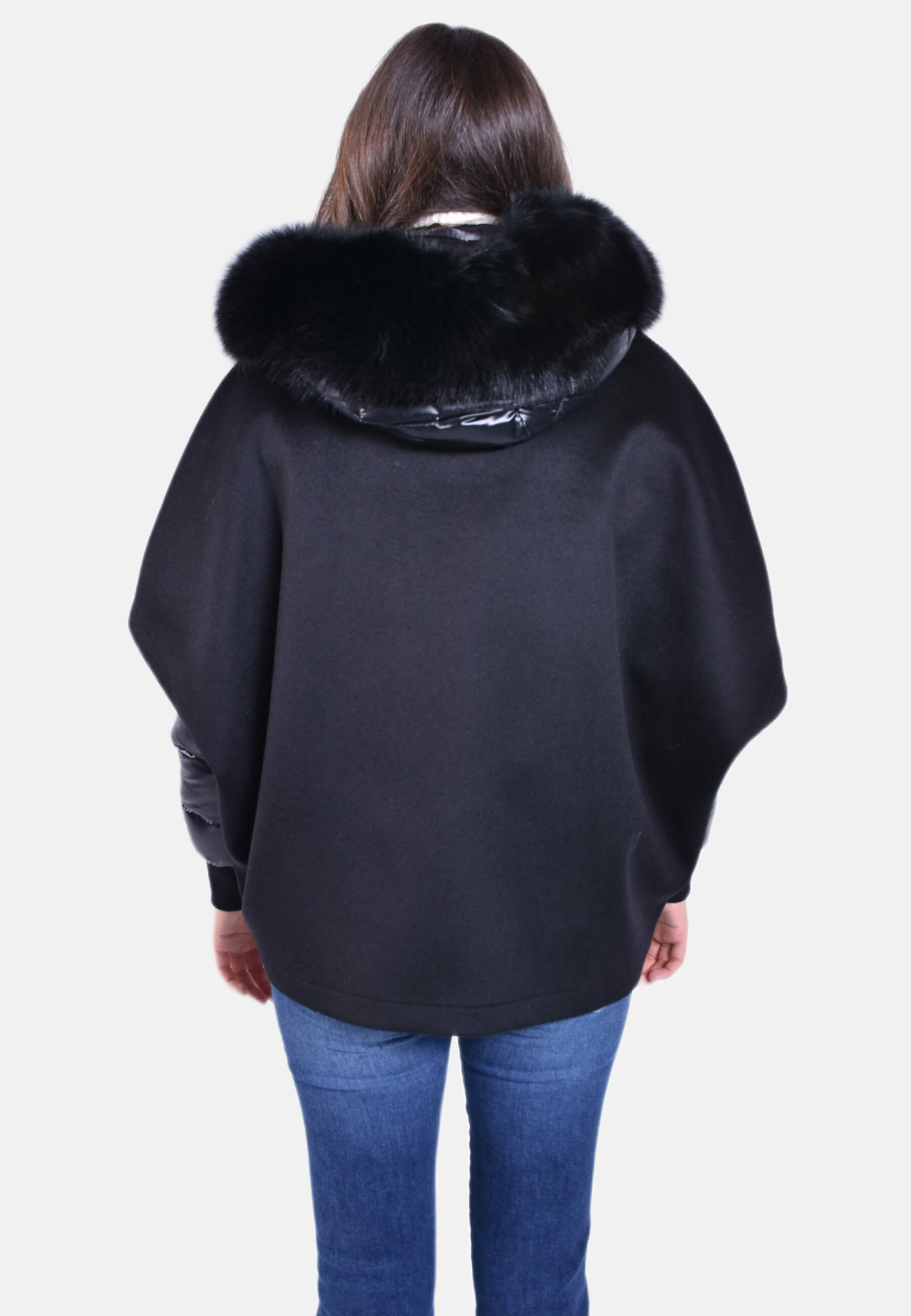Cappa corta in calda lana double misto cachemire con collo in maglia abbinata a giacca interna staccabile trapuntata in finissima piuma d’oca con maglia tubolare per polsi e elegante cappuccio rifinito con bordo in vera volpe, realizzata in finissimo nylon 20 denari con delicate sfumature cangianti.