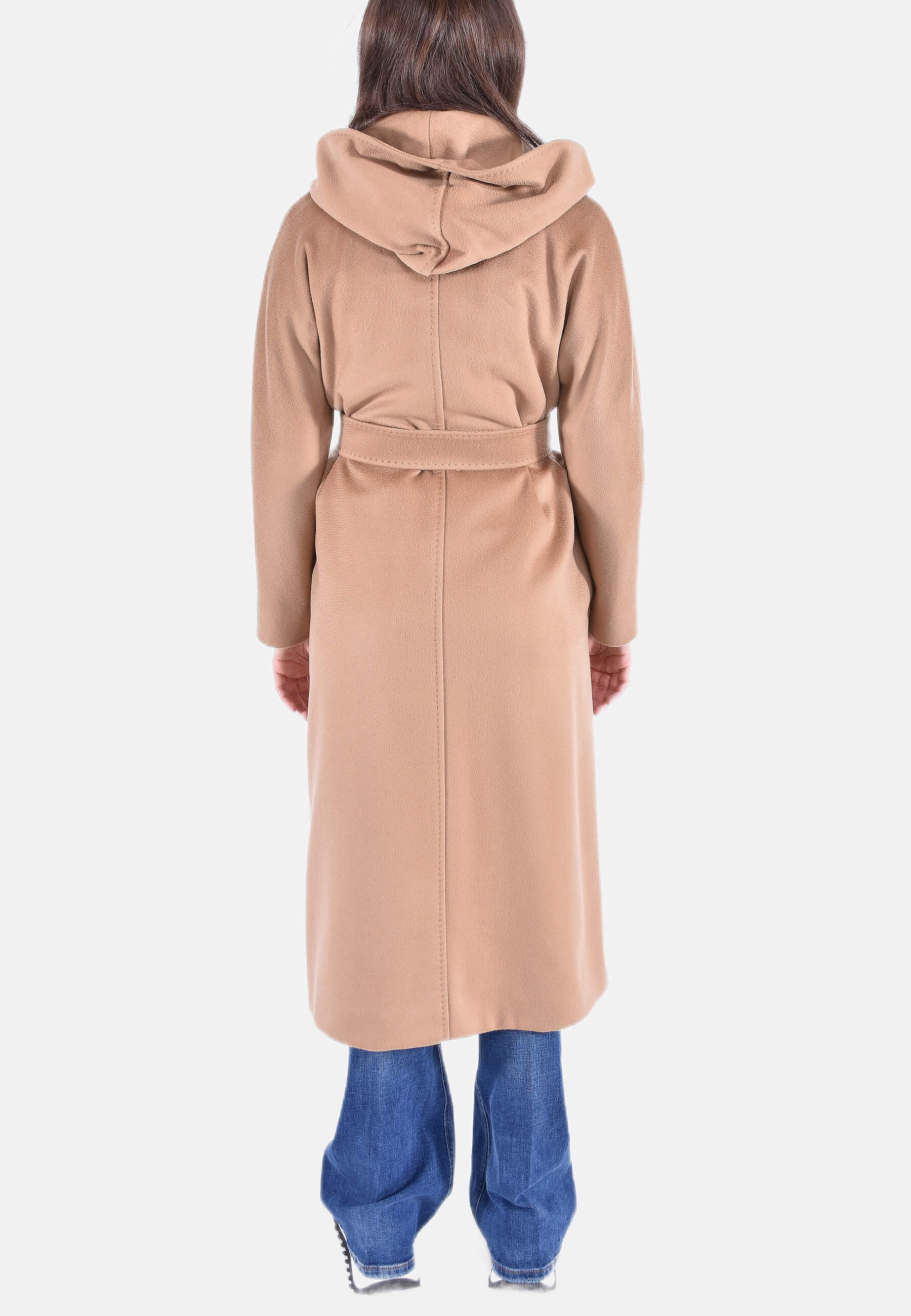 Cappotto in puro cashmere con cappuccio, maica a kimono e cintura abbinata.