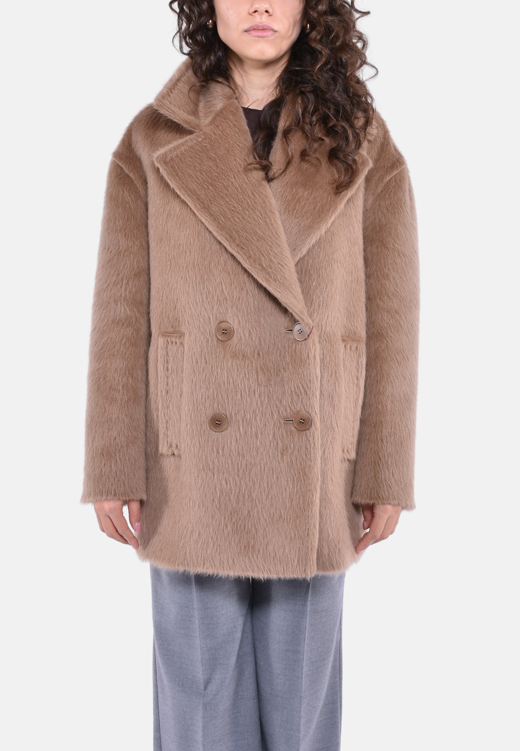 Cappotto caban doppiopetto, realizzato in pregiato e soffice tessuto di alpaca suri a pelo lungo. Il modello è caratterizzato da collo a rever, maniche lunghe a giro basso e tasche a filettone sui fianchi. Chiusura con bottoni a vista.
