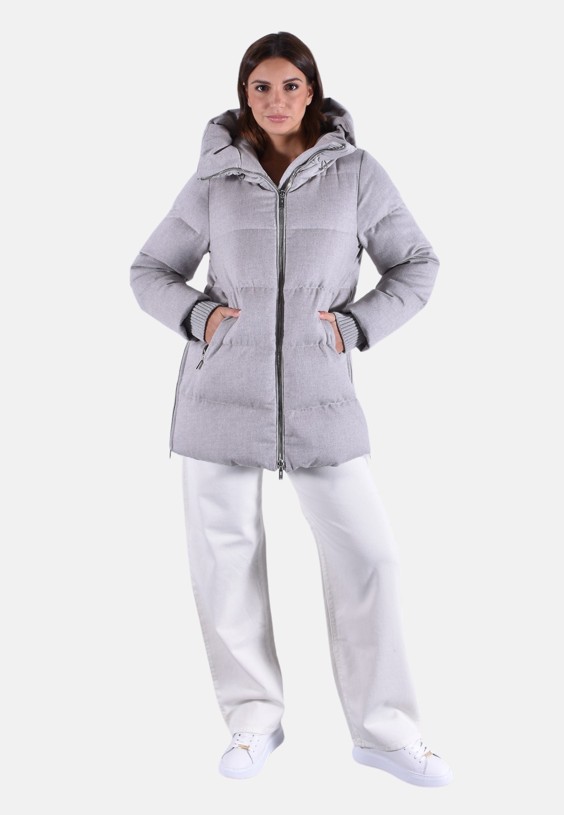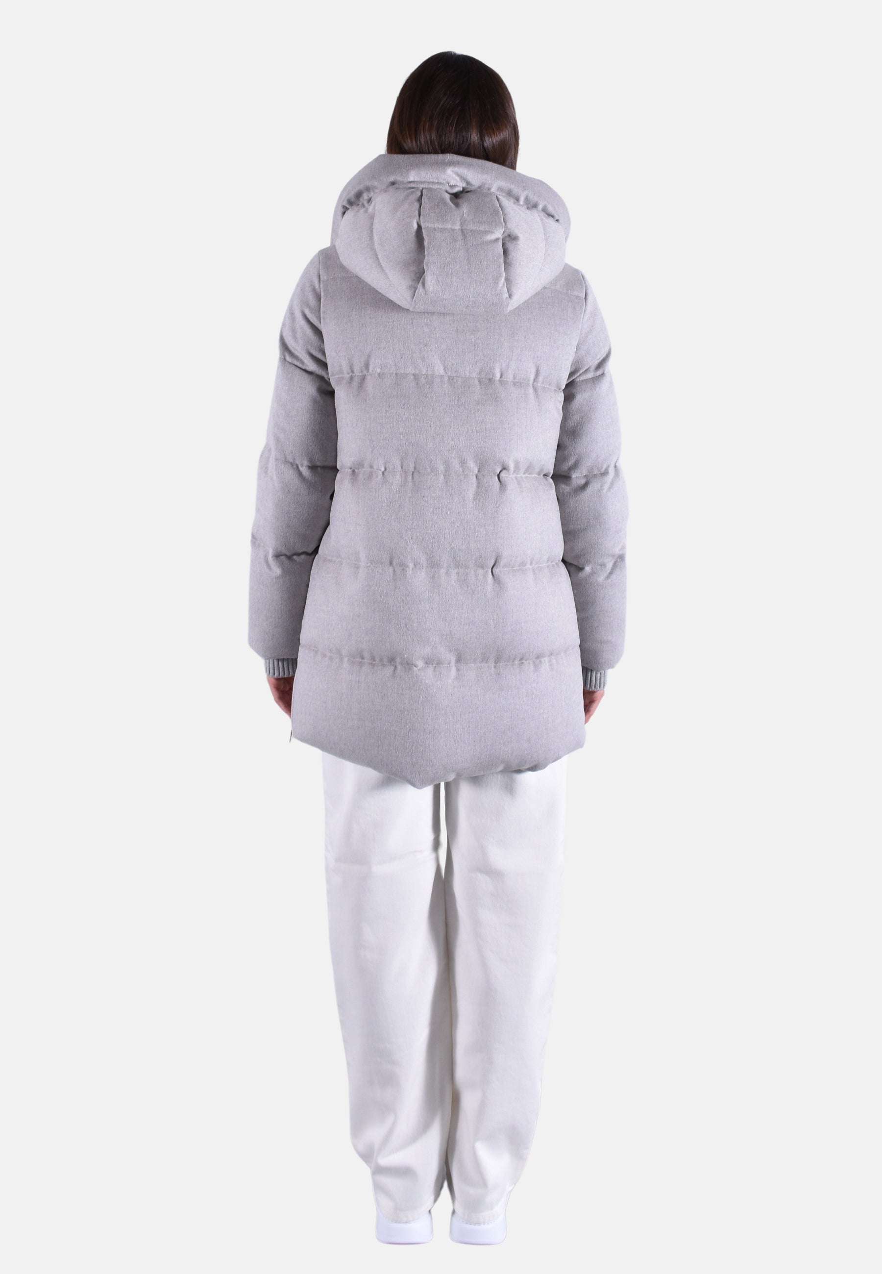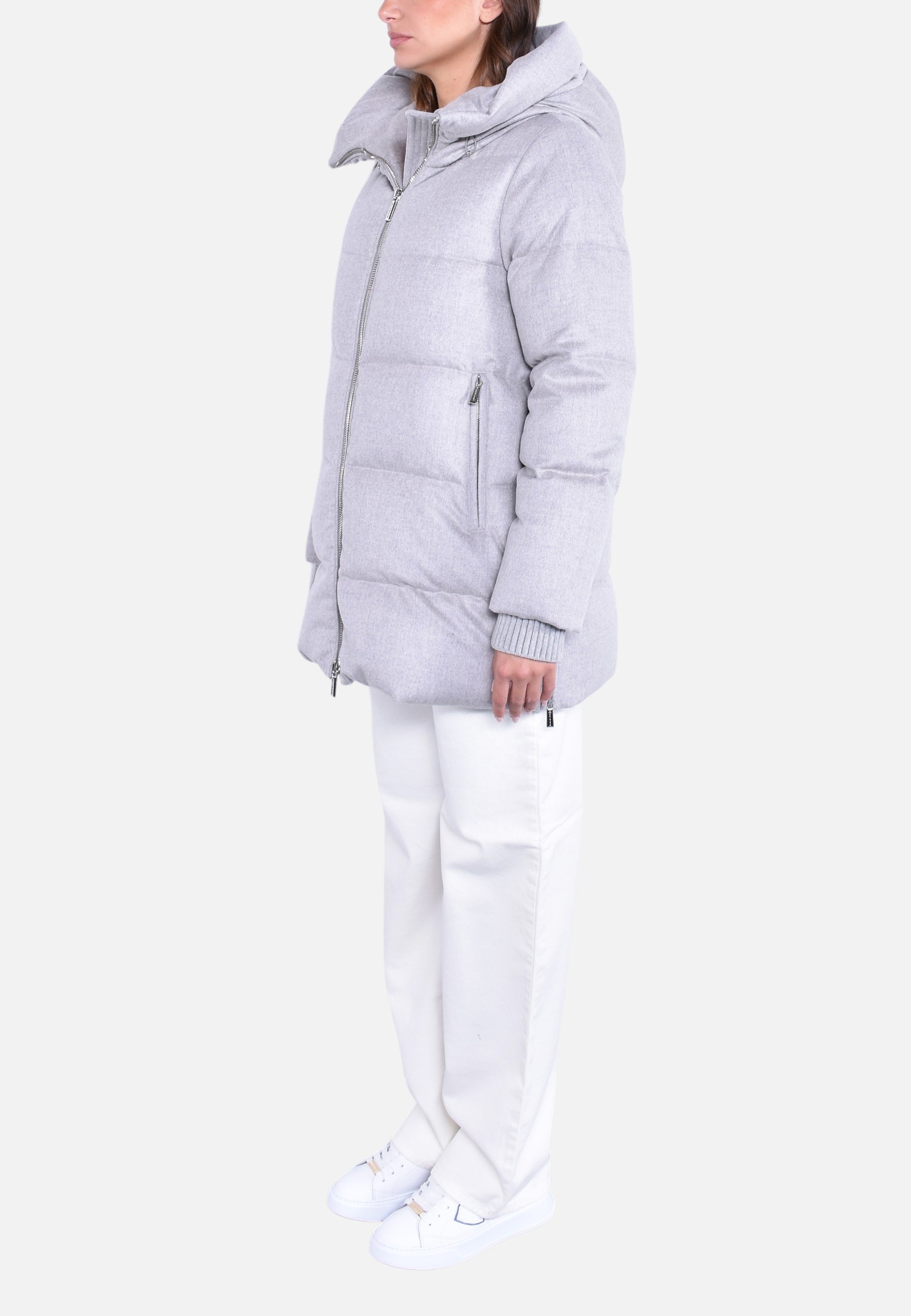 Cappotto dalla linea essenziale e pulita, connubio perfetto tra praticità ed eleganza. Realizzato con un esclusivo tessuto in lana dalla texture soffice e vellutata, contrastato con un tessuto di nylon cangiante che si adatta a qualsiasi look. Imbottito in soffice piuma d'oca e trapuntato ad ampi boudin.