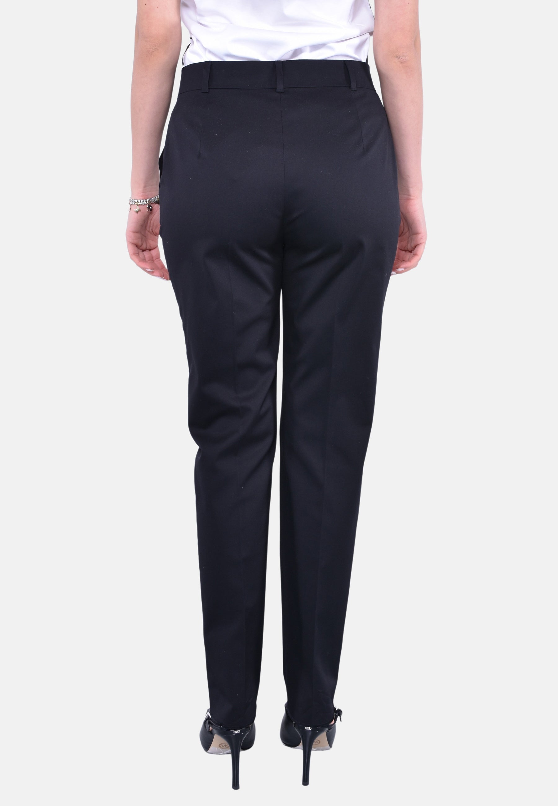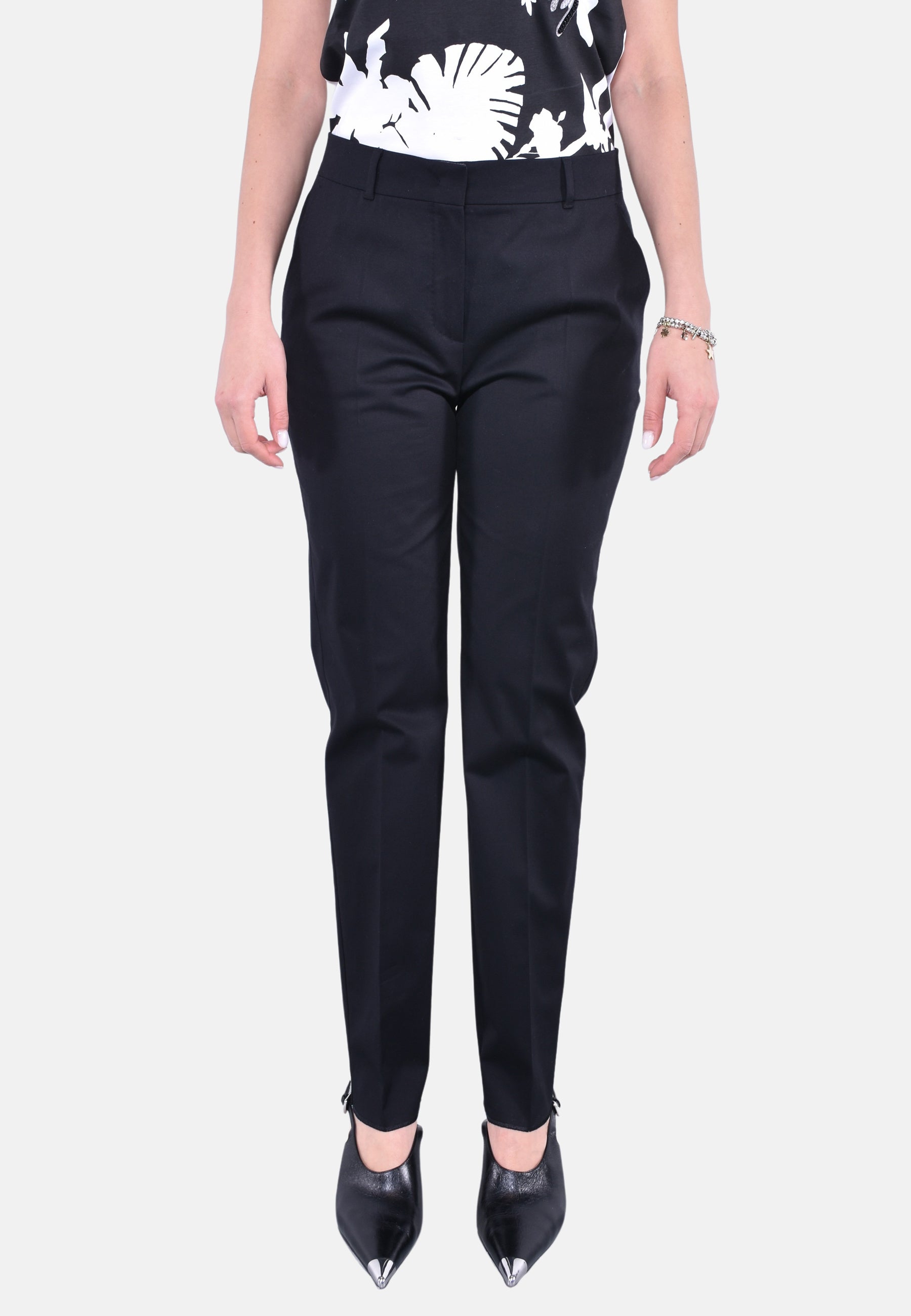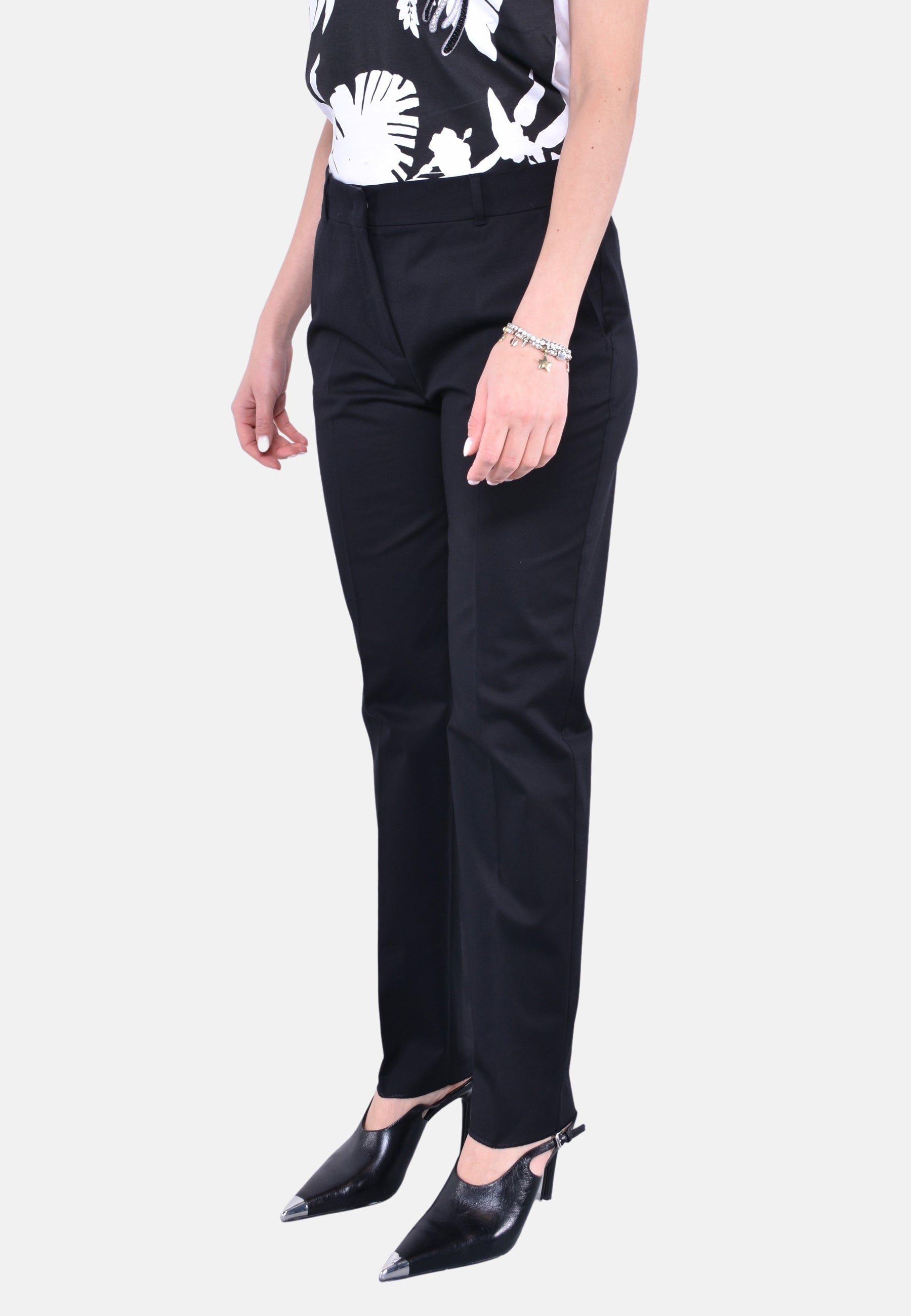 Pantalone a sigaretta, realizzato in morbida gabardina di cotone stretch. Il modello è completato da tasche alla francese sui fianchi, piega stirata e passanti in vita. Chiusura con listino alto in vita, zip con patta e gancetto.