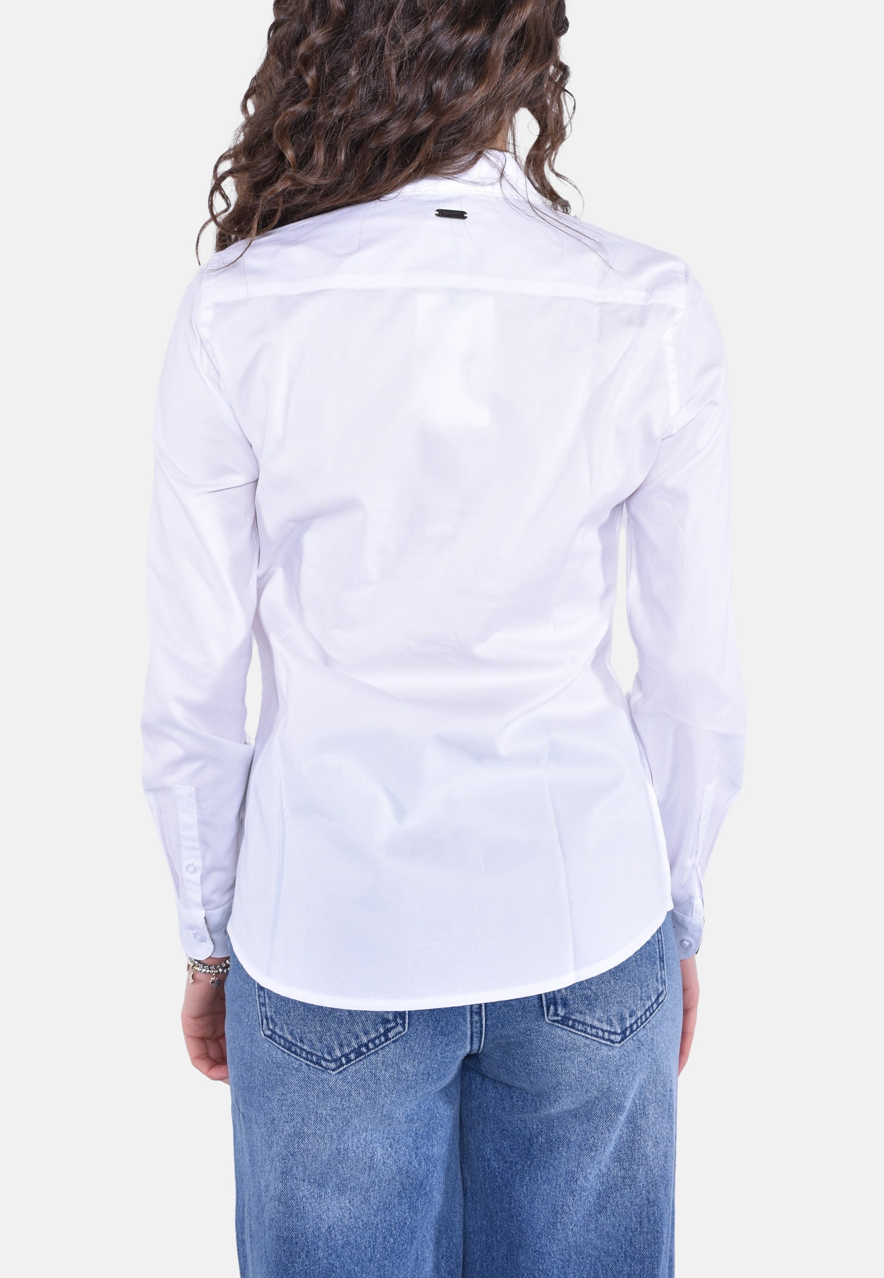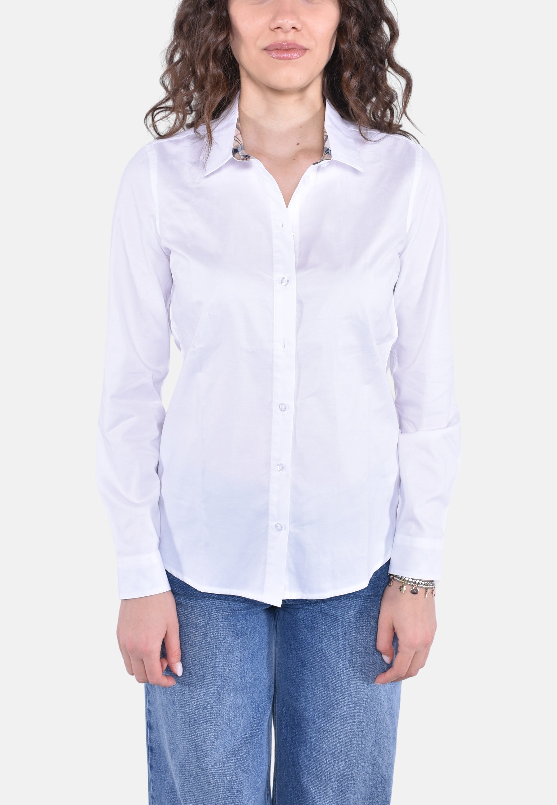 Realizzata in un morbido tessuto di cotone oxford, questa elegante camicia è impreziosita da dettagli che aggiungono un tocco di femminilità e freschezza per la nuova stagione. Il capo è caratterizzato da pinces sul busto, doppia abbottonatura sui polsini e un rivestimento tartan Barbour all'interno del colletto e dei polsini.