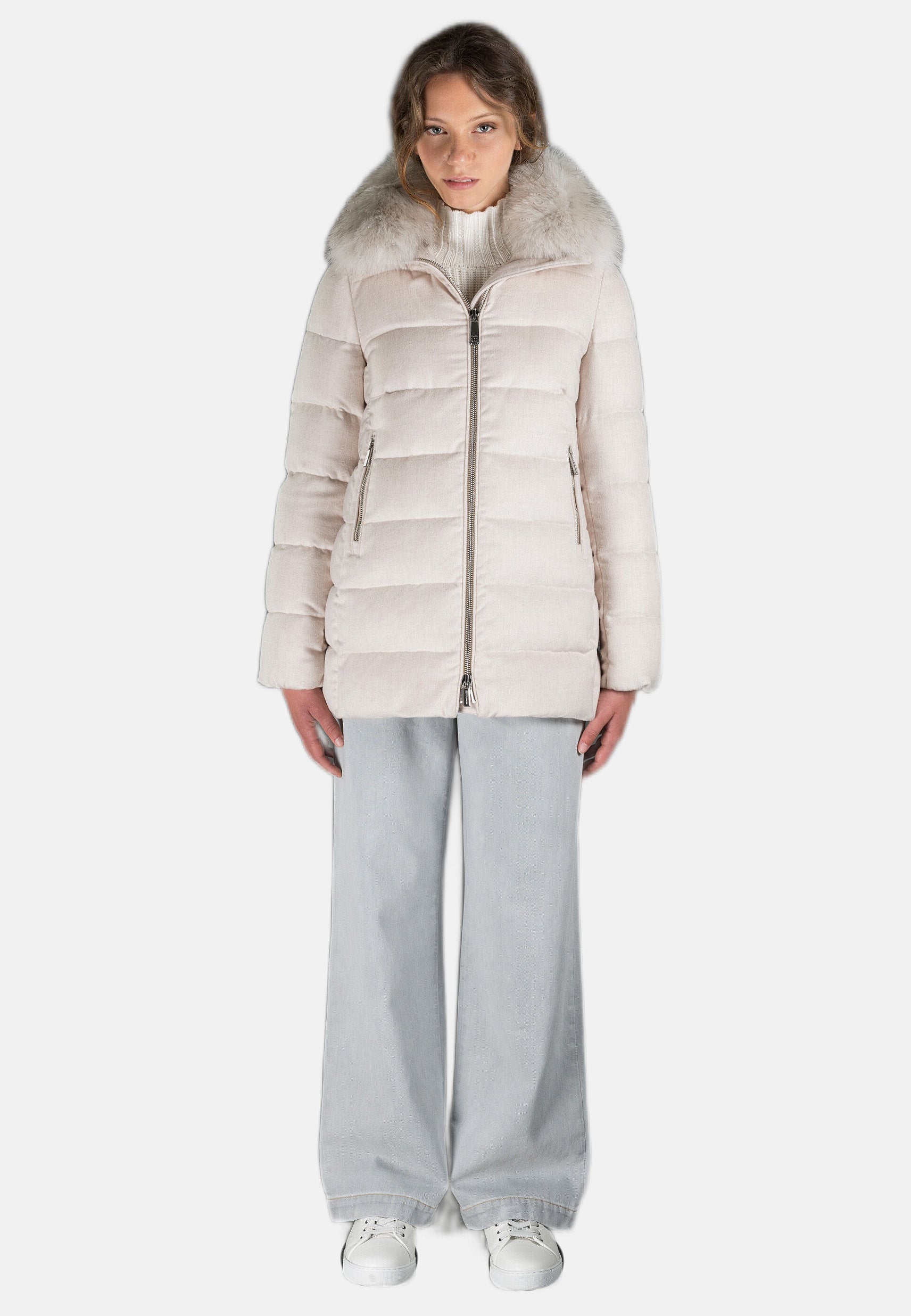 Cappottino dalla raffinata linea a trapezio realizzato in pregiata flanella australiana extrafine mista a cashmere, imbottito in finissima piuma d’oca e trapuntato a boudin.