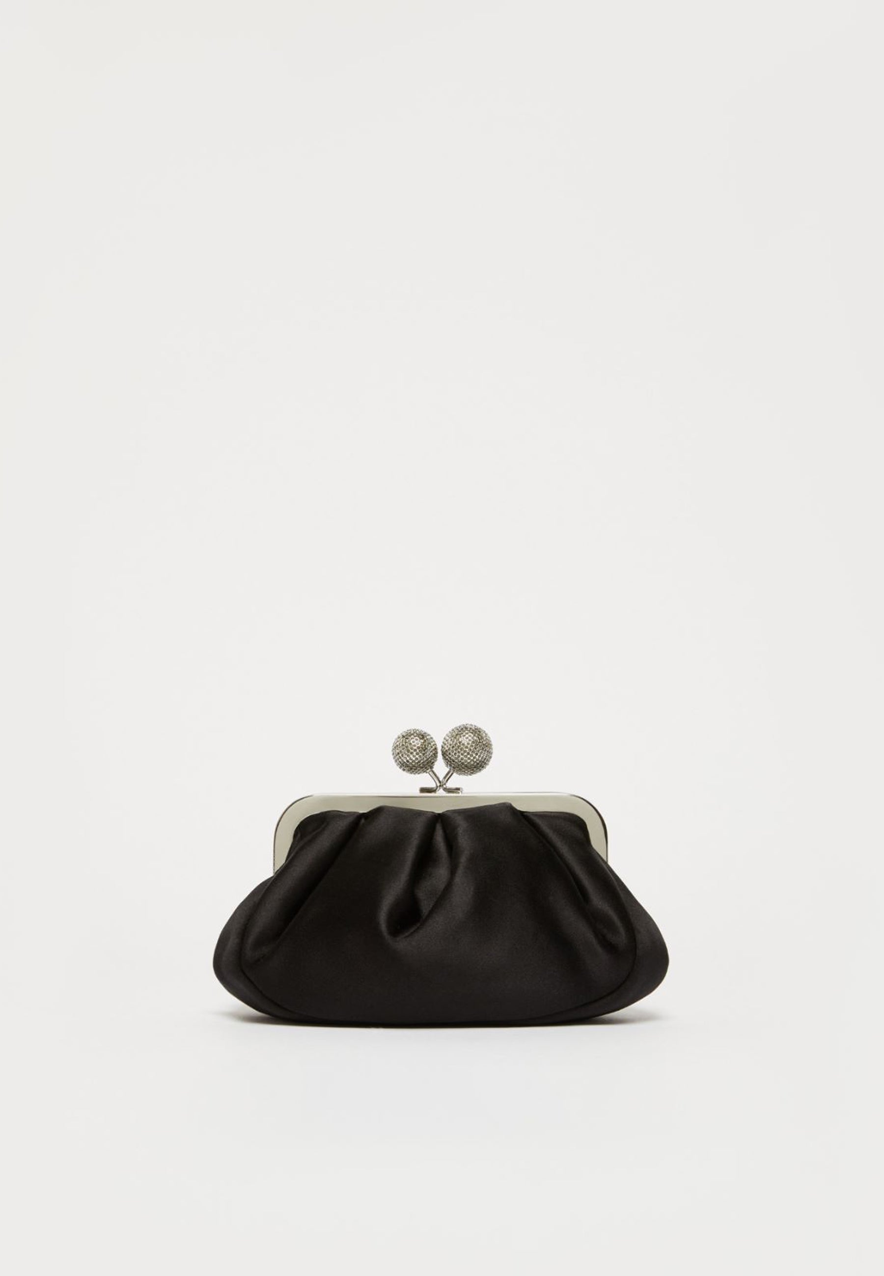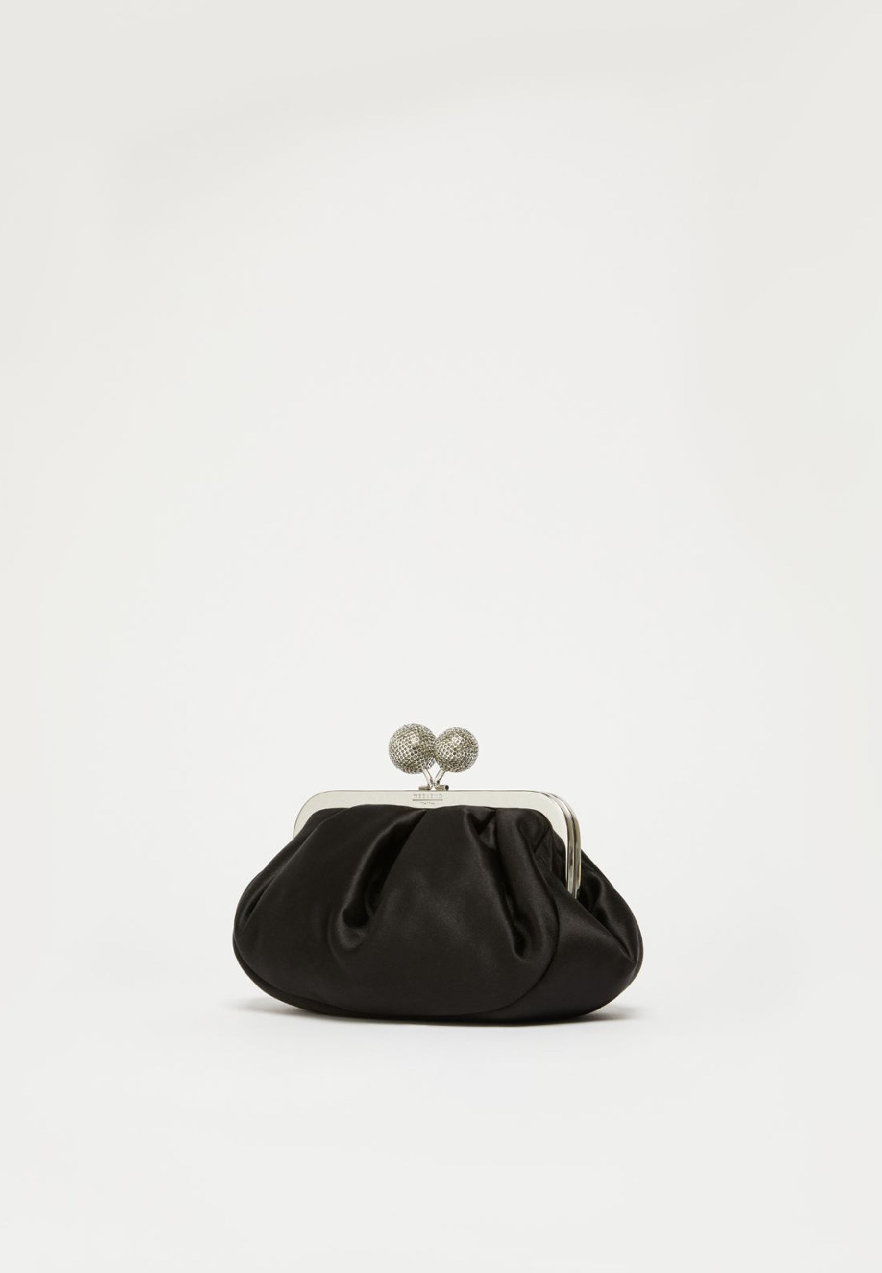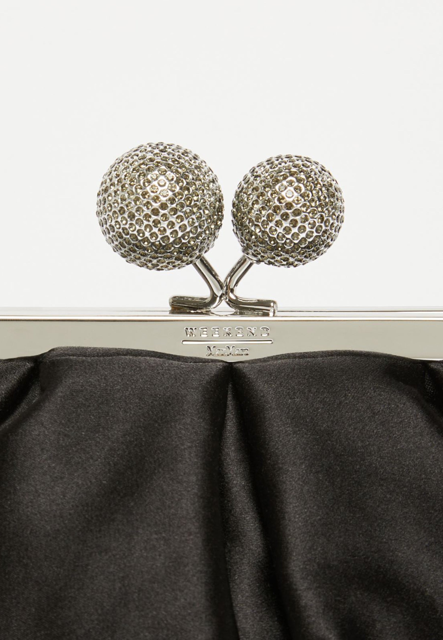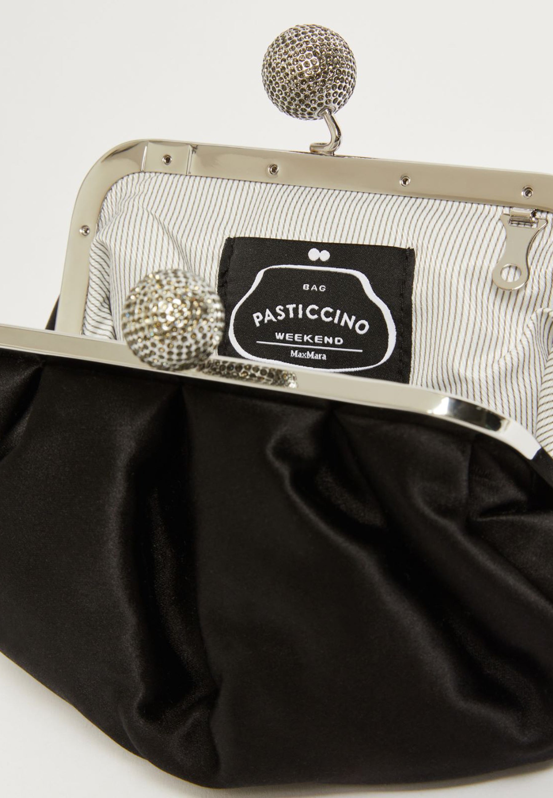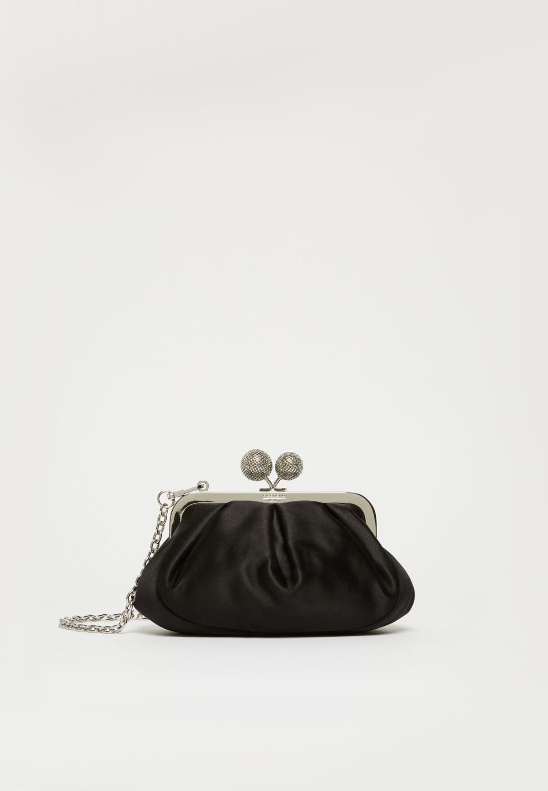 Pasticcino Bag Small, la super clutch per dare un tocco personale e affascinante al tuo stile quotidiano. Interamente realizzata in raso di viscosa e seta, è impreziosita da boules ricoperte con pavé di strass e interno in twill a righe con comoda tasca portaoggetti. La tracolla lunga rimovibile a catena, con spallaccio in pelle, permette di indossare la borsa cross body o a mano, per un outfit versatile e di tendenza. Iconica chiusura clutch e label personalizzata all'interno. Dimensioni: 19 x 10 x 15 cm.