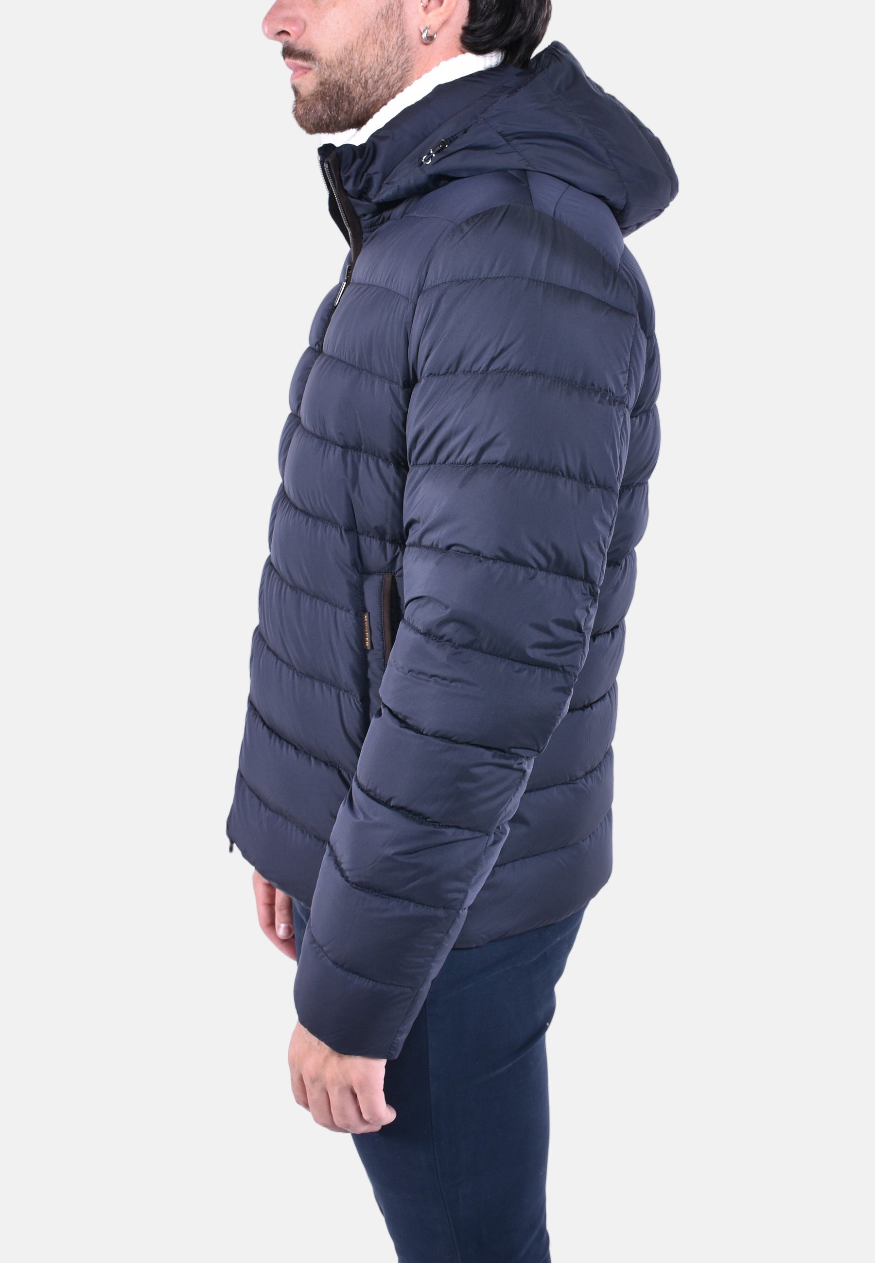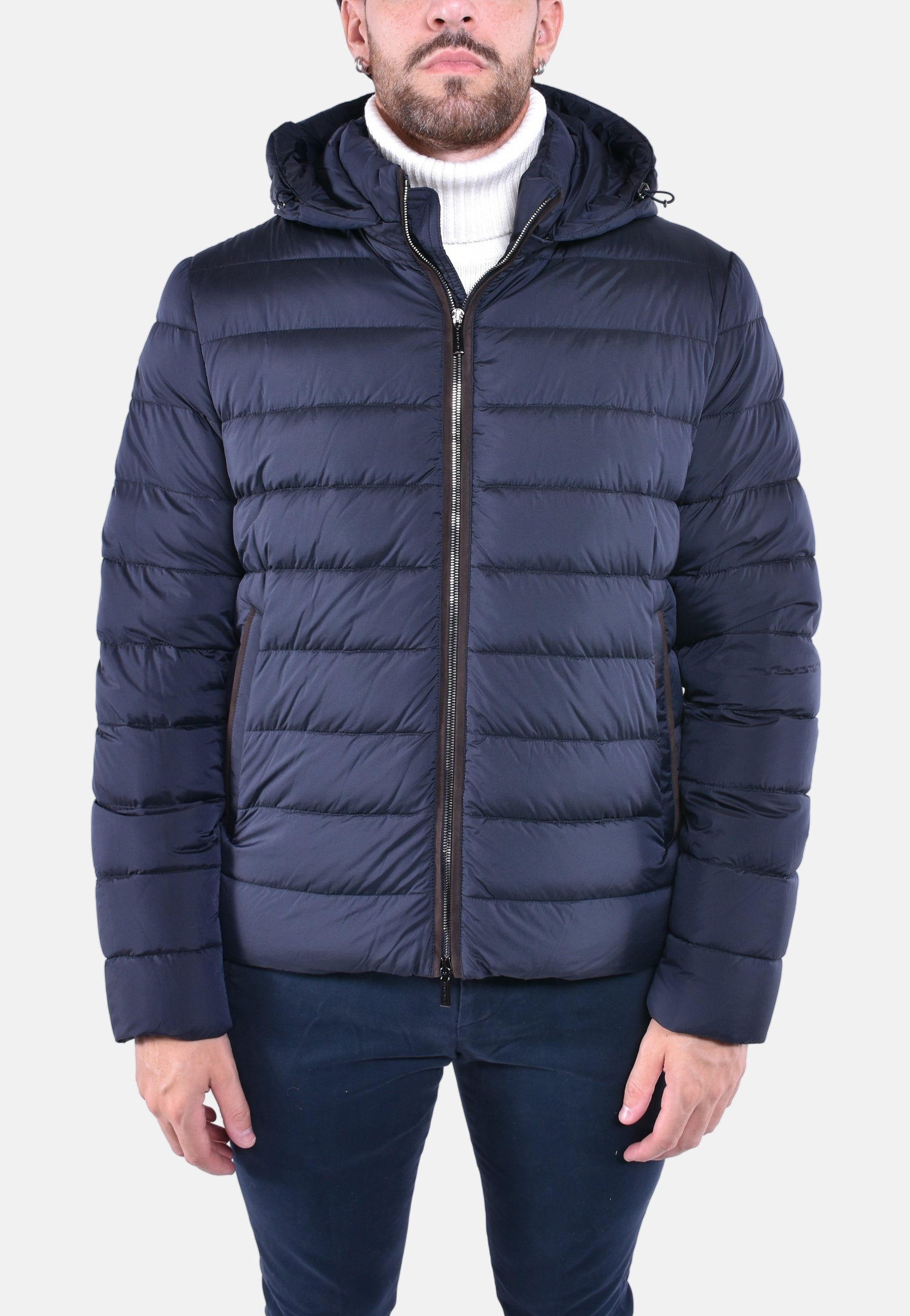 Piumino leggero appartenente alla linea Acqua (1 ombrellino), realizzato in elegante e raffinato tessuto tecnico idrorepellente con colorazione effetto cangiante, imbottito in piuma d'oca e trapuntato a boudin.