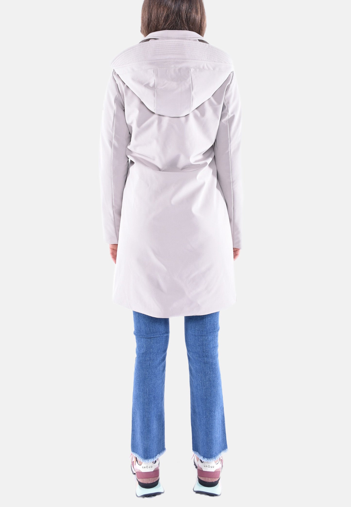 Giubbino in tessuto impermeabile e antivento. Imbottito in piuma d'anatra e con trapuntatura Chevron all'interno, ha un cappuccio staccabile con due bottoni a pressione e il colletto a punta. La chiusura con zip bidirezionale e bottoni a pressione è nascosta da una patta con due bottoni visibili per mantenere una linea minimal.