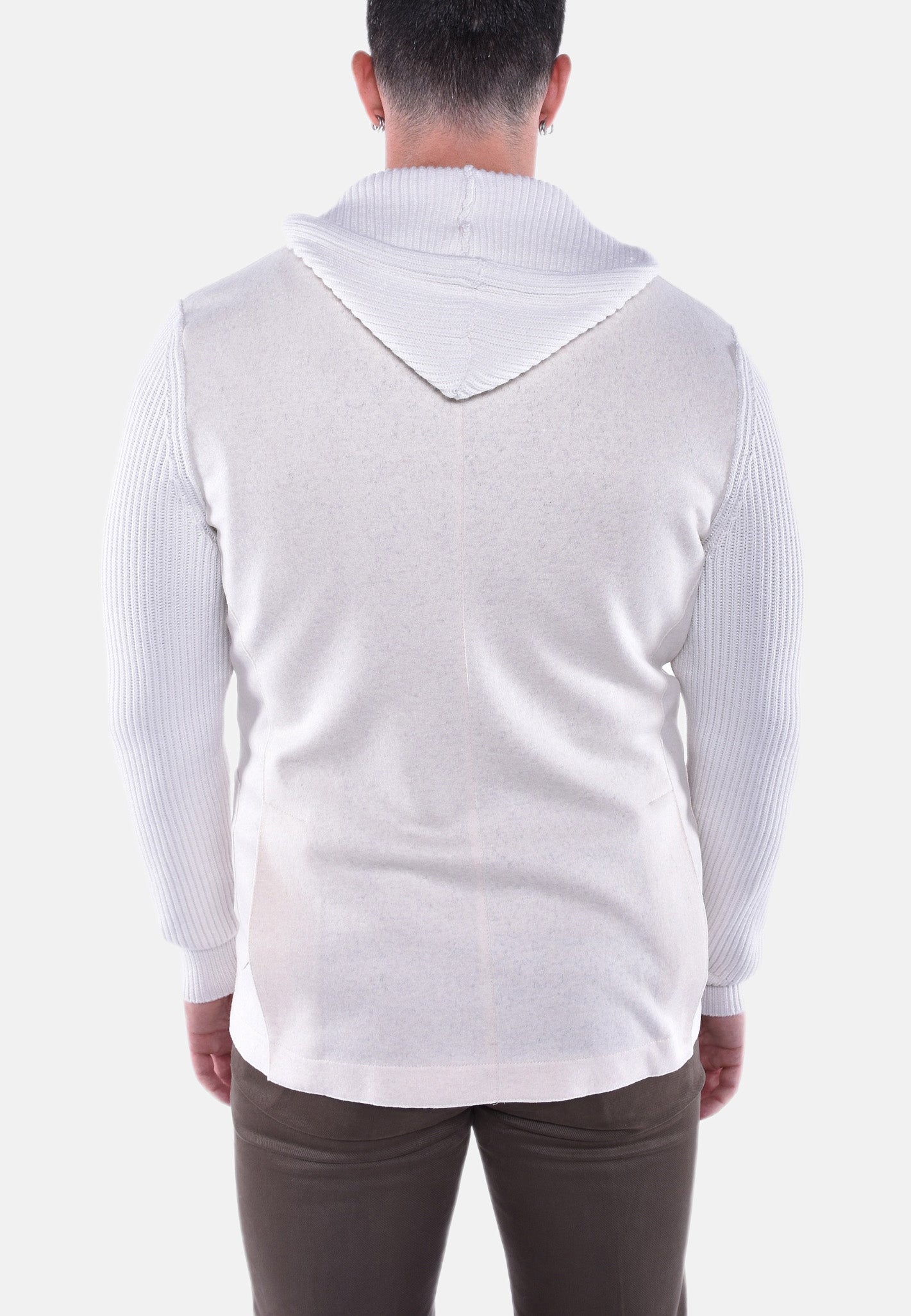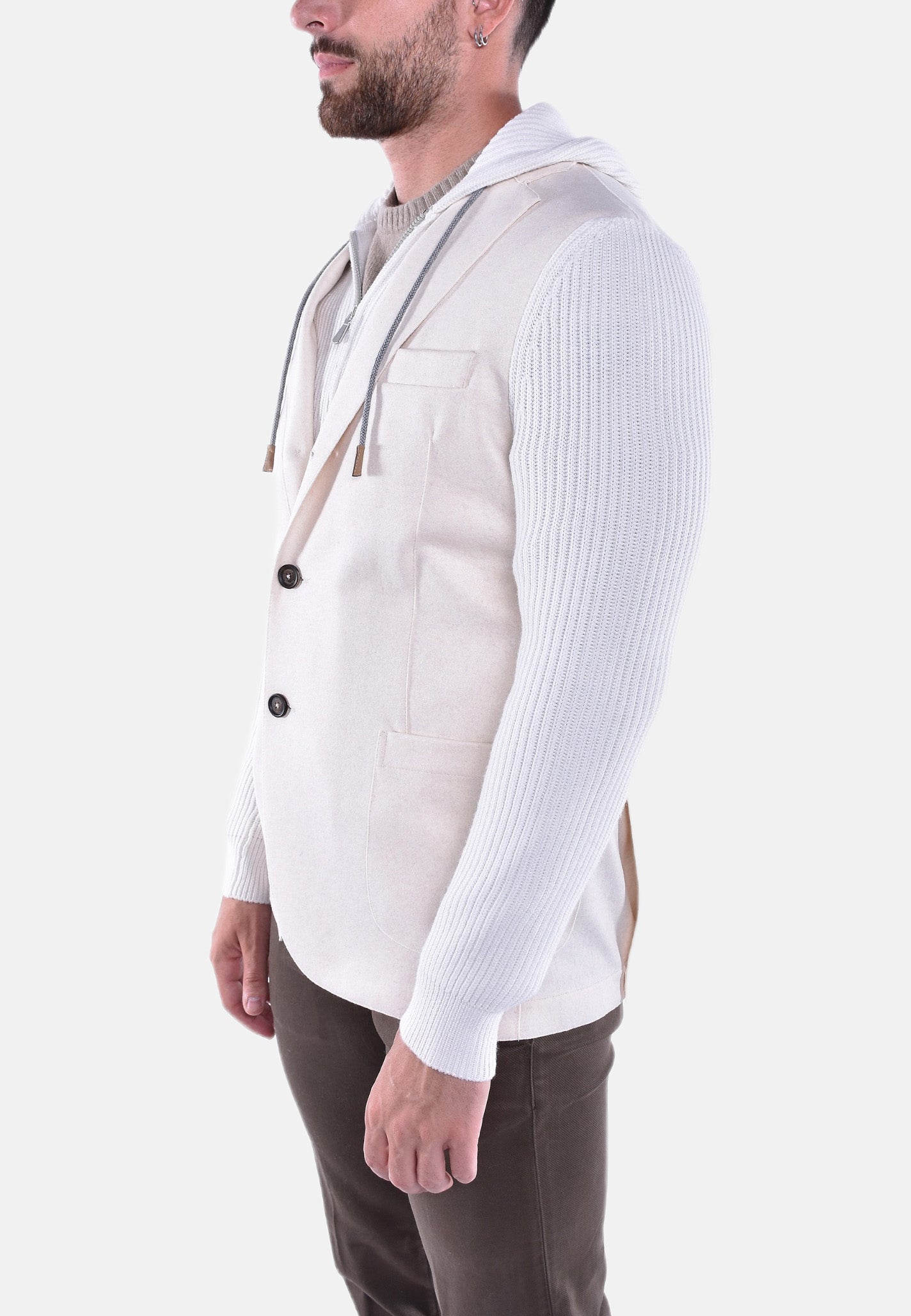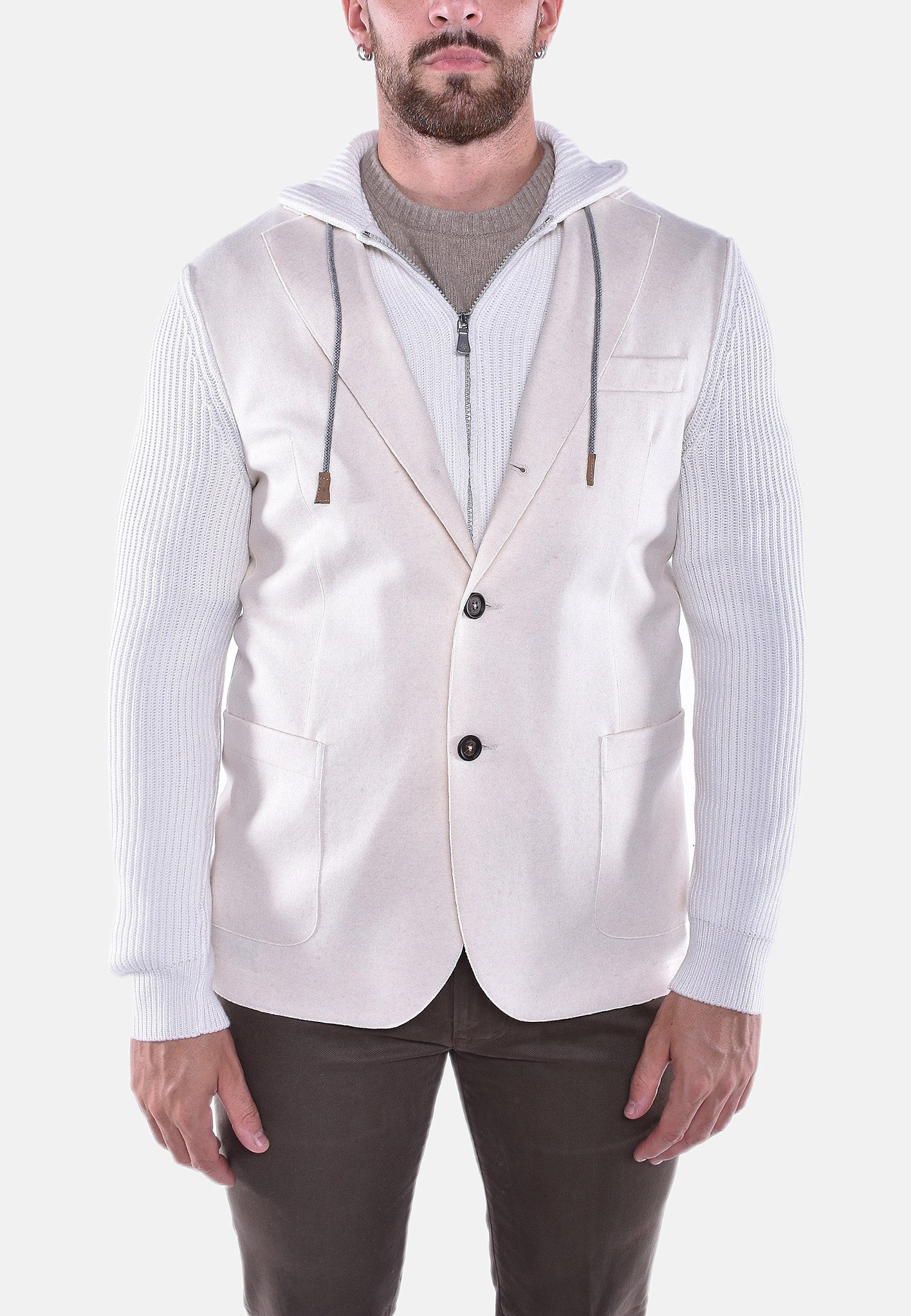 Giacca ELEVENTY realizzata in lana, Caratterizzata da pettorina con cappuccio removibile con zip. Revers a specchio. Chiusura monopetto con tre bottoni stiro. Due tasche frontali applicate ed una tasca sul petto a filetti.