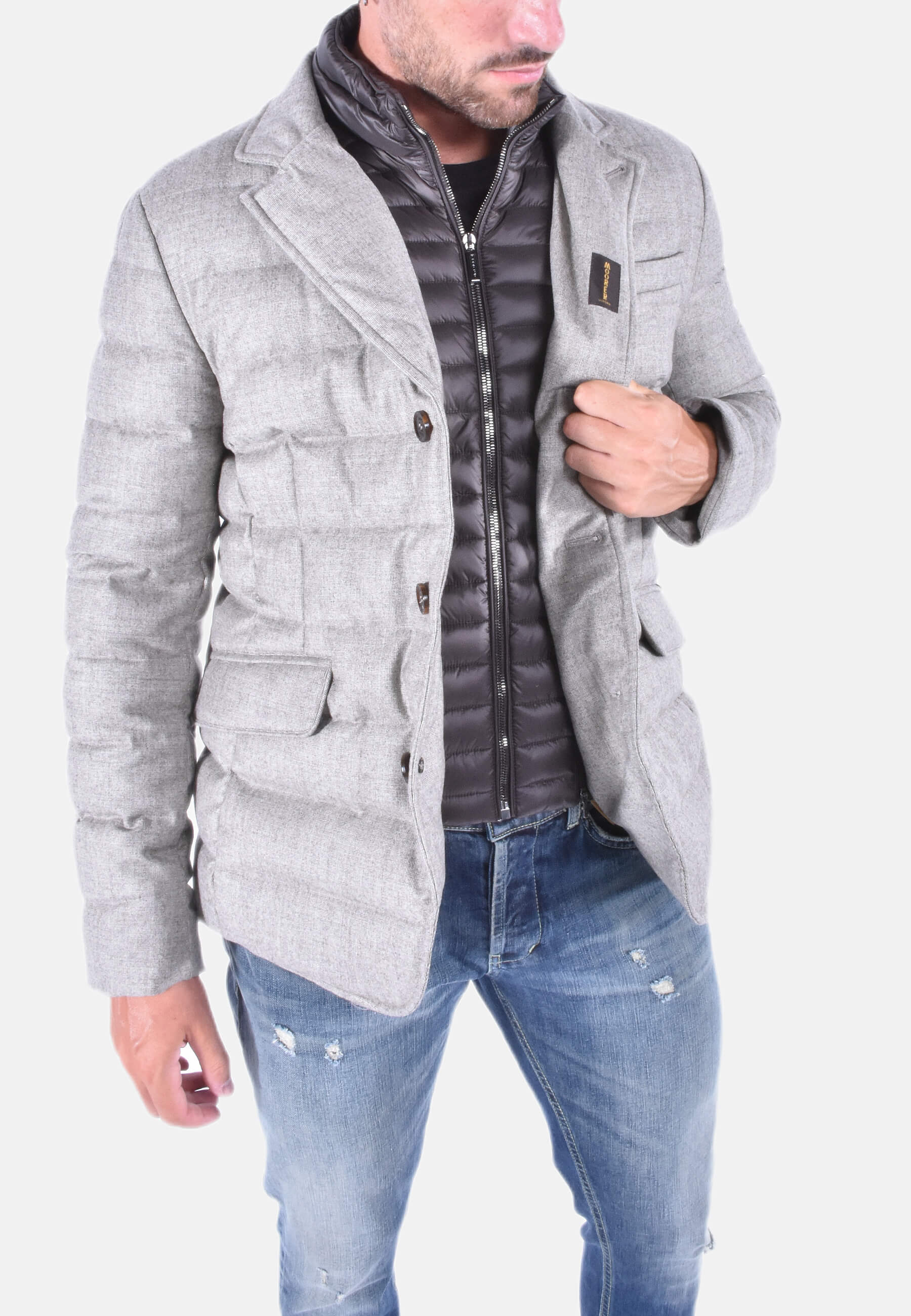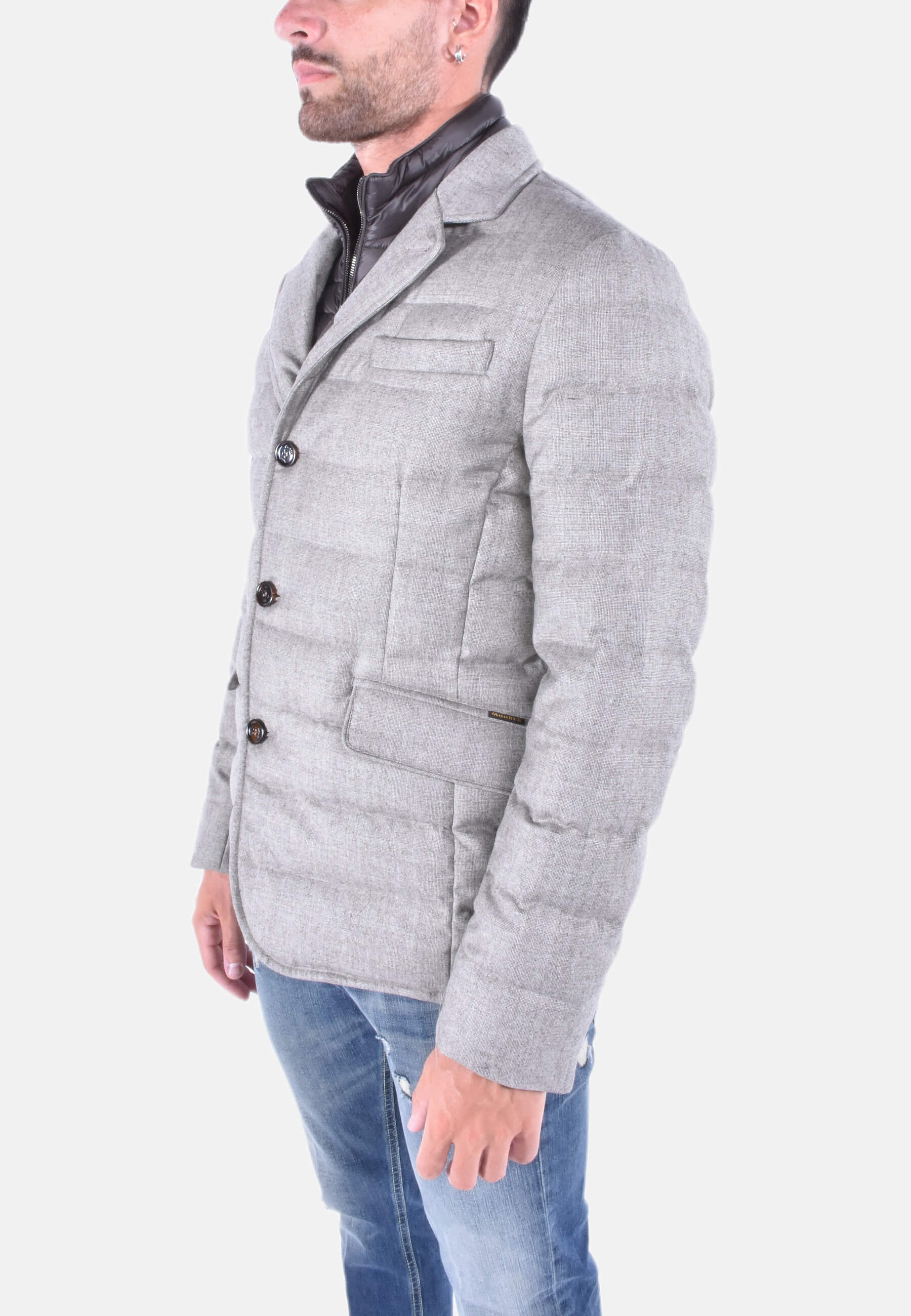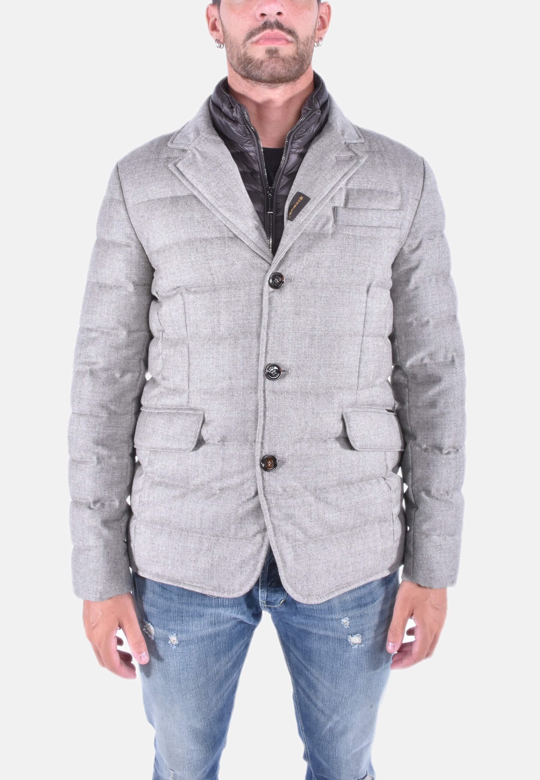 Giacca dalla linea dritta imbottita in piuma e trapuntata a boudin. Realizzata in morbida flanella di lana in micro fantasia.