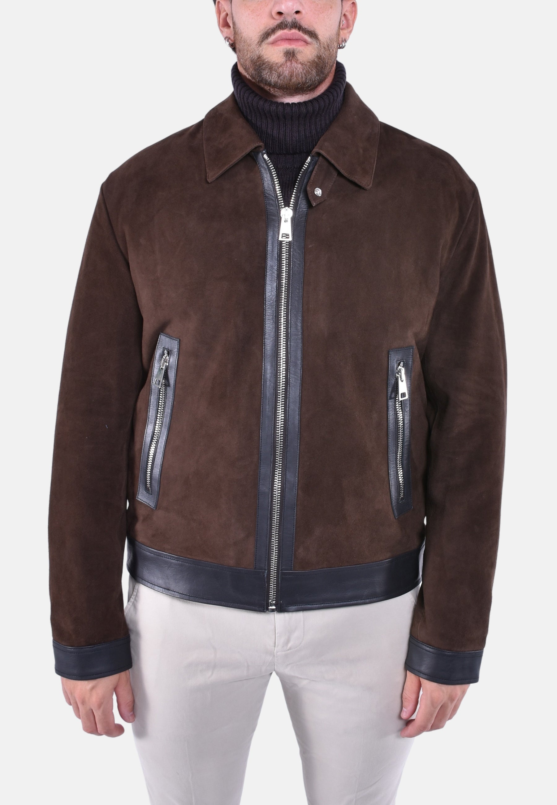 Biker regular foderato con leggera trapunta. zippato con collo e polsi a camicia e con dettagli in vitello. Camoscio. Logo Dondup. Made in Italy