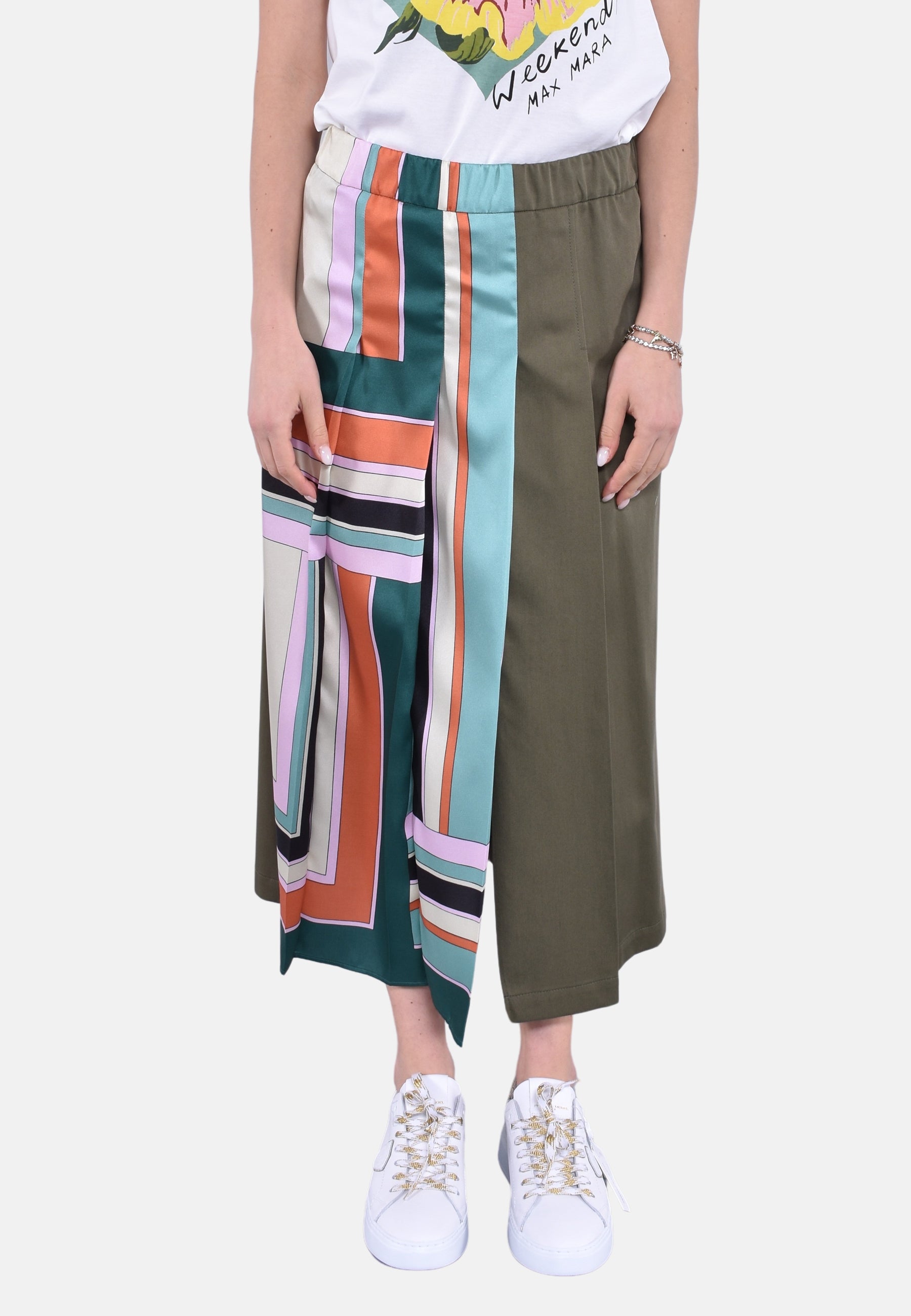Gonna midi realizzata in twill stampato e gabardina di cotone tinta unita. Il modello è caratterizzato da una costruzione a pannelli a pieghe plissé con vita elasticizzata e spacco centrale sul davanti. Rifinita da tasca a filetto verticale con bottone sul fianco sinistro e tasca applicata con patta e bottone sul retro, lato destro indossato.