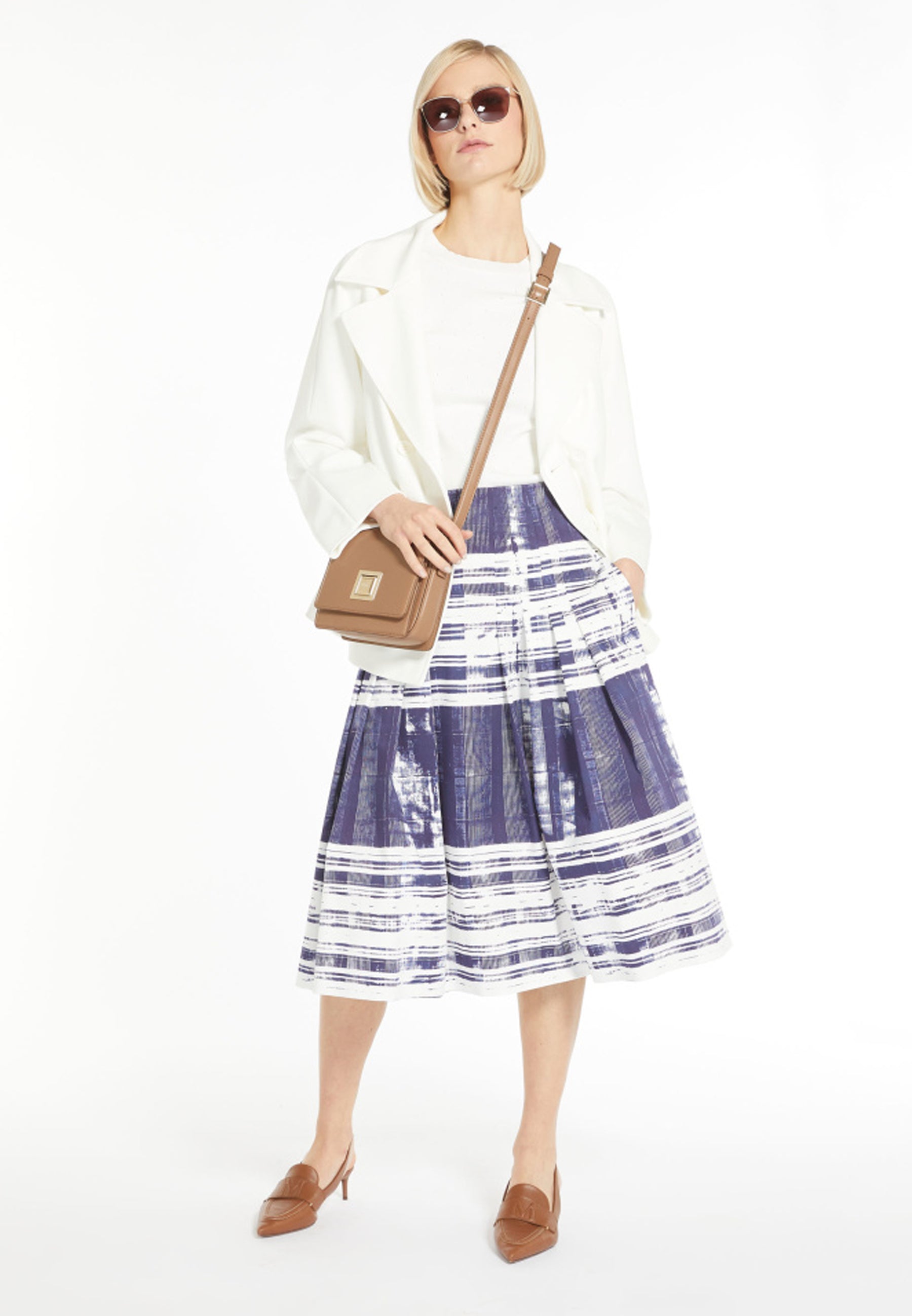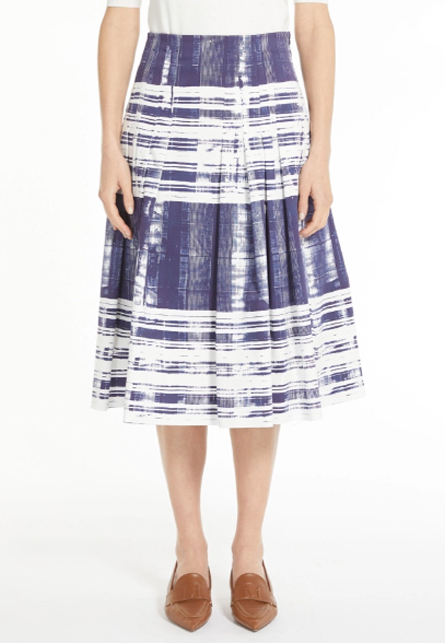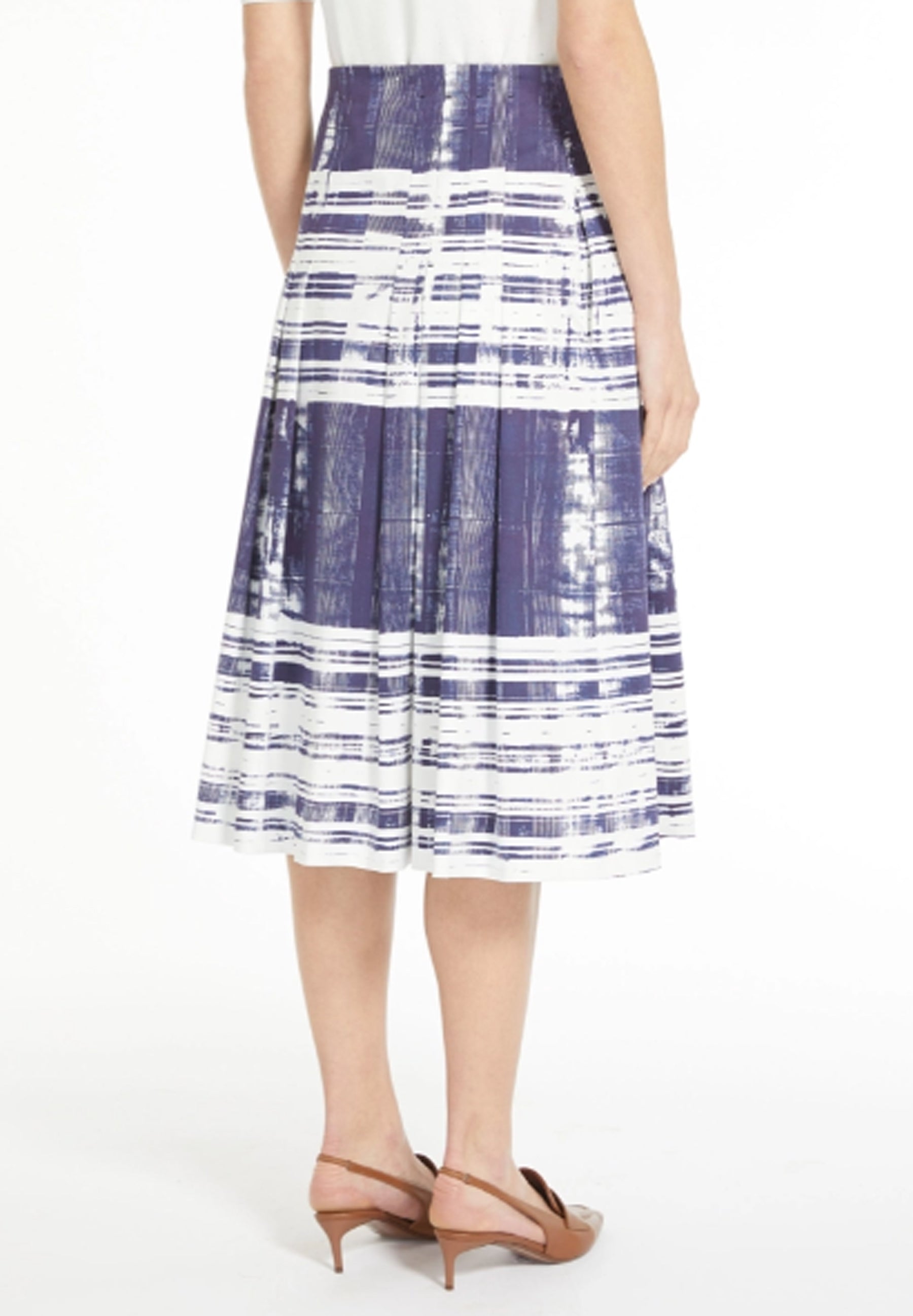 Gonna midi in raso di cotone con motivo a righe e chiusura con zip laterale. Modello a trapezio con pieghe.