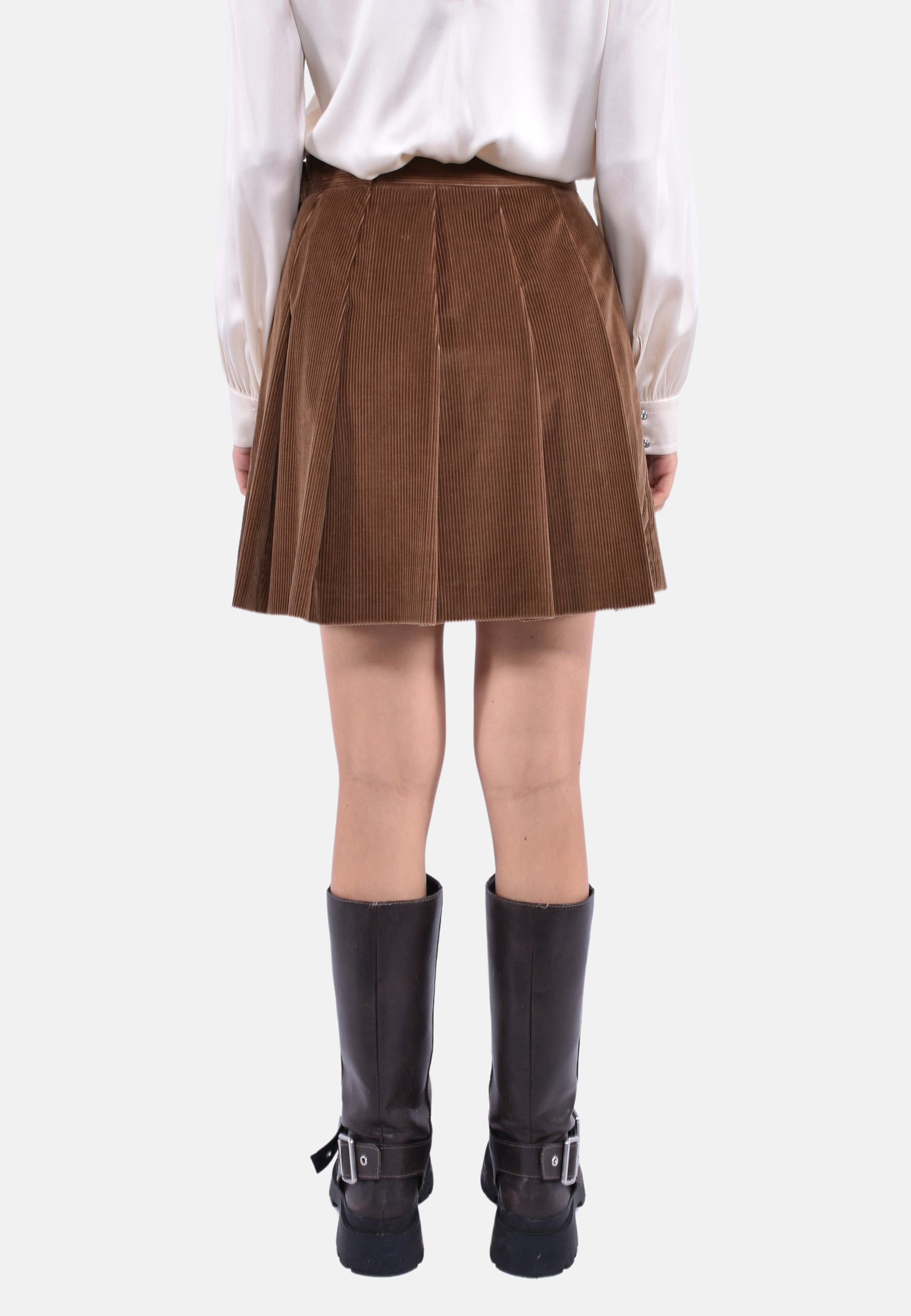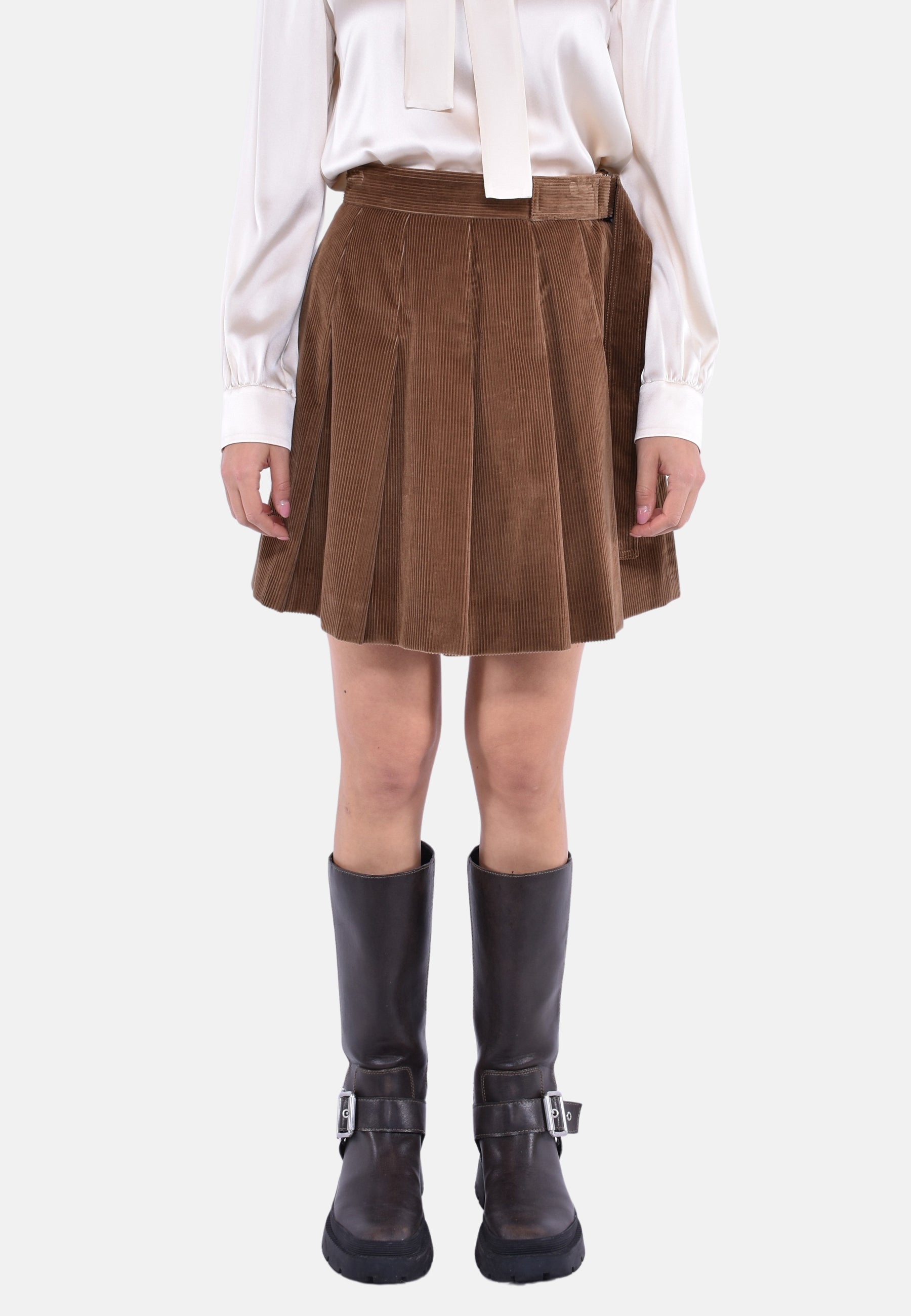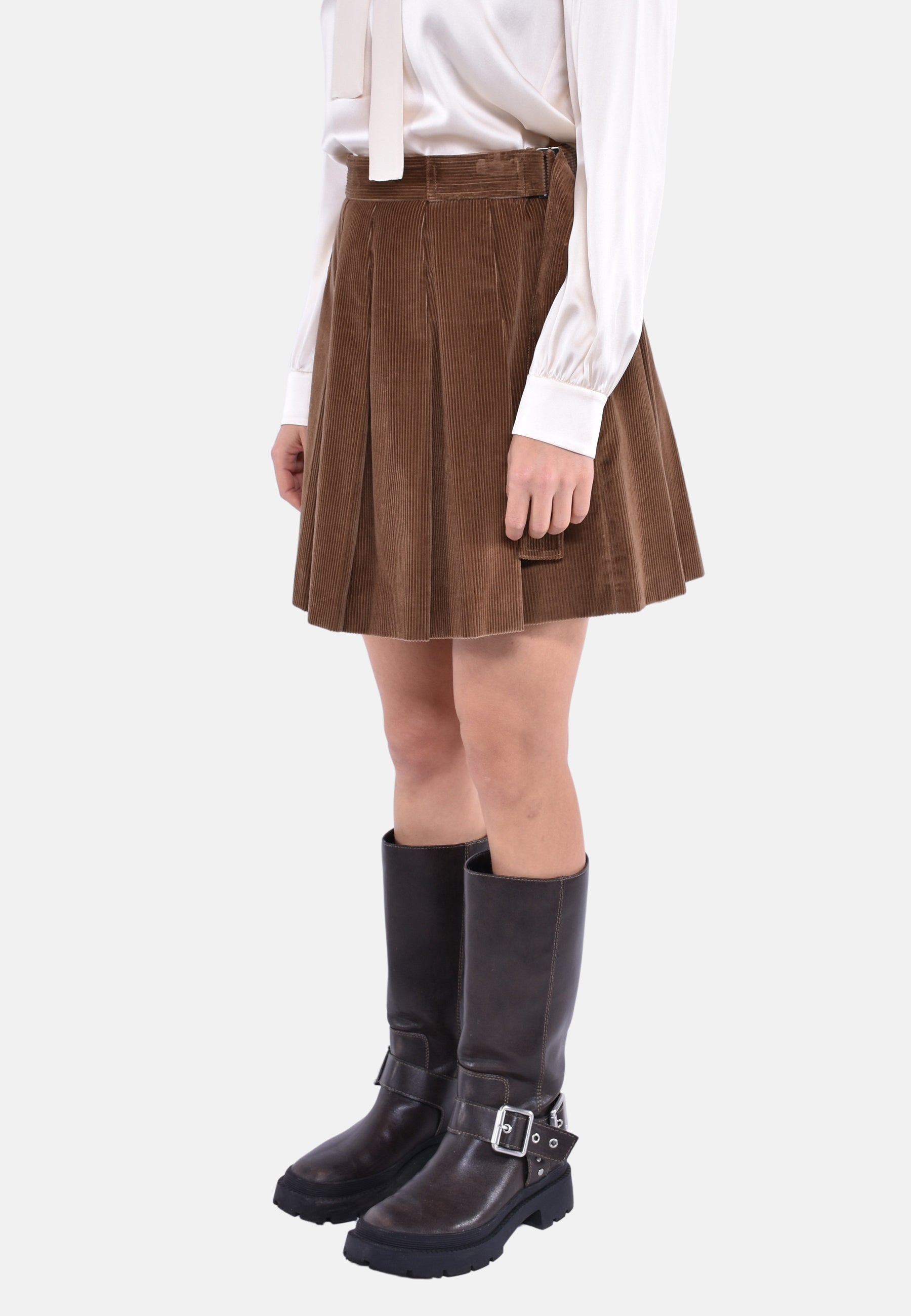 Gonna corta in velluto cinquecento righe di puro cotone, caratterizzata da linea leggermente svasata e motivo a pieghe. Modello foderato con cinturino impunturato e fibbia ad anello in vita. Chiusura con zip invisibile sul fianco sinistro.