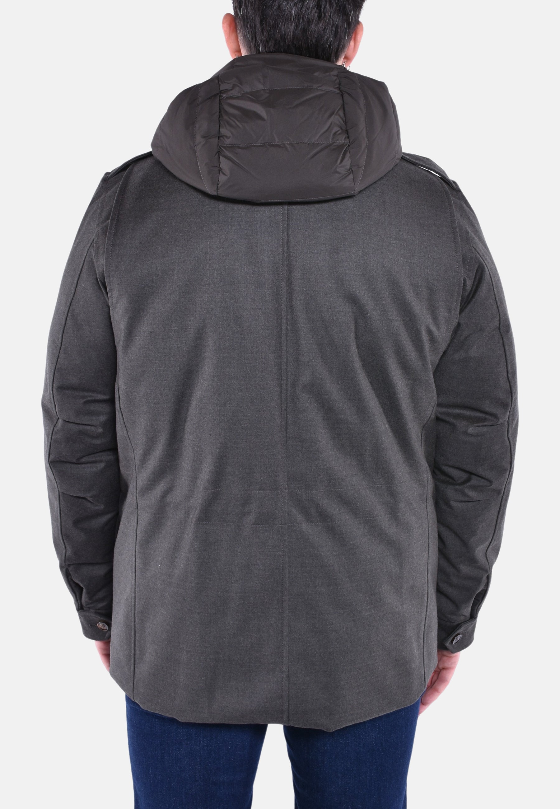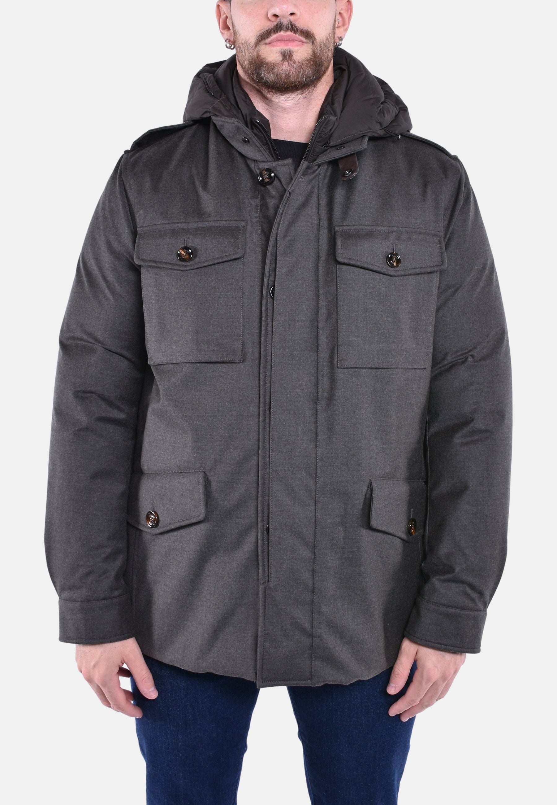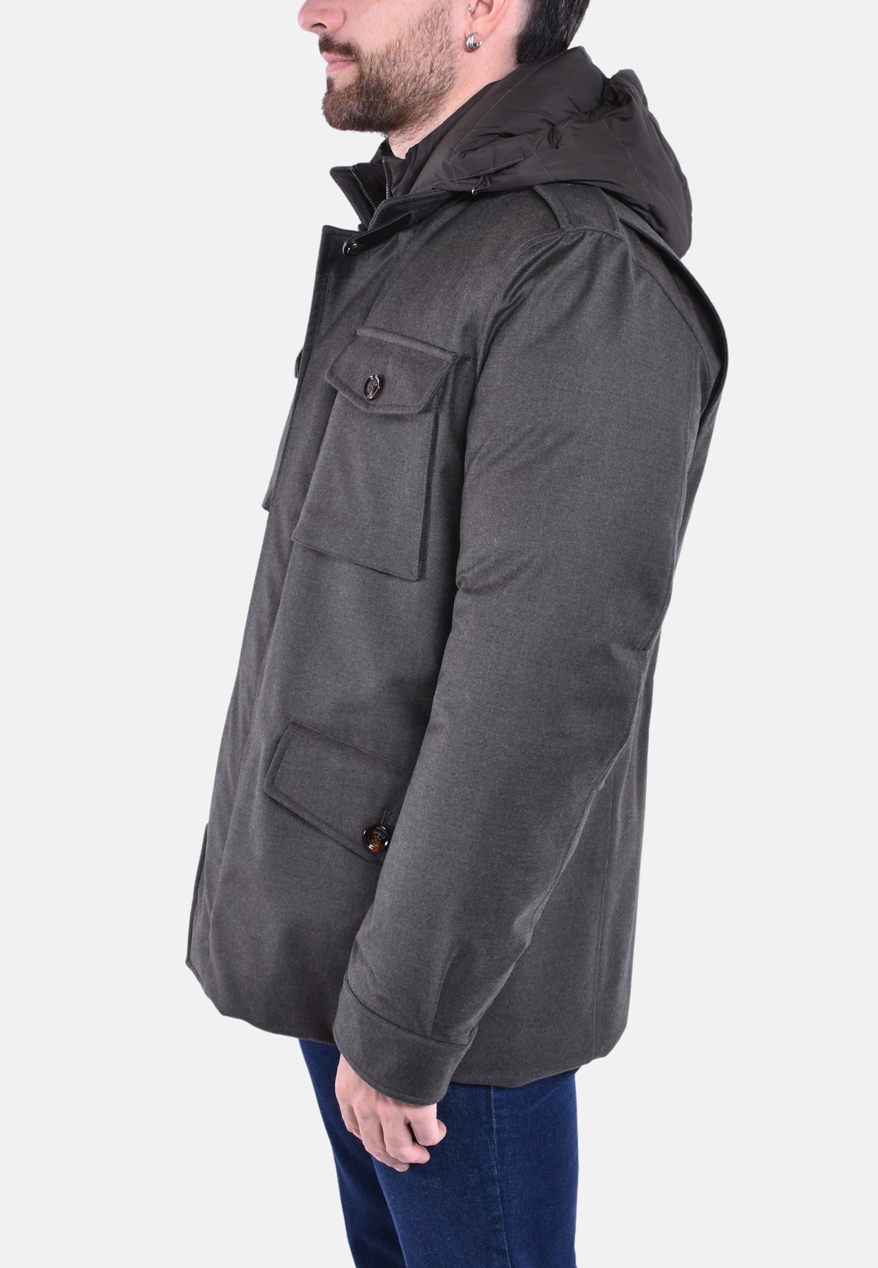 Sahariana liscia appartenente alla linea Acqua (2 ombrellini), imbottita in piuma d'oca. Realizzata in flanella di lana vergine e cashmere accoppiata a una membrana traspirante e waterproof, leggera e confortevole.
