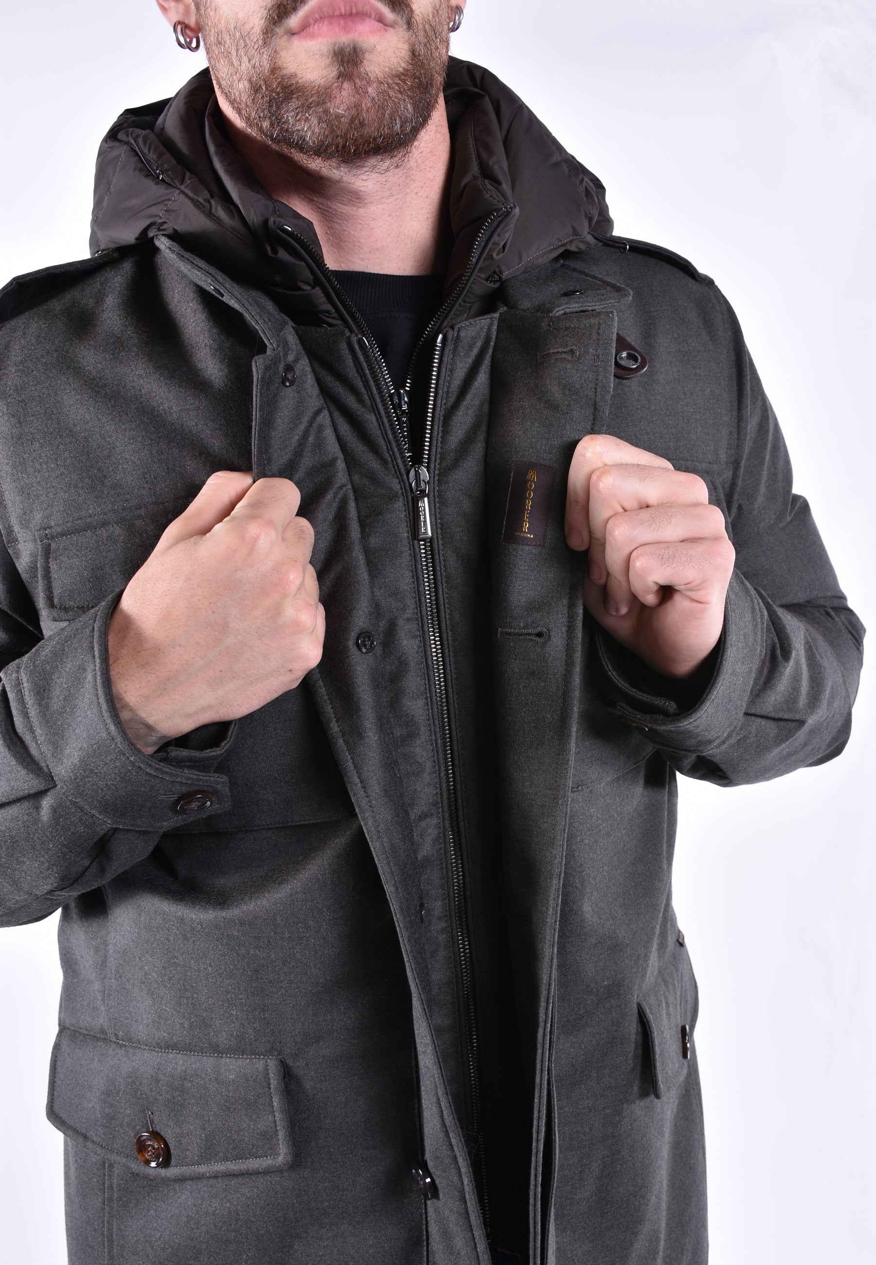 Il modello è alto 186 cm e indossa una taglia MooRER IT 48.