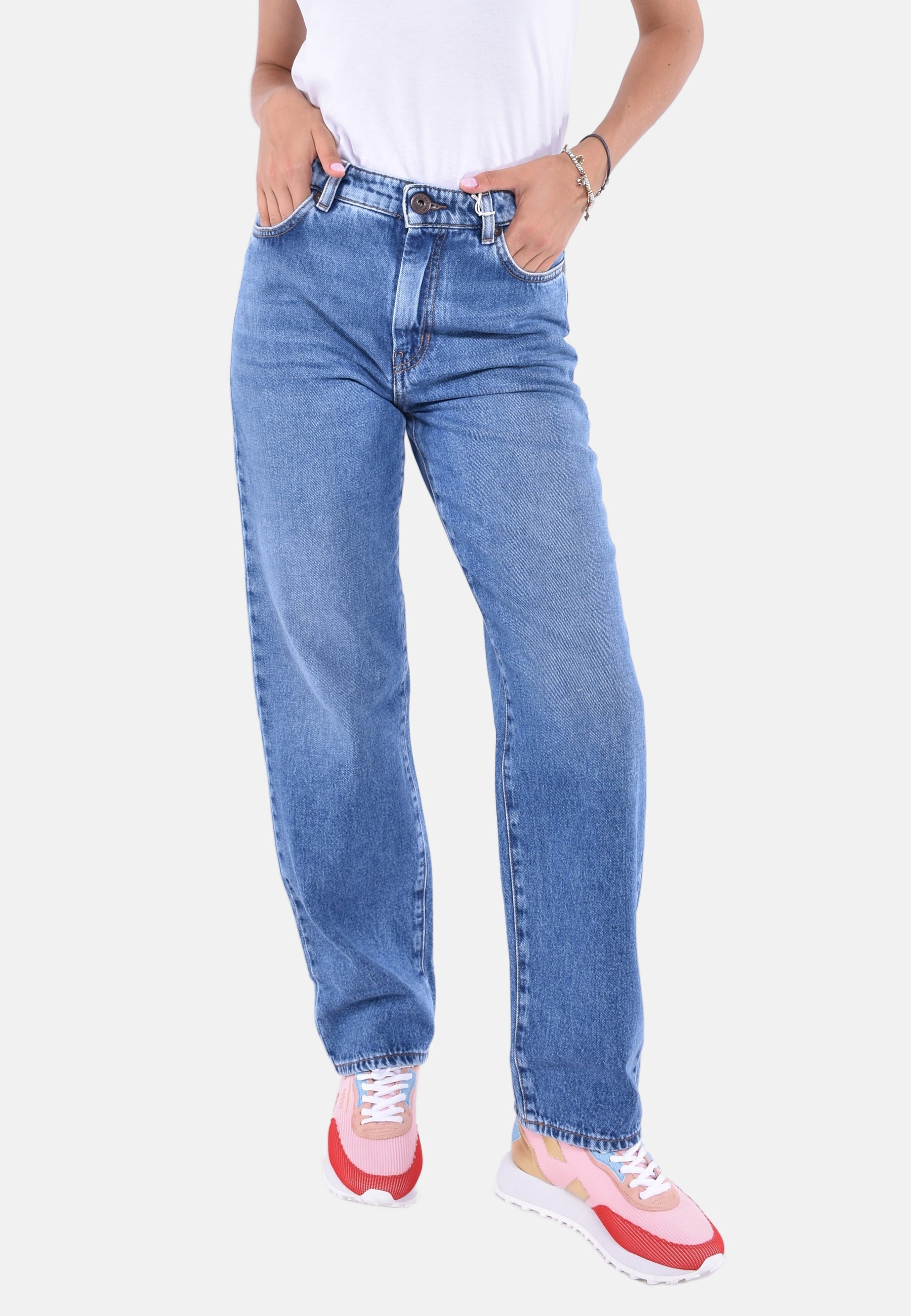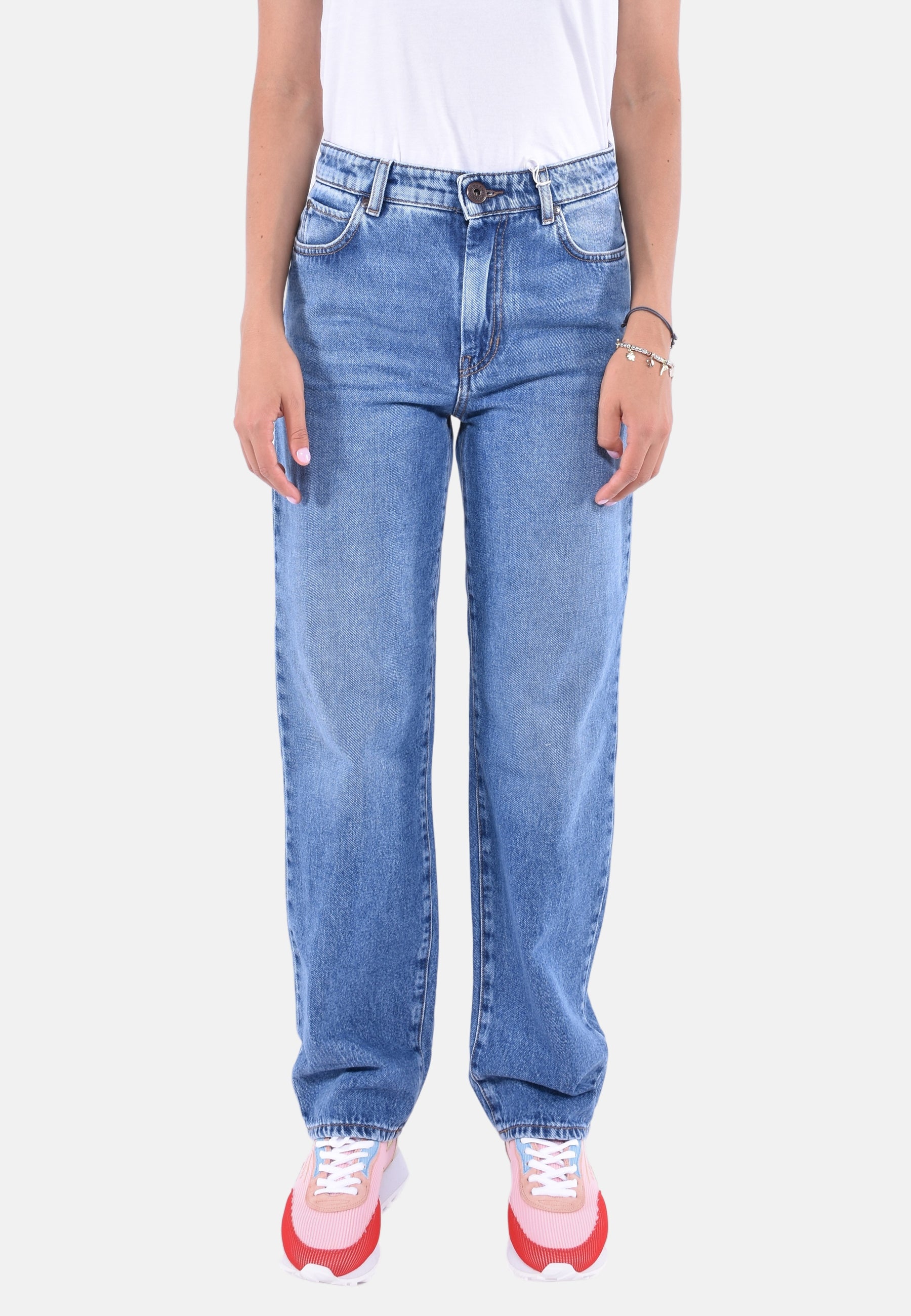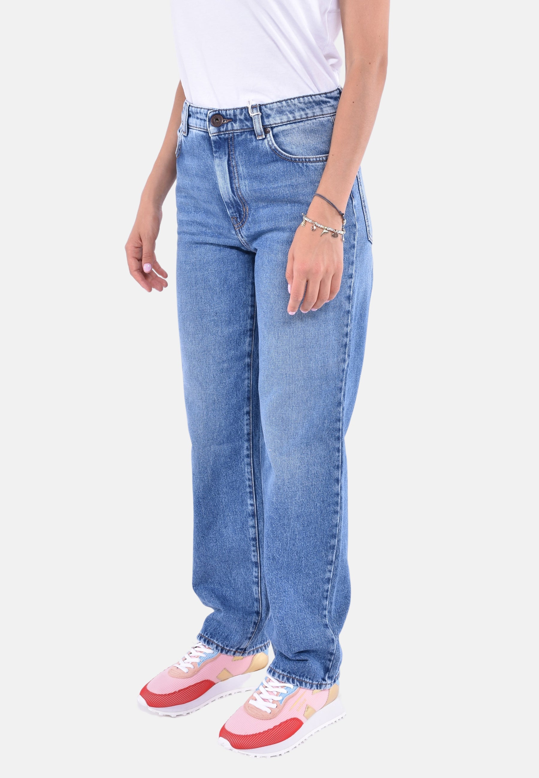 Jeans 5 tasche in denim autentico di puro cotone dall'aspetto autentico, caratterizzato da una silhouette anni '90 con gamba dritta e vestibilità morbida. Rifinito con classici rivetti in metallo e chiusura frontale con zip coperta e bottone a chiodo. Questo capo è stato realizzato con prodotti e tecniche innovativi a basso impatto ambientale. Il tessuto di questo capo è trattato utilizzando processi eco-sostenibili, senza l'utilizzo di pietra pomice, e sostituendo il tradizionale lavaggio a immersione con la tecnologia Nano Bubble, riducendo il consumo di risorse idriche. Tutti i prodotti utilizzati rispettano le direttive ambientali.