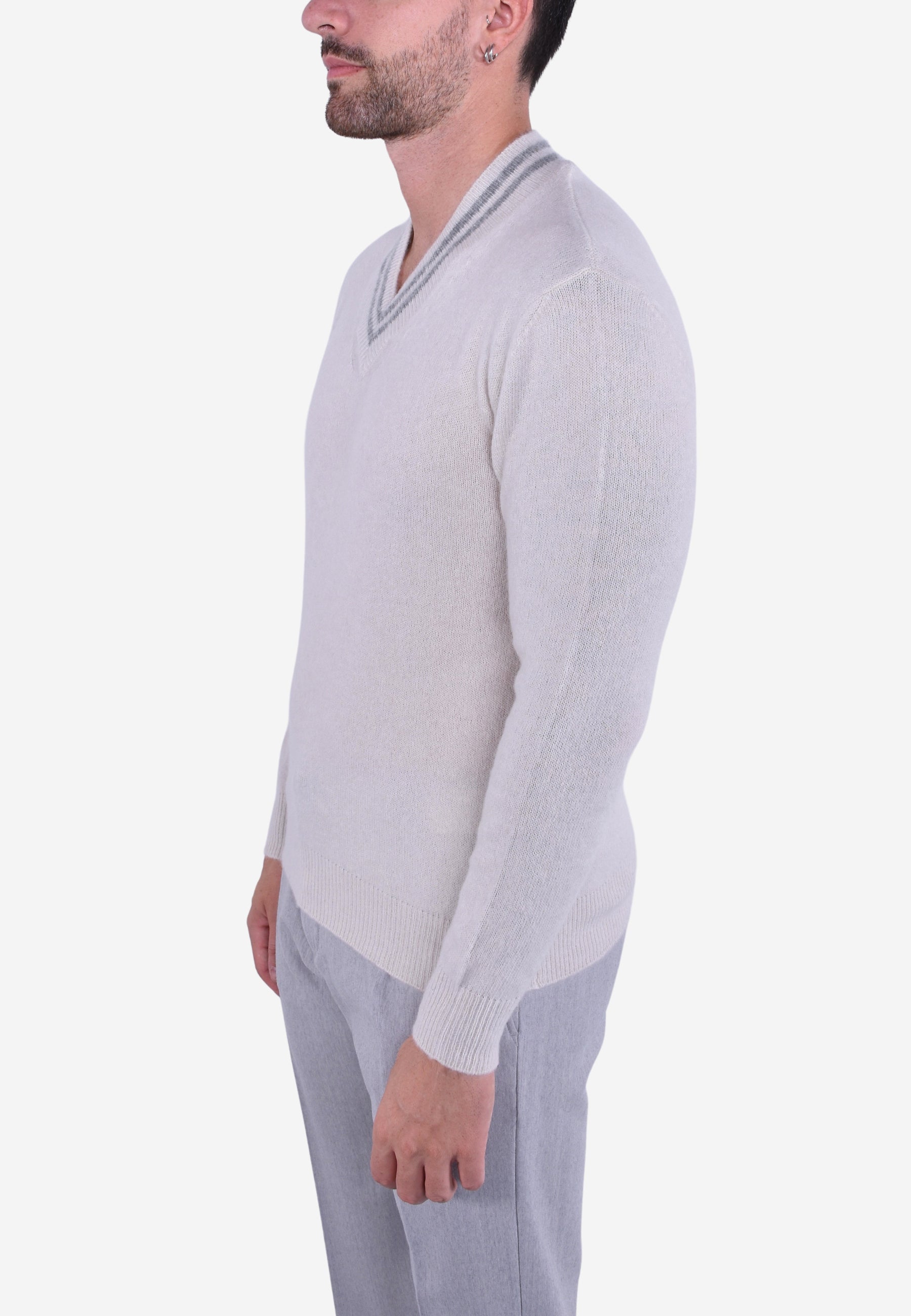 Gilet con scollo a V in pregiata lana e seta, finezza 8. Perfetto per un look casual, il capo con lavorazione a righe a contrasto sul collo e fondo, offre vestibilità regolare.