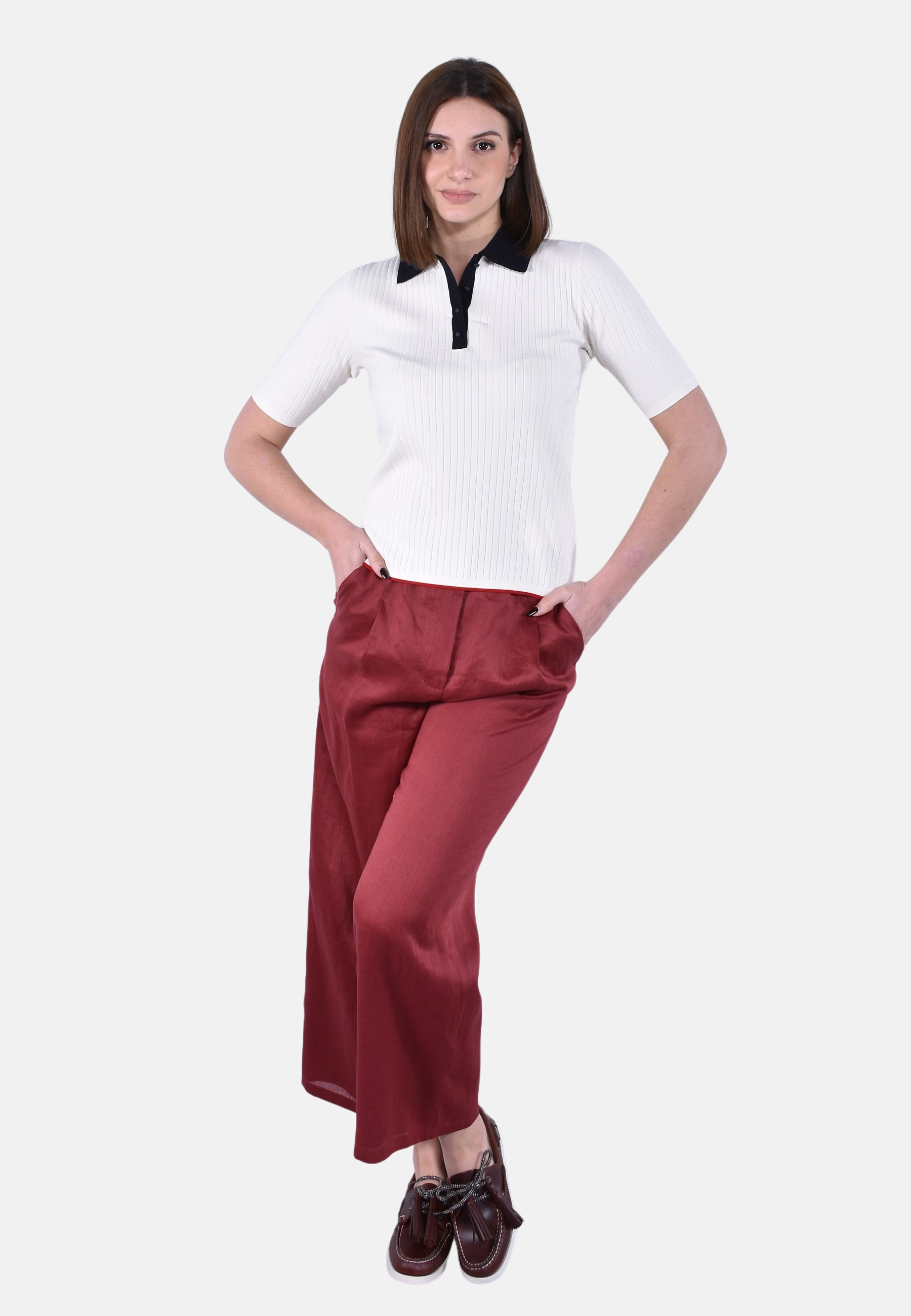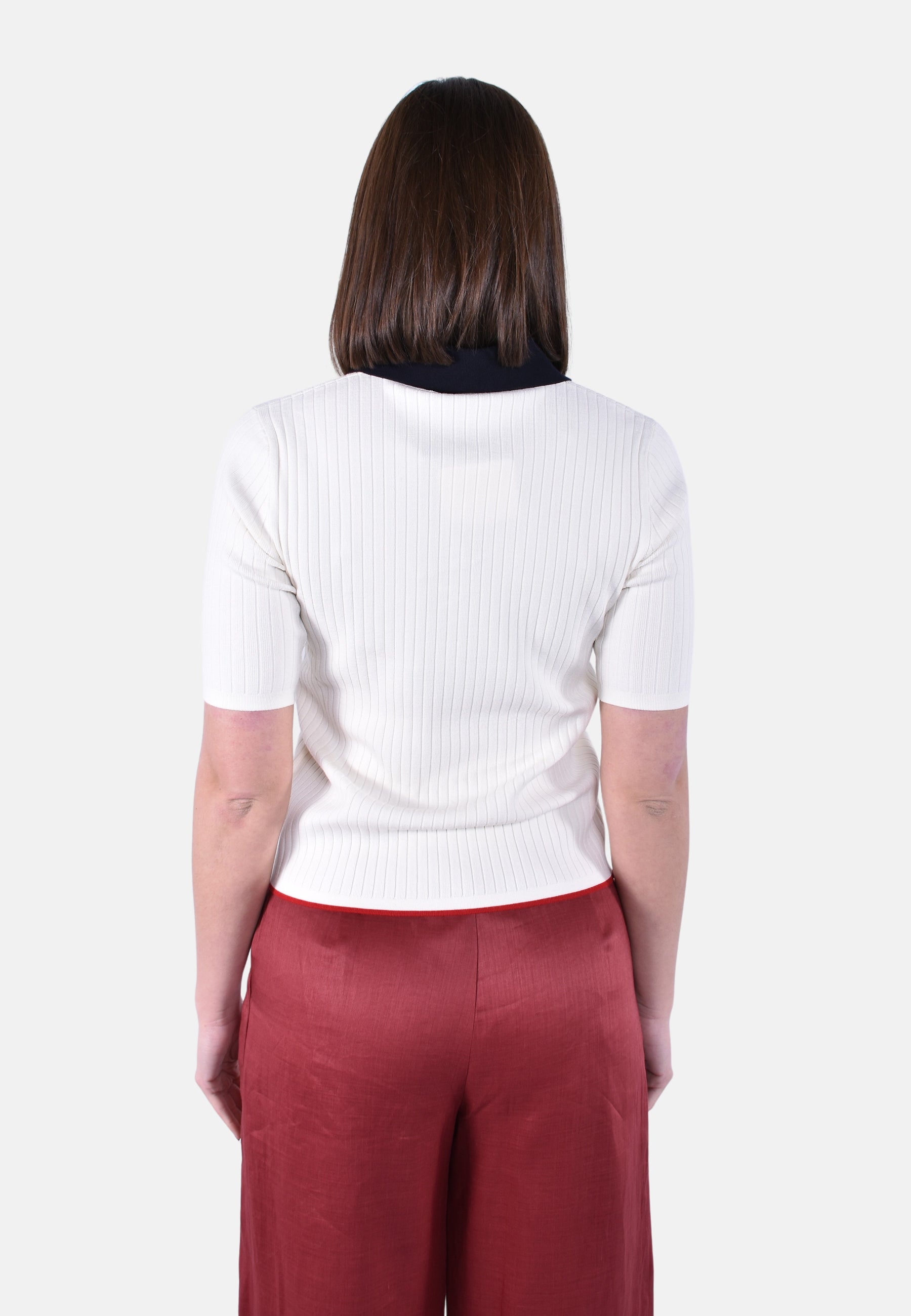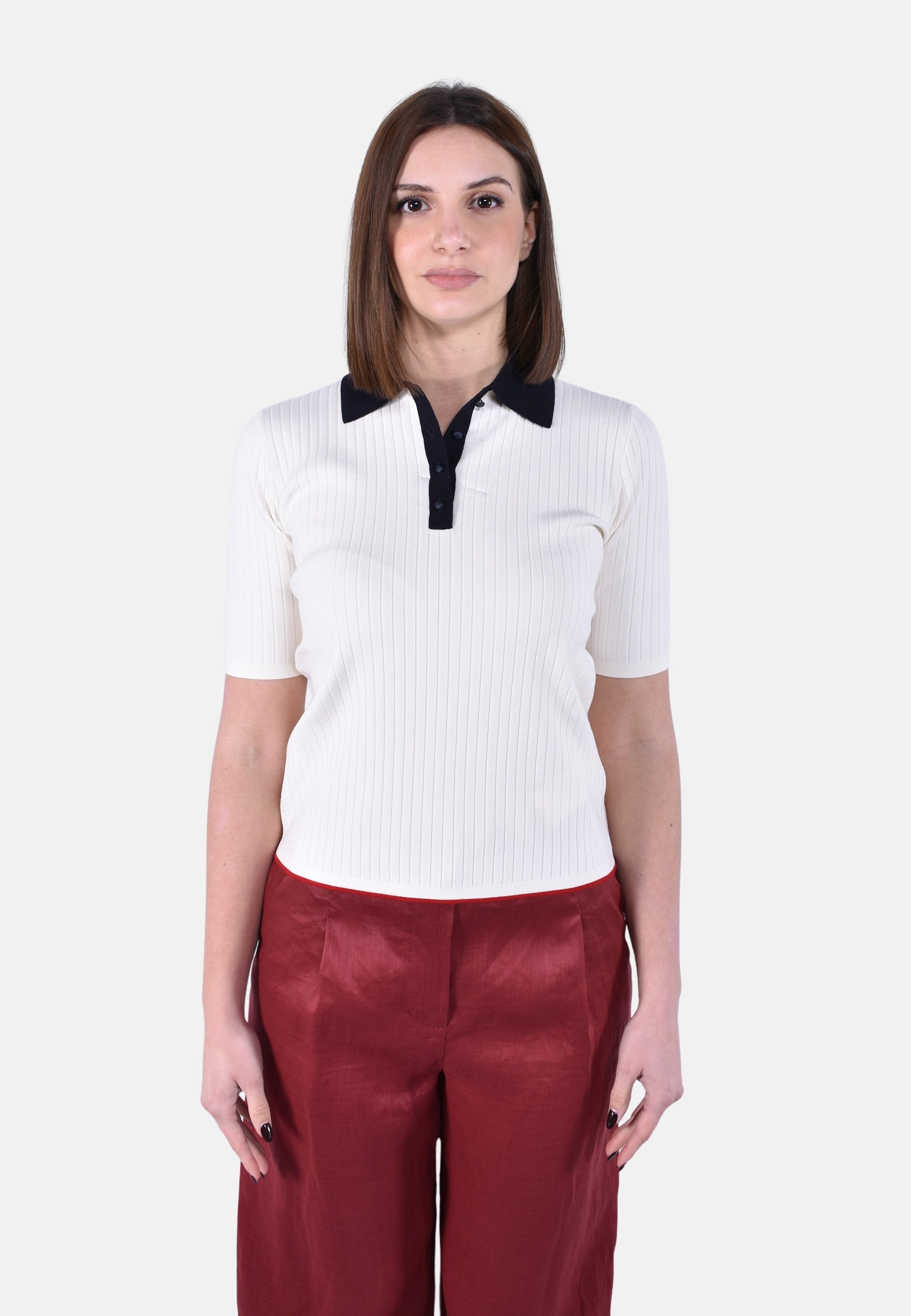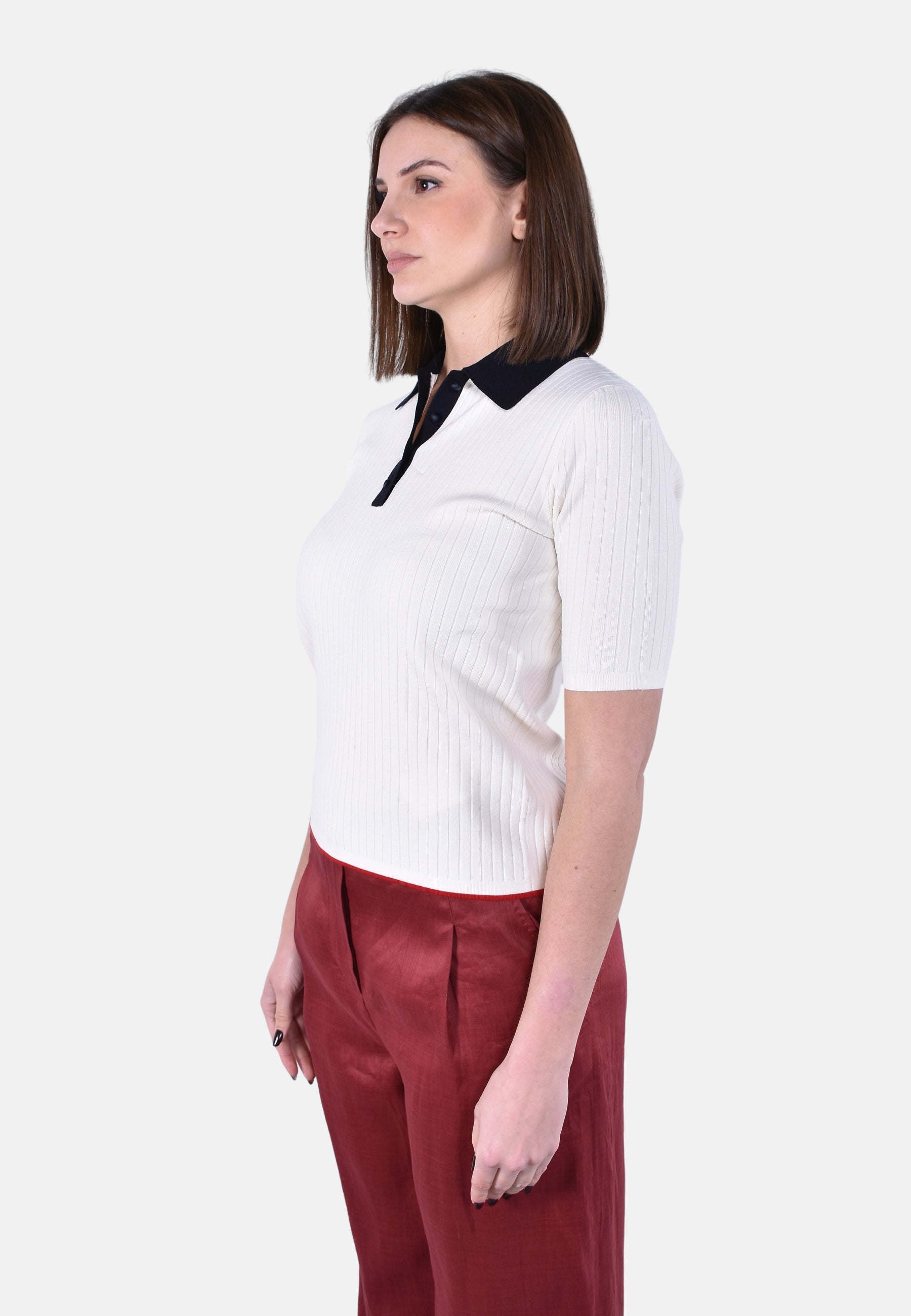 Maglia modello polo, lavorata a coste piatte.