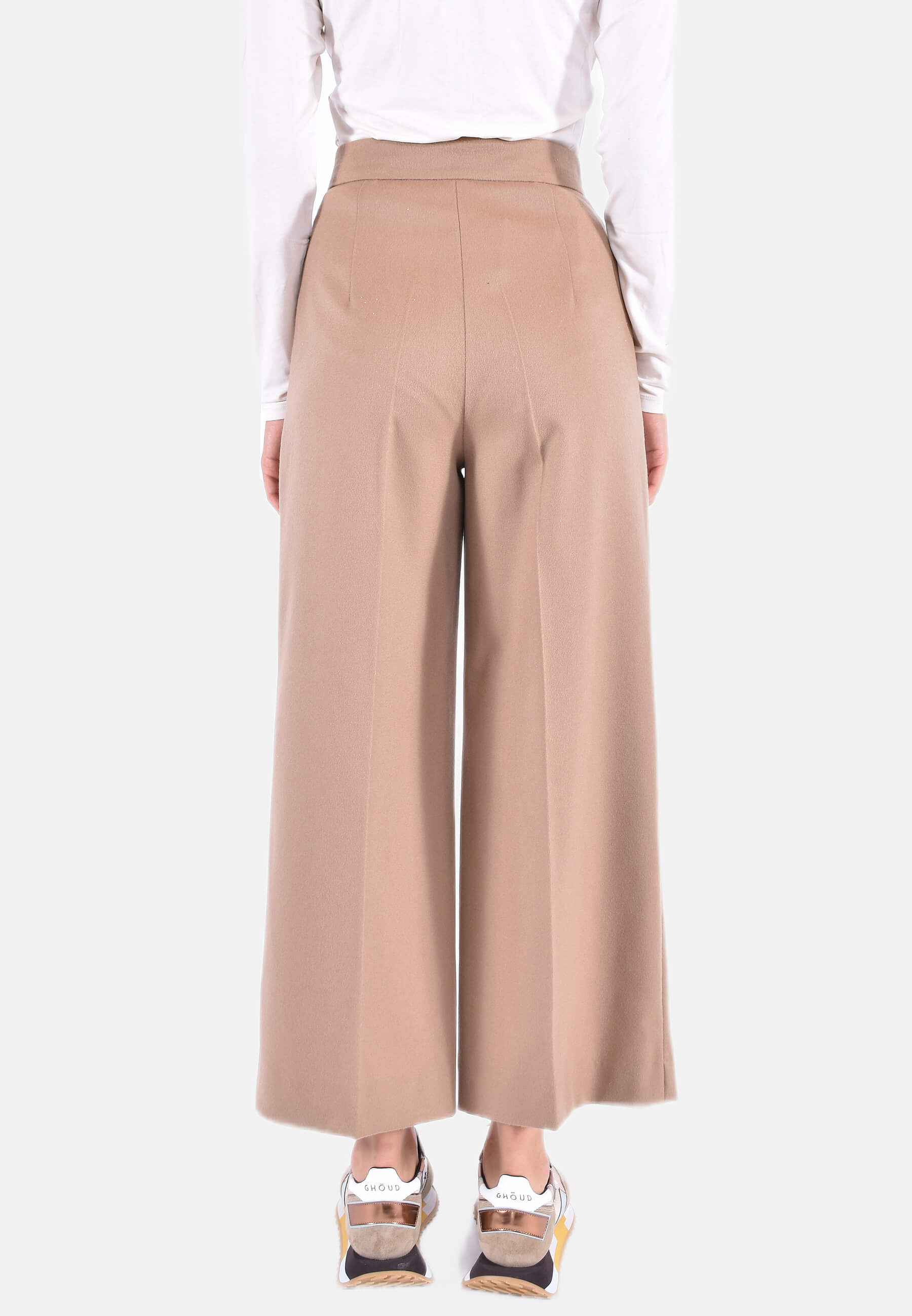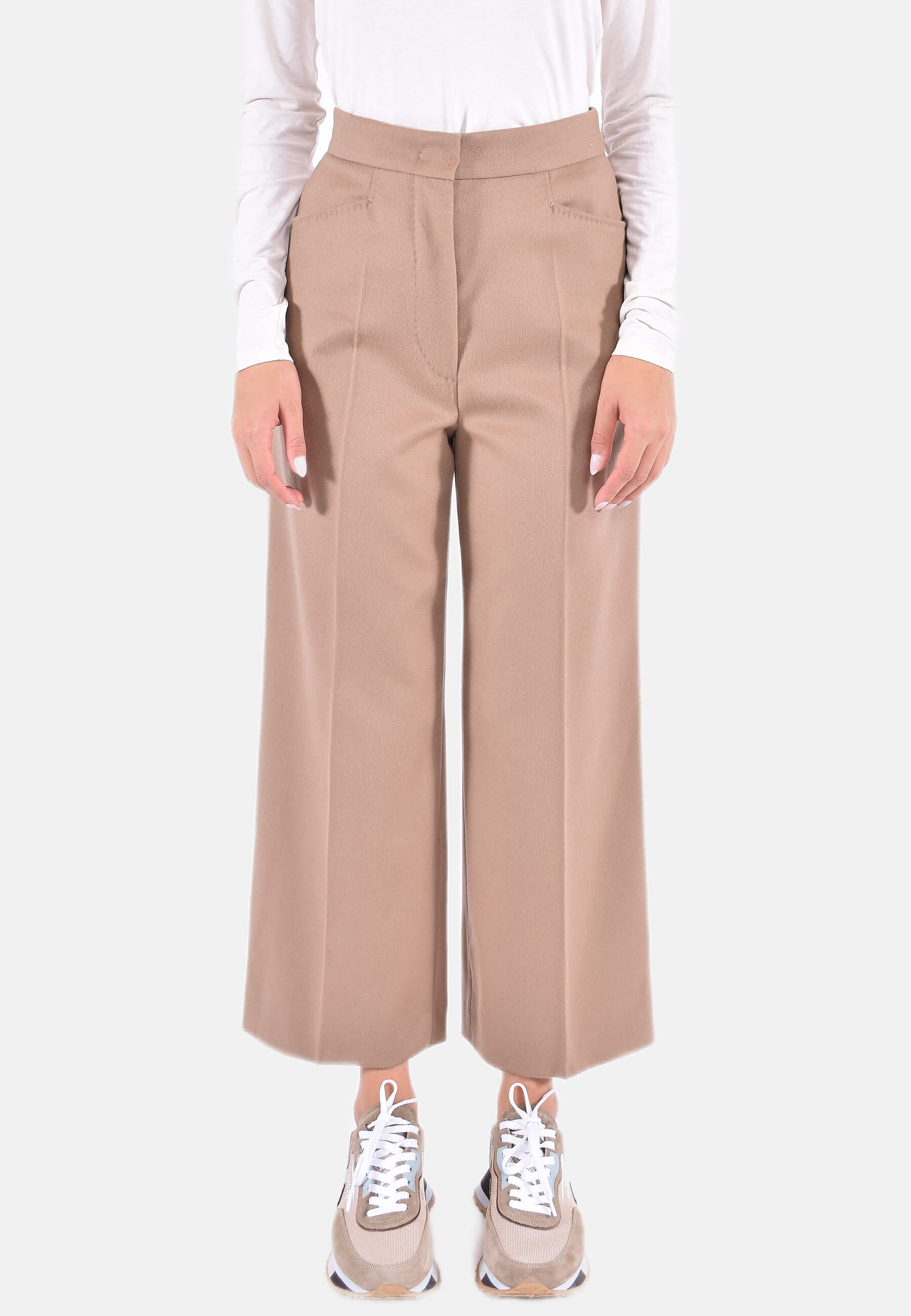 Pantalone cropped in pregiato drap di pura lana, caratterizzato da una silhouette con gamba larga, piega stirata e tasche alla francese sui fianchi. Chiusura con listino alto in vita, zip con patta e gancetto.