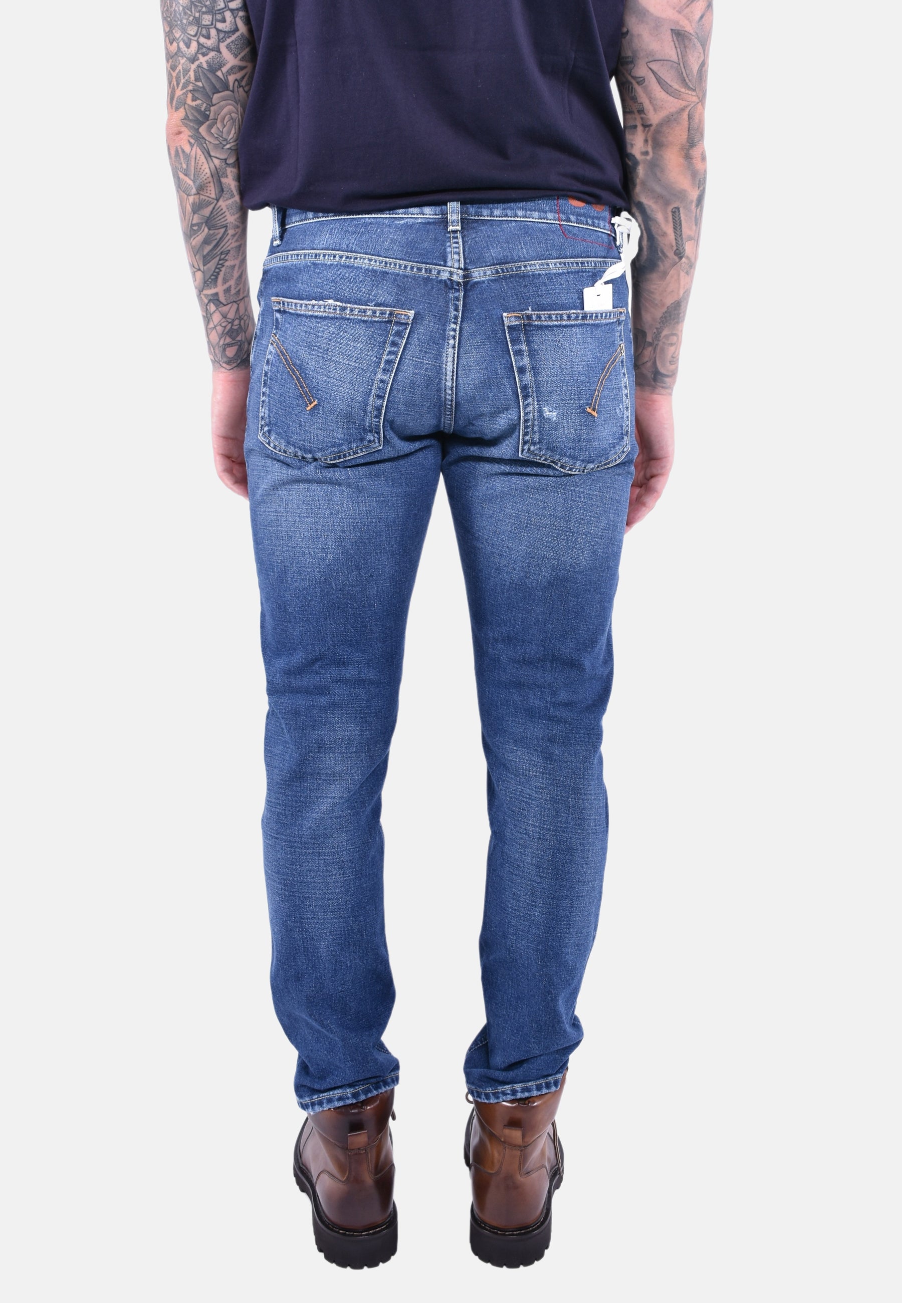 Jeans Dian 34 inches cinque tasche carrot slim fit, vita bassa. Denim stretch blu 11 oz. Lavaggio medio pulito. Logo Dondup. Made in Italy