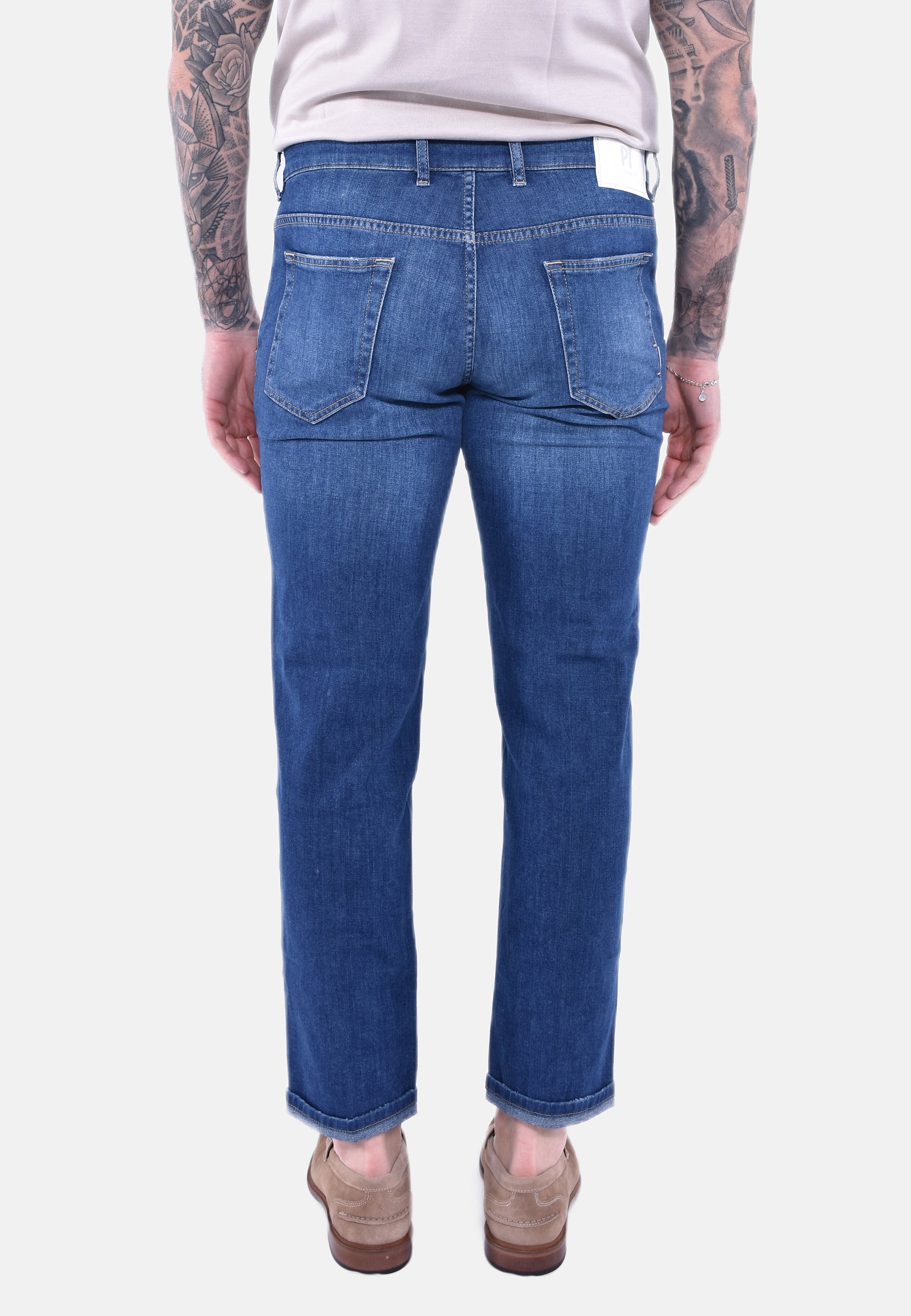 Jeans in denim soft touch light stretch, una tela morbida, leggera e piacevole da indossare, con lavaggio caratterizzato da evidenti schiariture localizzate che definiscono il design.