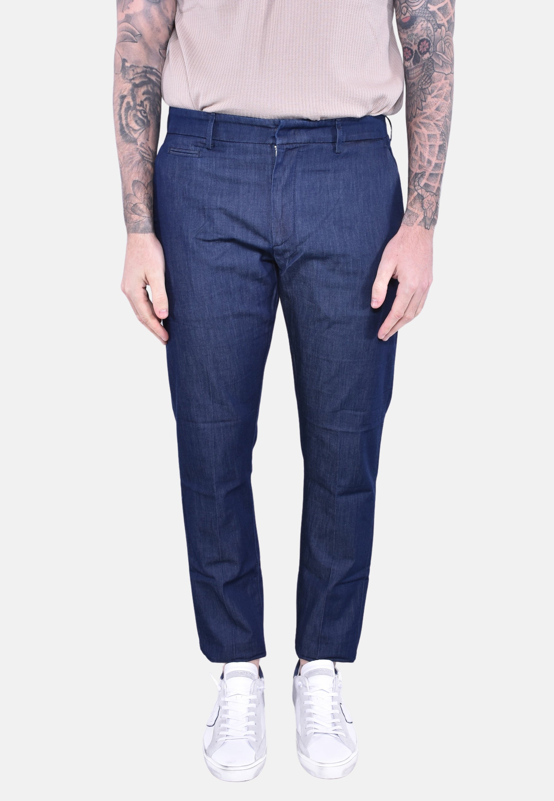 Pantaloni Joe carrot chino, vita regolare, money pocket sul davanti, una tasca a filetto posteriore ed una tasca con pattina. Denim fisso leggero blu 5.50 oz. Lavaggio scuro pulito. Logo Dondup. Made in Italy