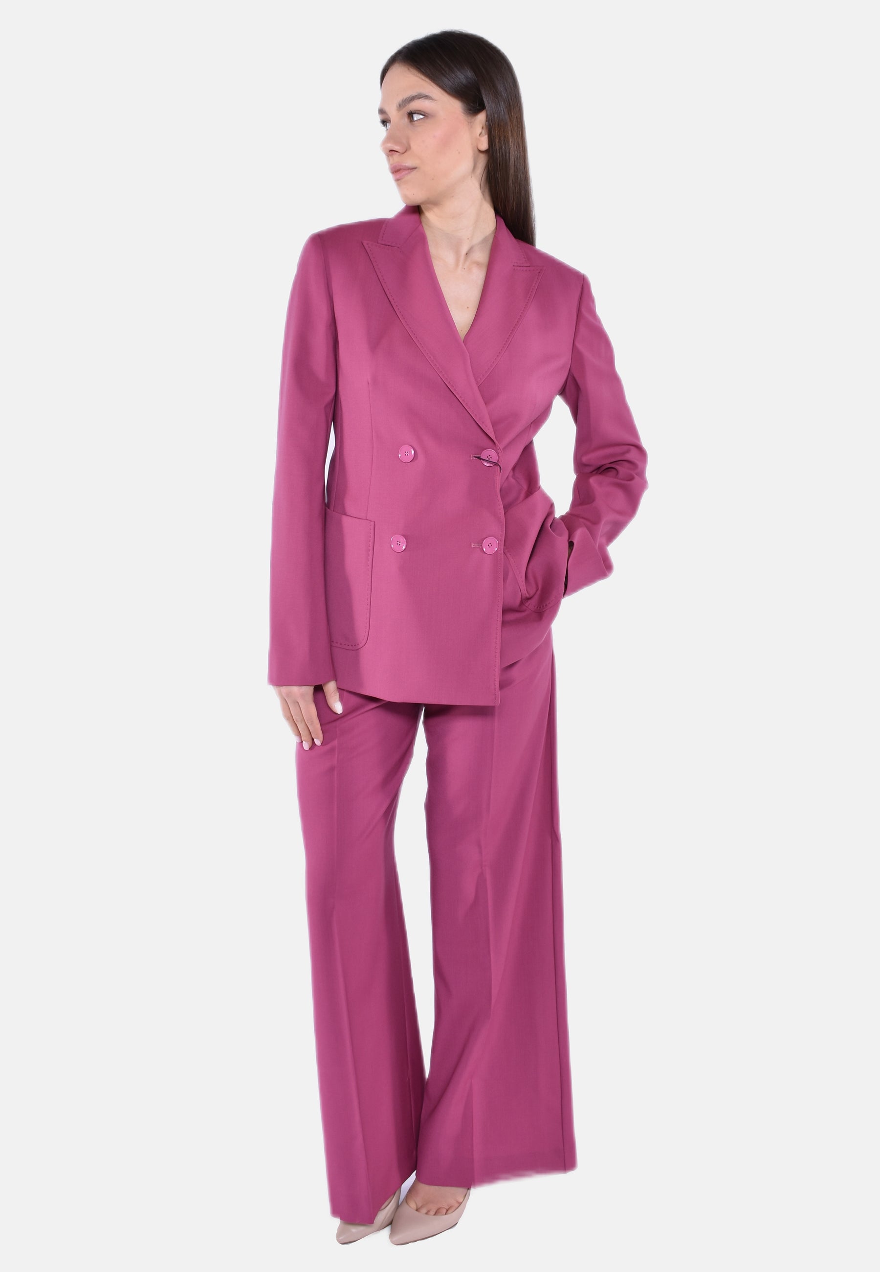 Pantalone a palazzo realizzato in pregiata e leggera tela di pura lana stretch, caratterizzato da una silhouette con gamba larga e piega stirata. Il modello è completato da tasche alla francese sui fianchi e tasche a filetto con bottone sul retro. Chiusura con listino alto in vita, zip con patta e gancetto.