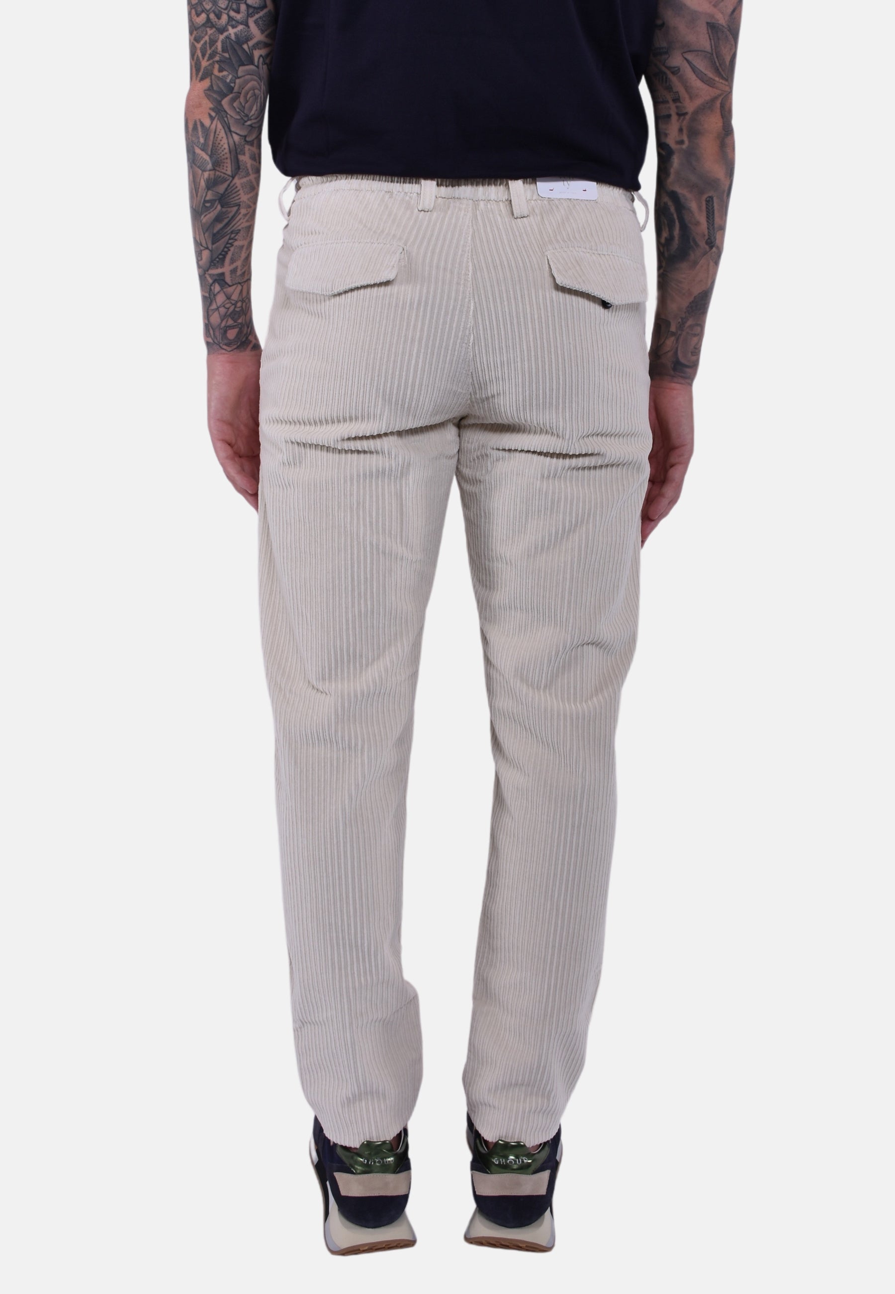 Pantalone jogger in morbido vellute a coste stretch, vestibilità morbida con coulisse in contrasto color grigio e fettuccine in pelle testa di moro. Pences a goccia e chiusura con bottone.