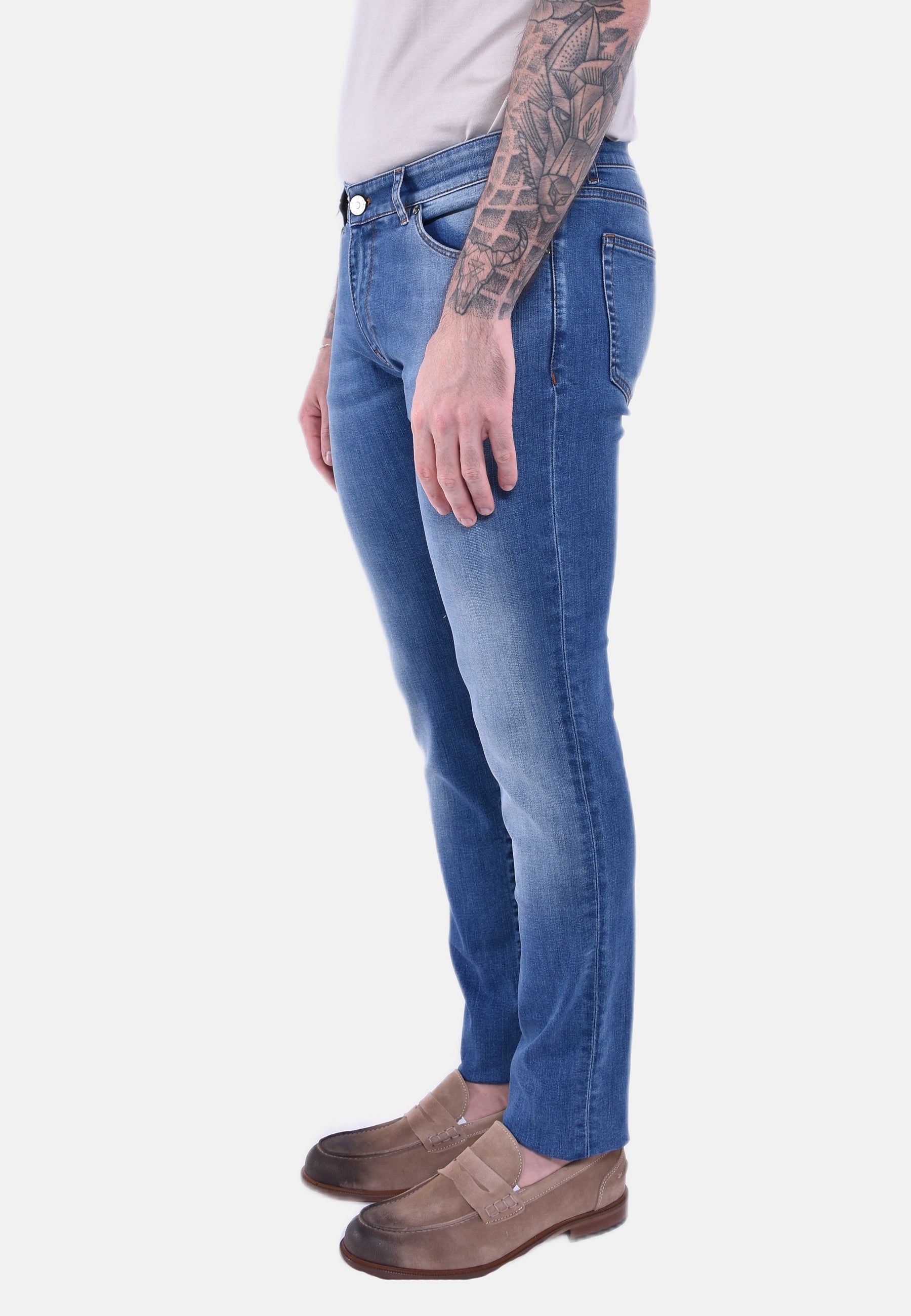 Jeans in denim soft touch stretch, una tela morbida, leggera e piacevole da indossare, con lavaggio chiaro e leggere schiariture.Con cinque tasche, vita bassa e linea slim, hanno un aspetto versatile da interpretare in tutti i tuoi look casual.