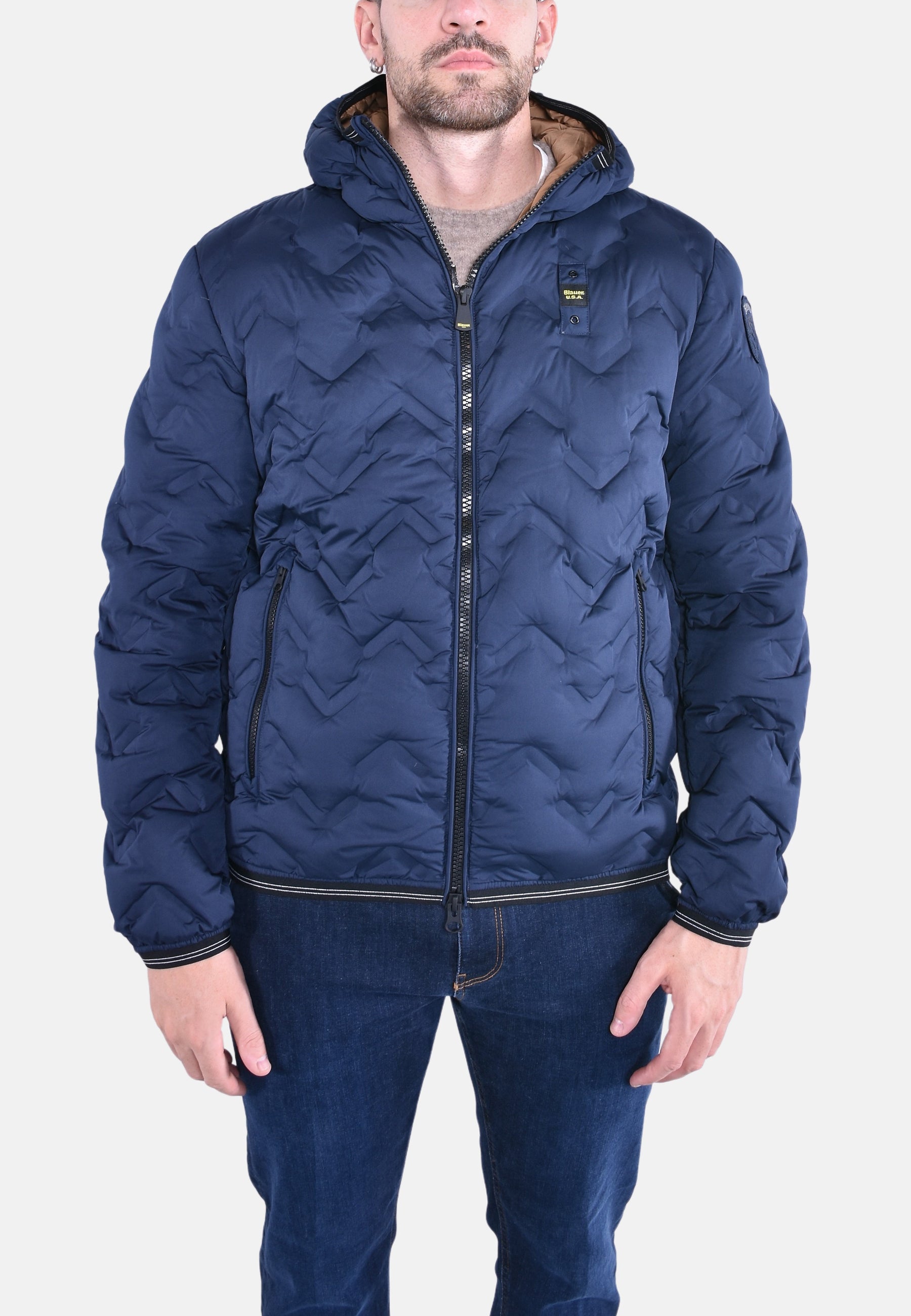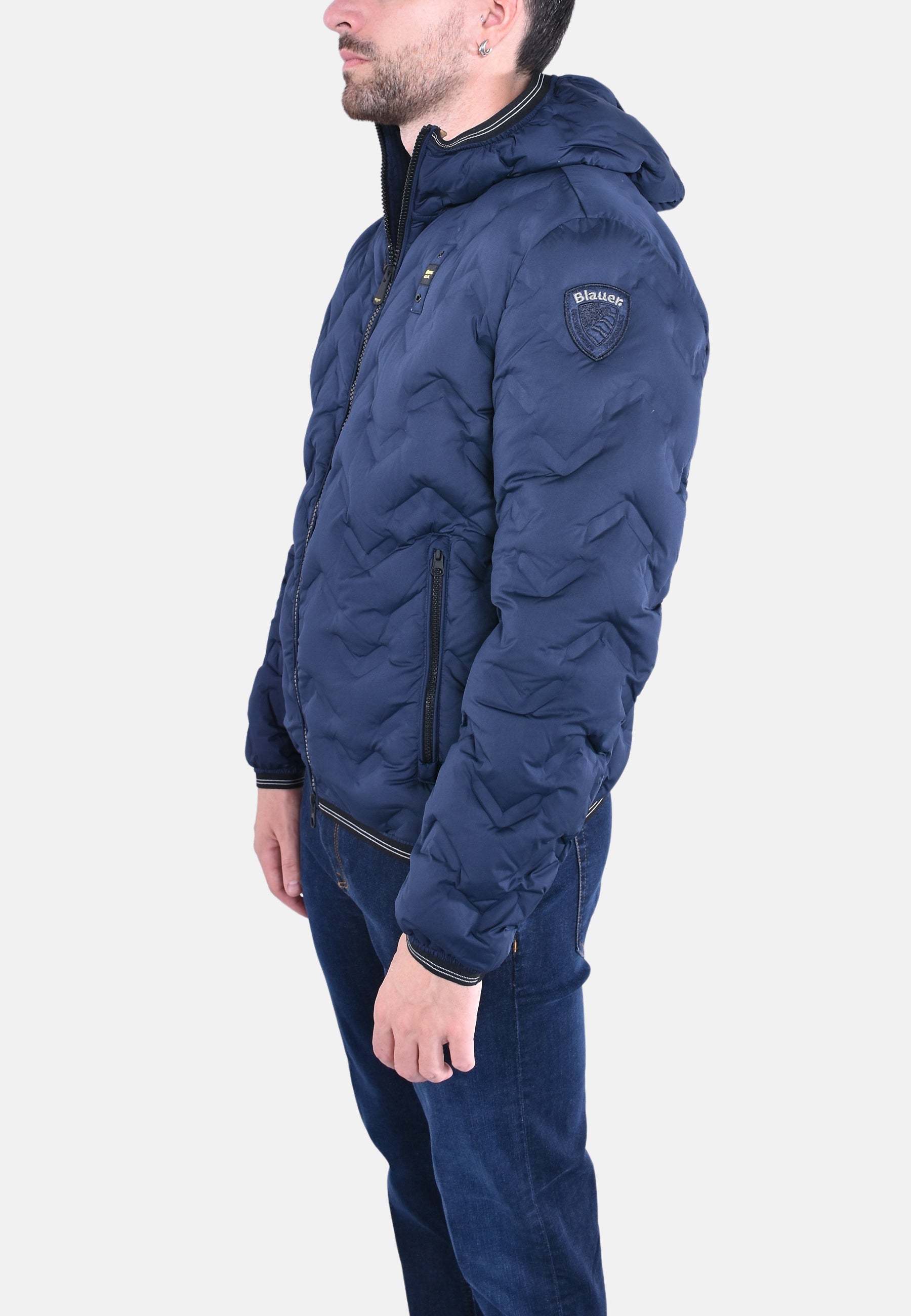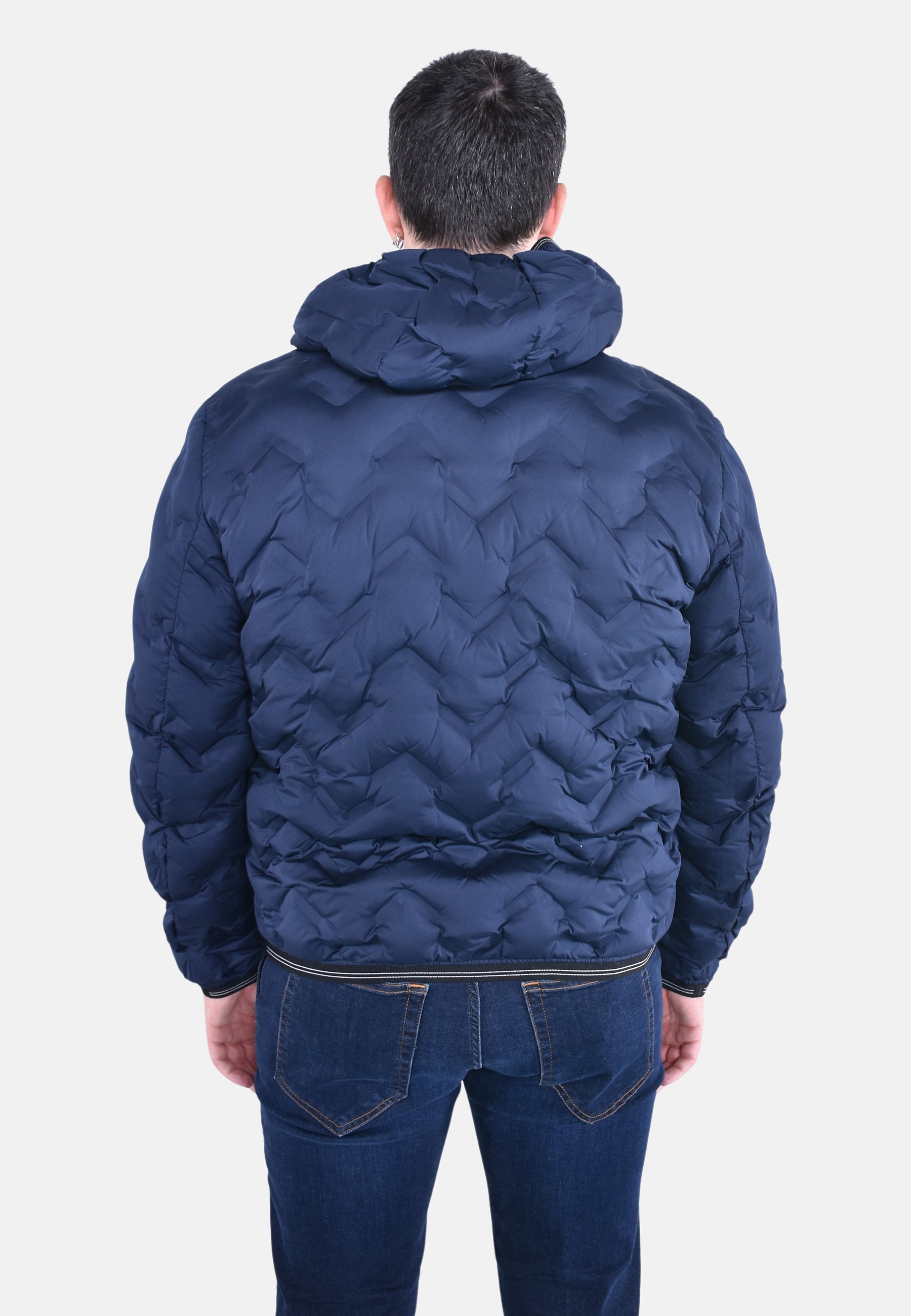 Piumino con cappuccio fisso e profilo dall’aspetto aderente e increspato. Cuciture nastrate ad angoli che dona un tocco innovativo e dinamico.
