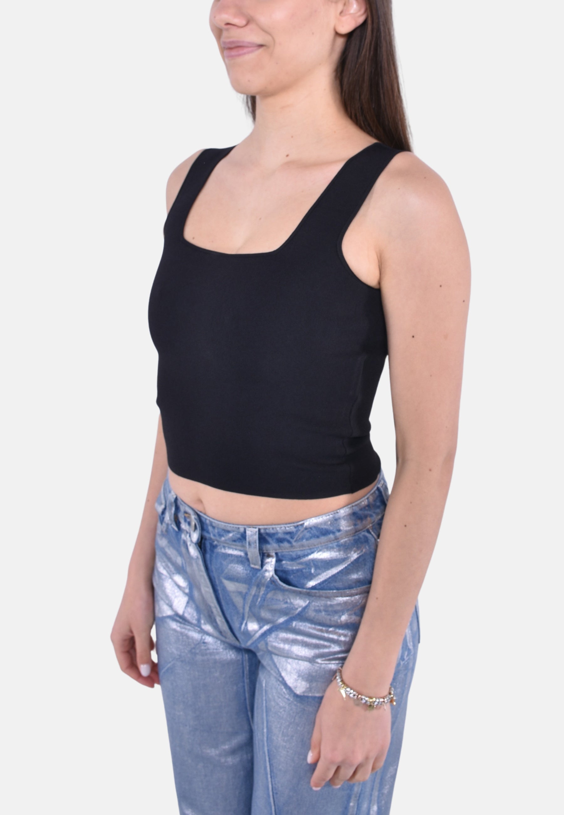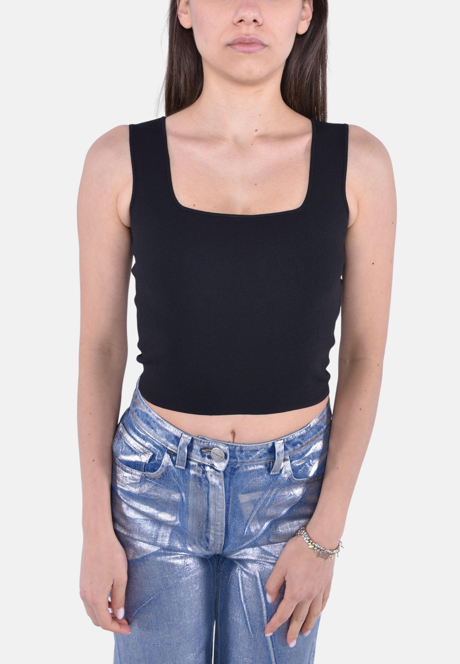 Top crop in filato di viscosa, impreziosito da una lavorazione jacquard. Modello dalla linea aderente, rifinita con con ampio scollo quadrato e profili in tubolare.