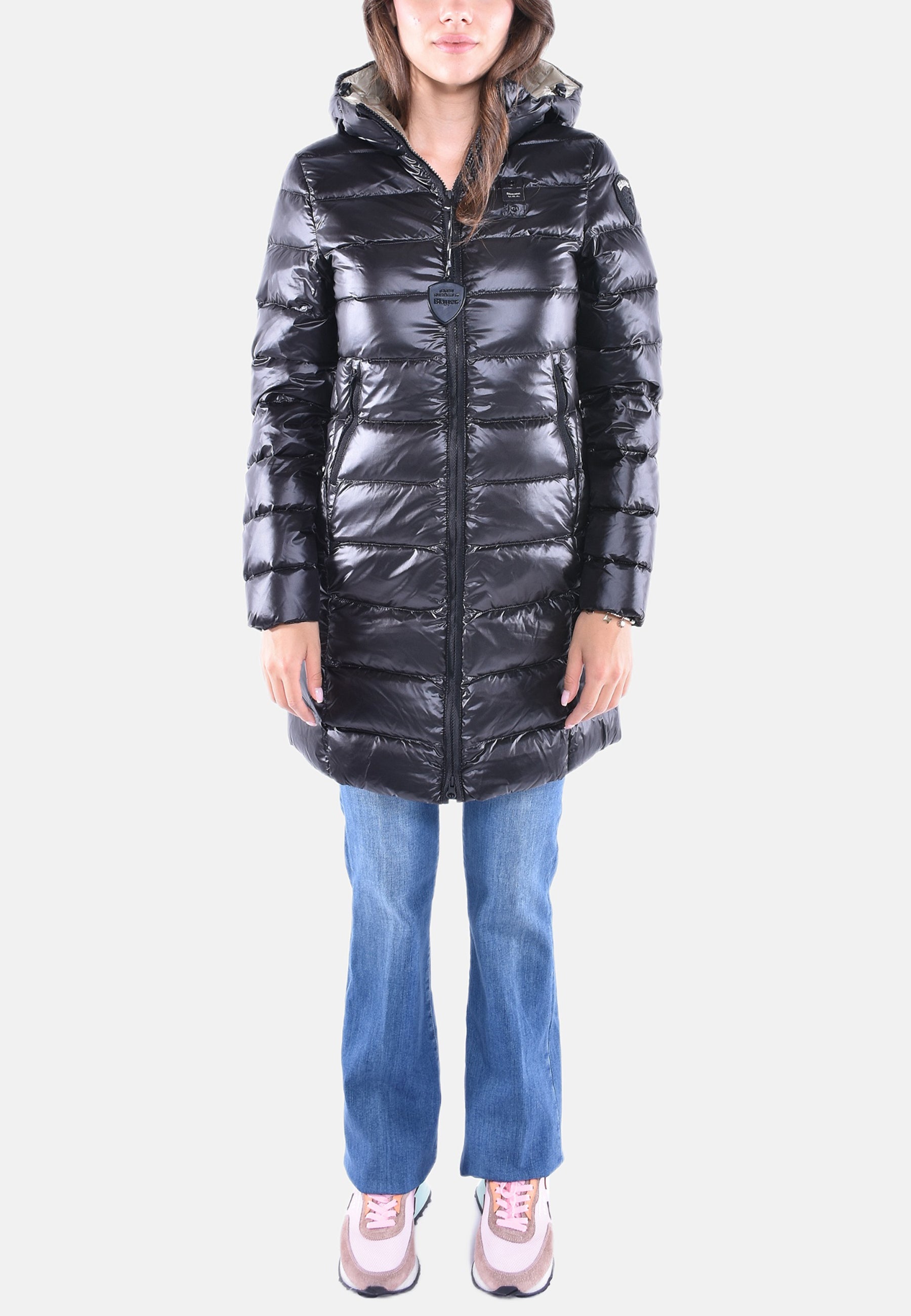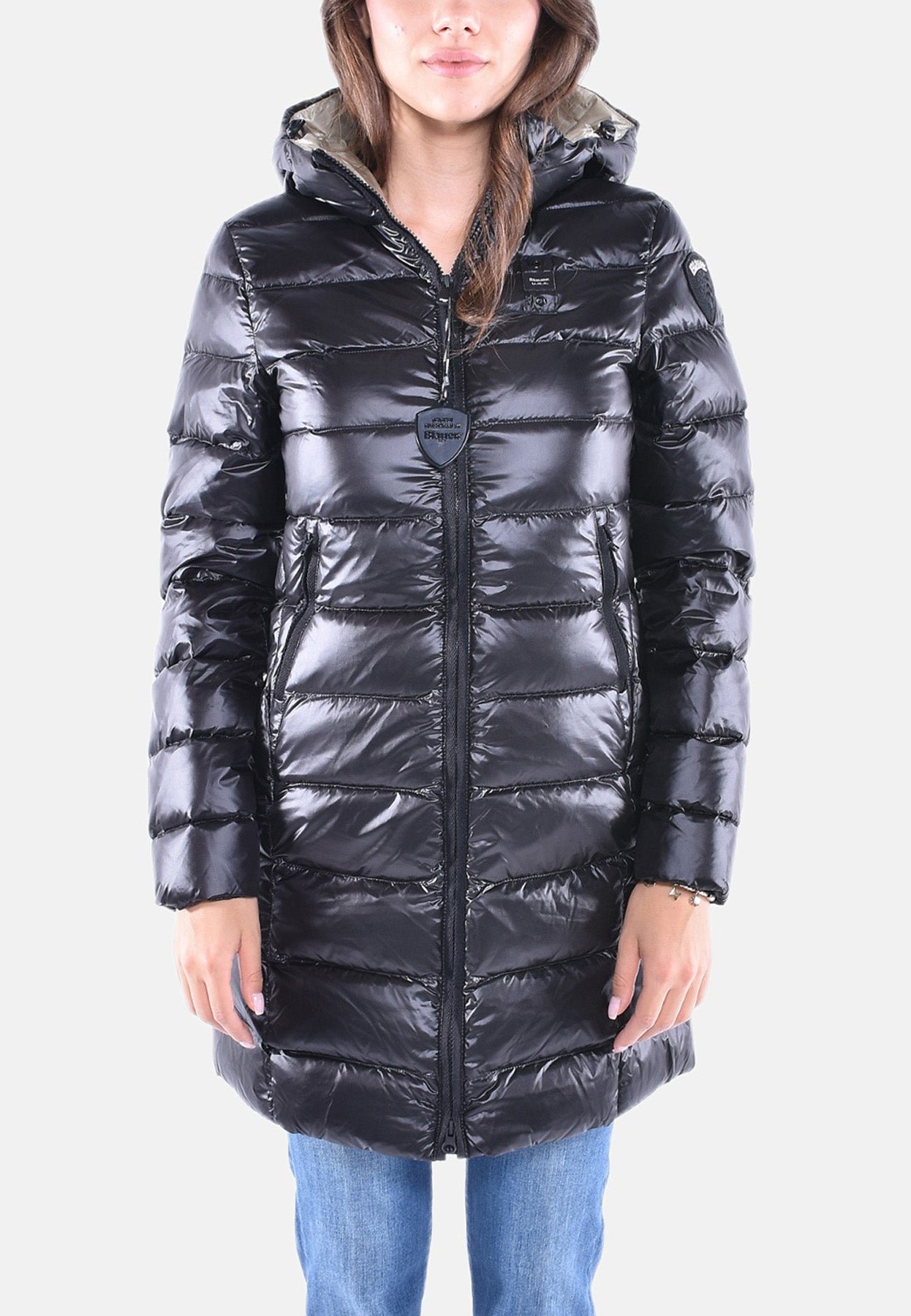 Piumino lungo donna leggermente svasato in nylon cangiante imbottito piuma leggera e cappuccio fisso con coulisse.