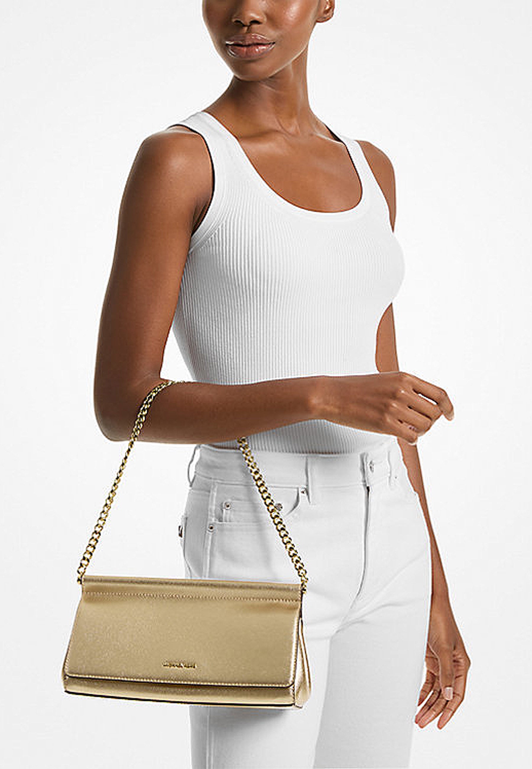 Ecco l'accessorio per eccellenza per le uscite serali: la nostra pochette Carmine. Realizzata in pelle goffrata metallizzata, questo stile di ispirazione vintage è ancorato da un'audace tracolla a maglie che può essere indossata sulla spalla o infilata all'interno per essere portata a mano. Abbina i tuoi gioielli all'hardware per un look glamour.