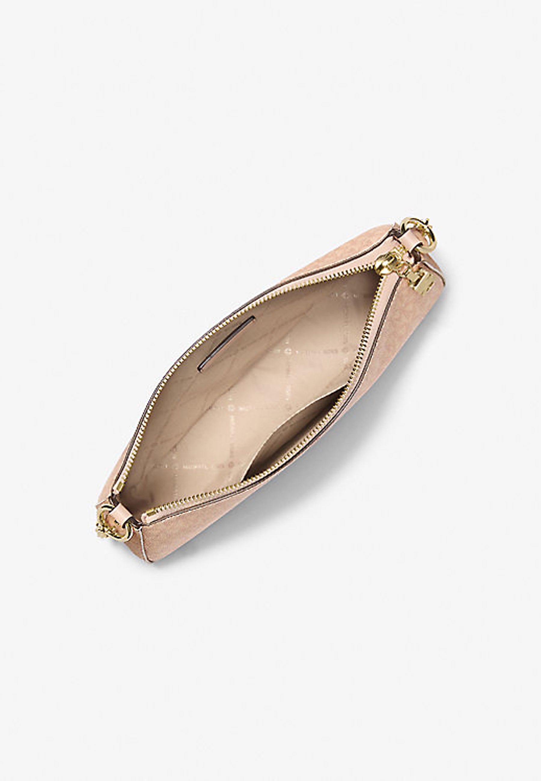 Caratterizzata dell'esclusiva stampa logo, questa piccola pochette è l'ideale per viaggiare leggeri. Con sufficiente spazio per telefono, portacarte e occhiali da sole, la silhouette compatta presenta una tracolla a catena in tonalità oro per un look glamour.