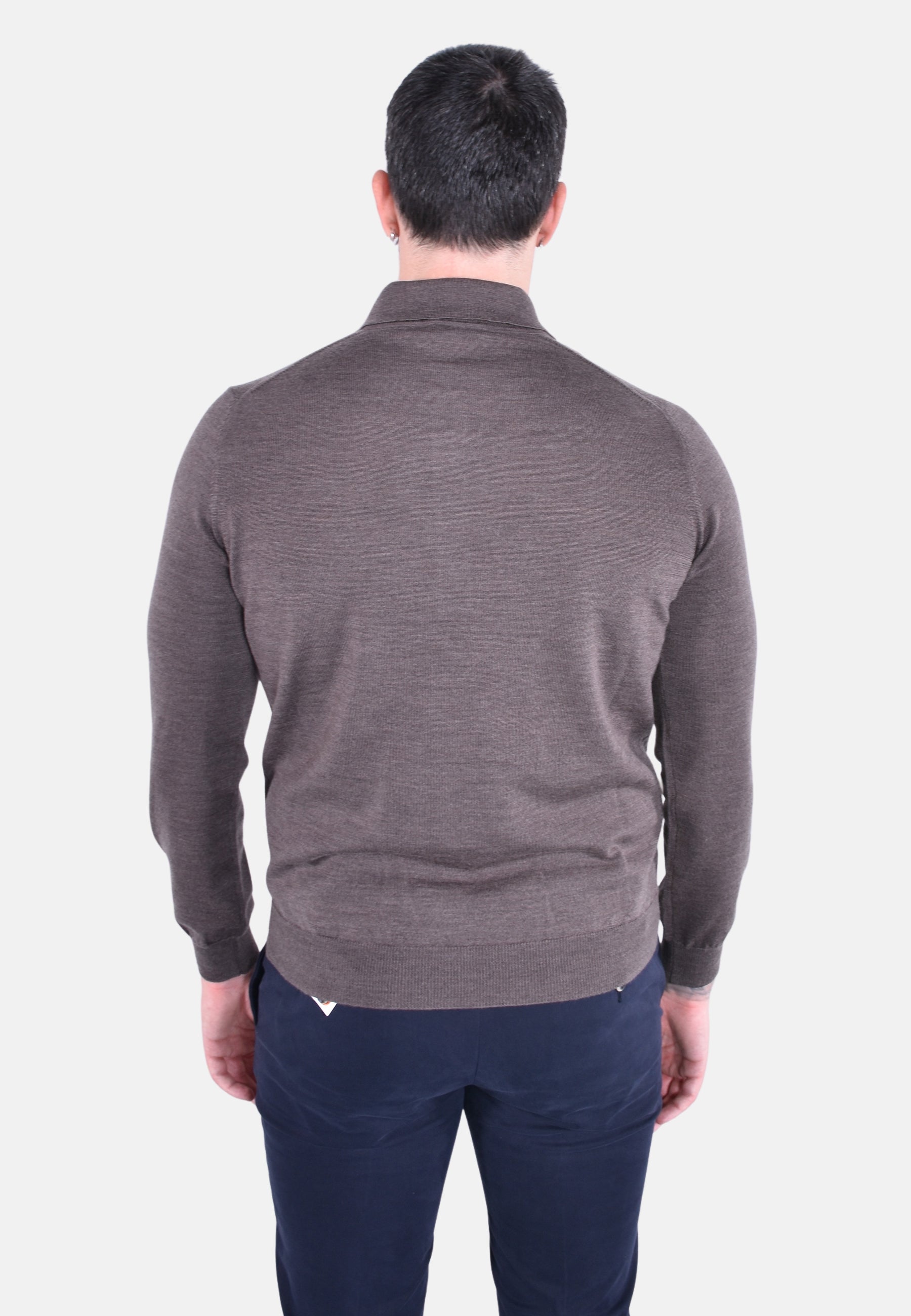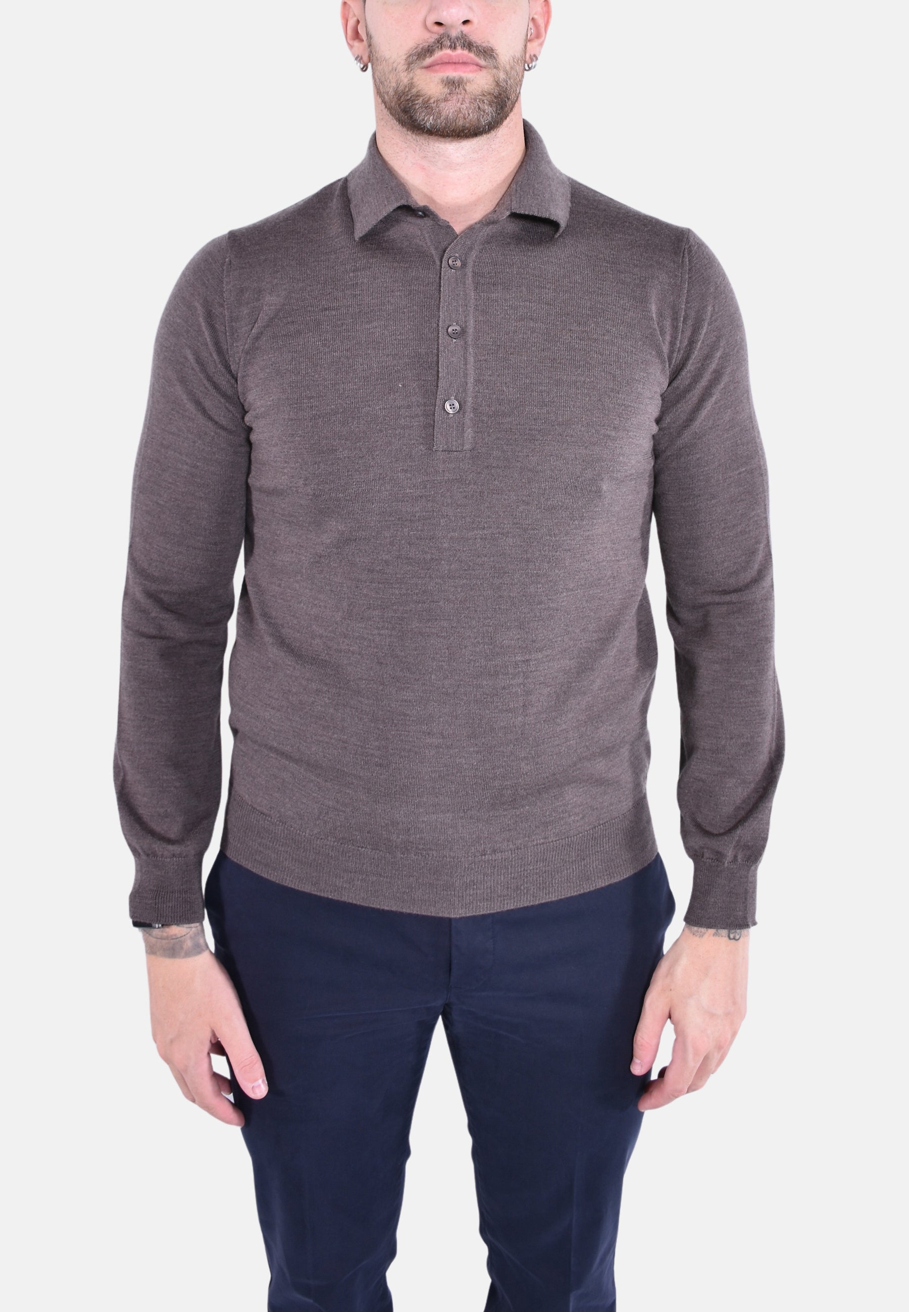 Polo senza bottoni in maglia rasata, realizzata in pura lana merino extrafine finezza 14. Vestibilità regolare con orlo, polsini e colletto a coste.